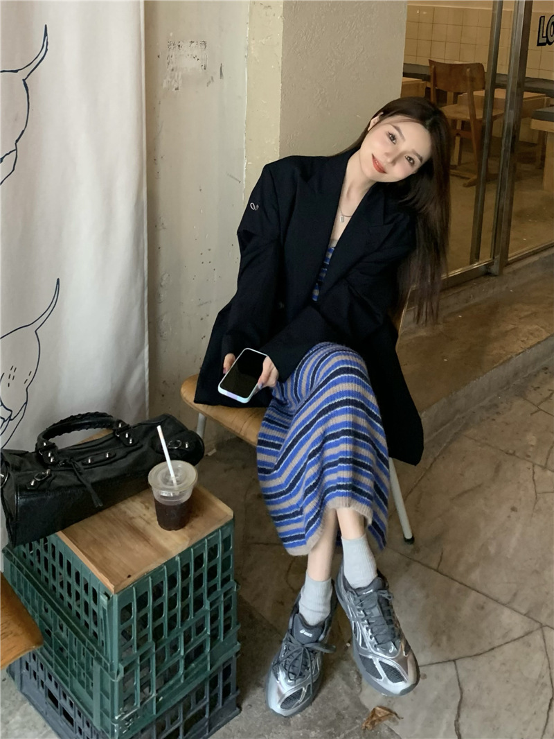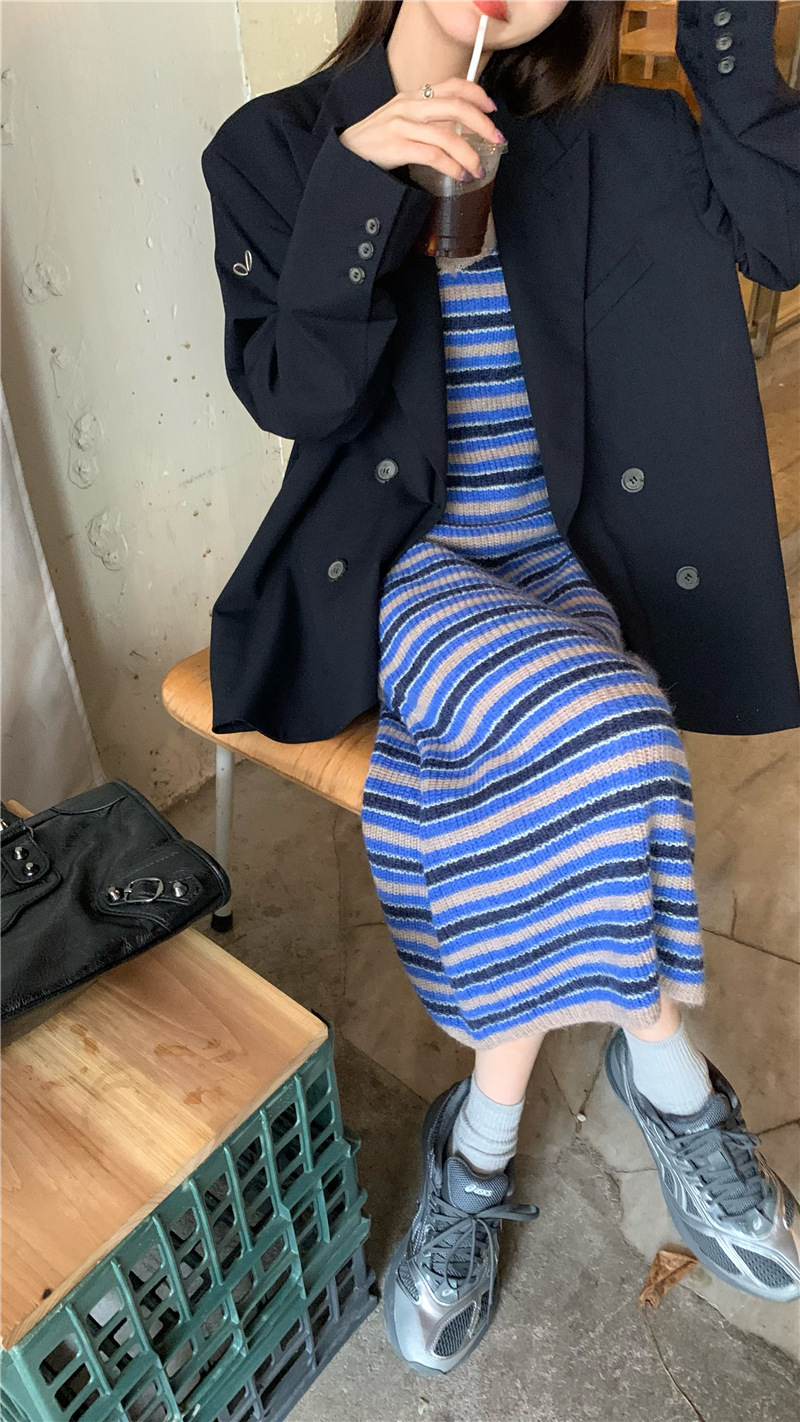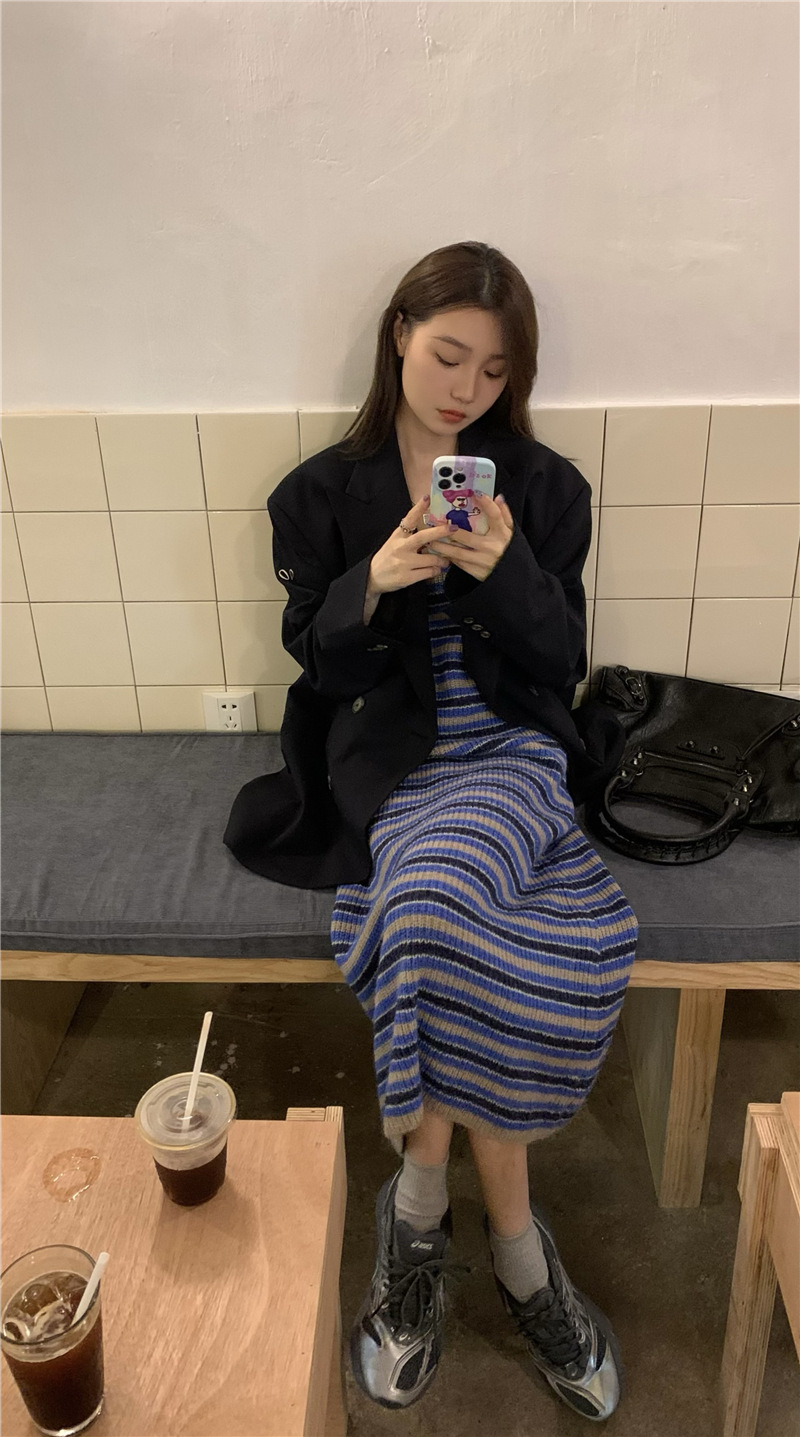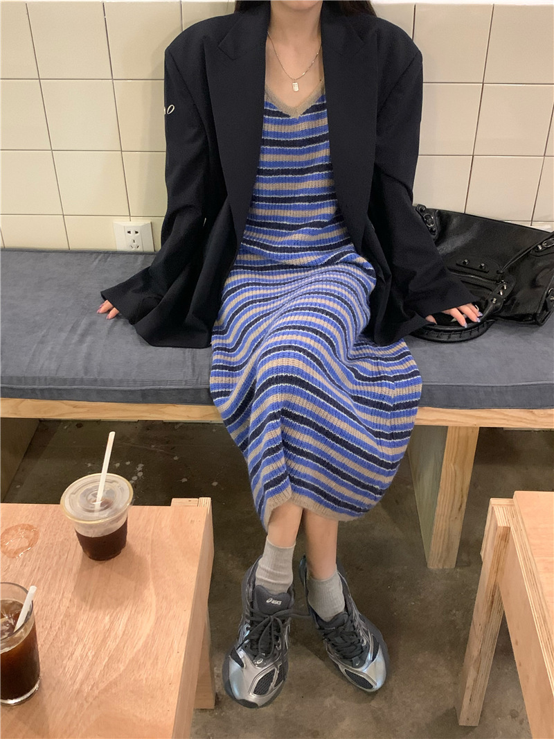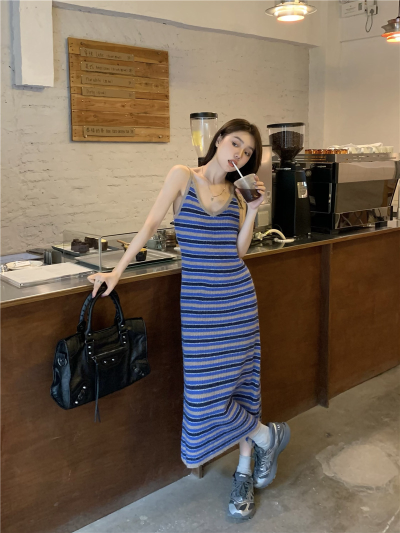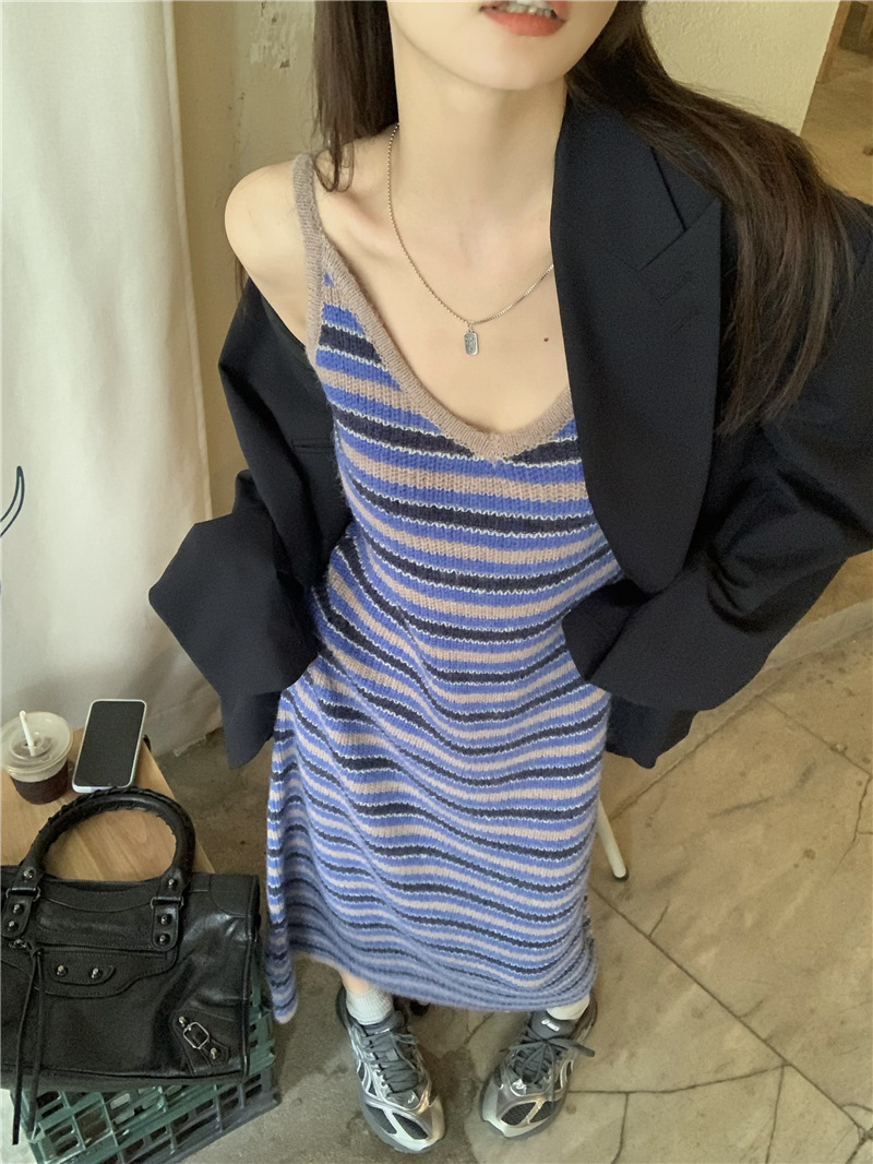 实拍修身百搭设计感撞色条纹针织连衣裙女早秋中长款吊带裙43433