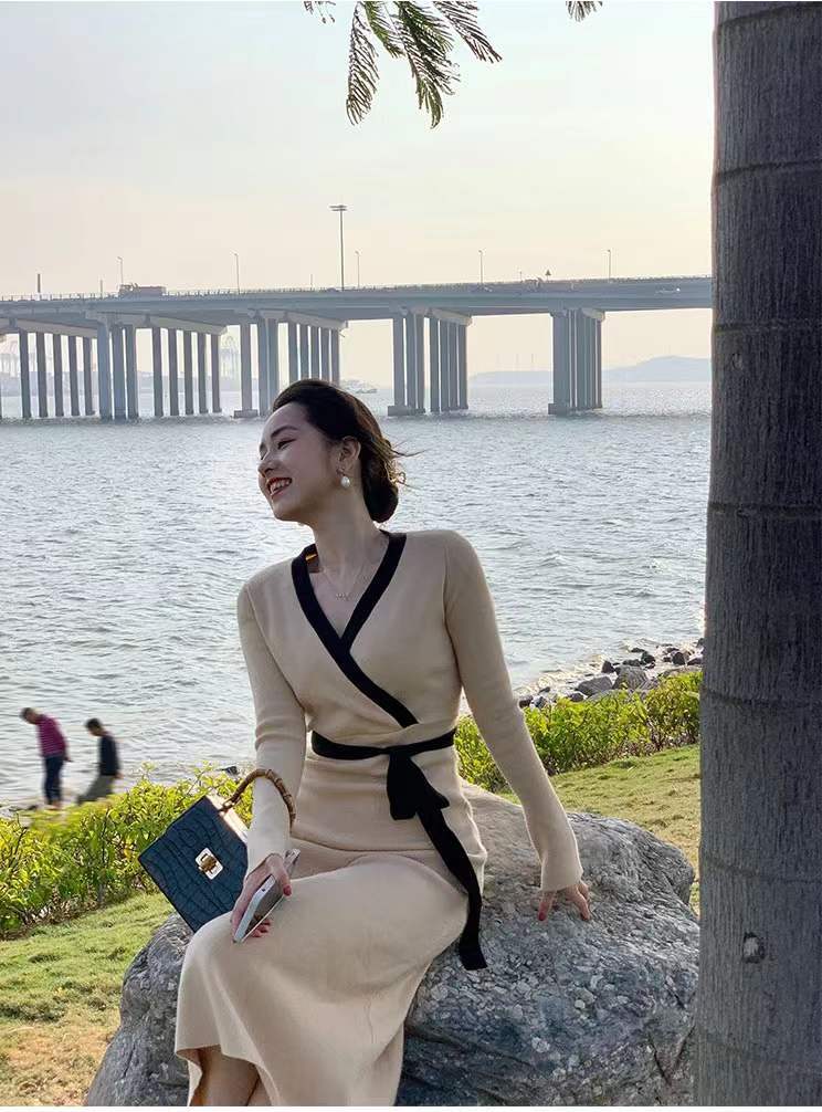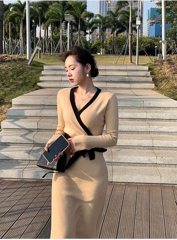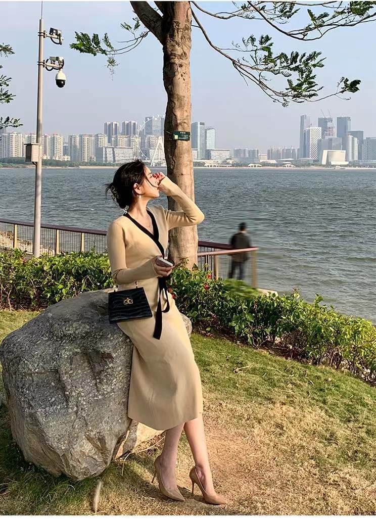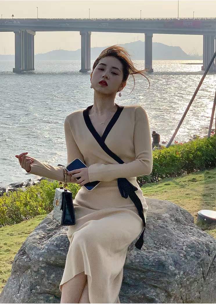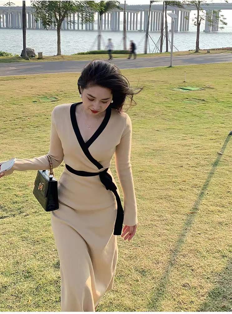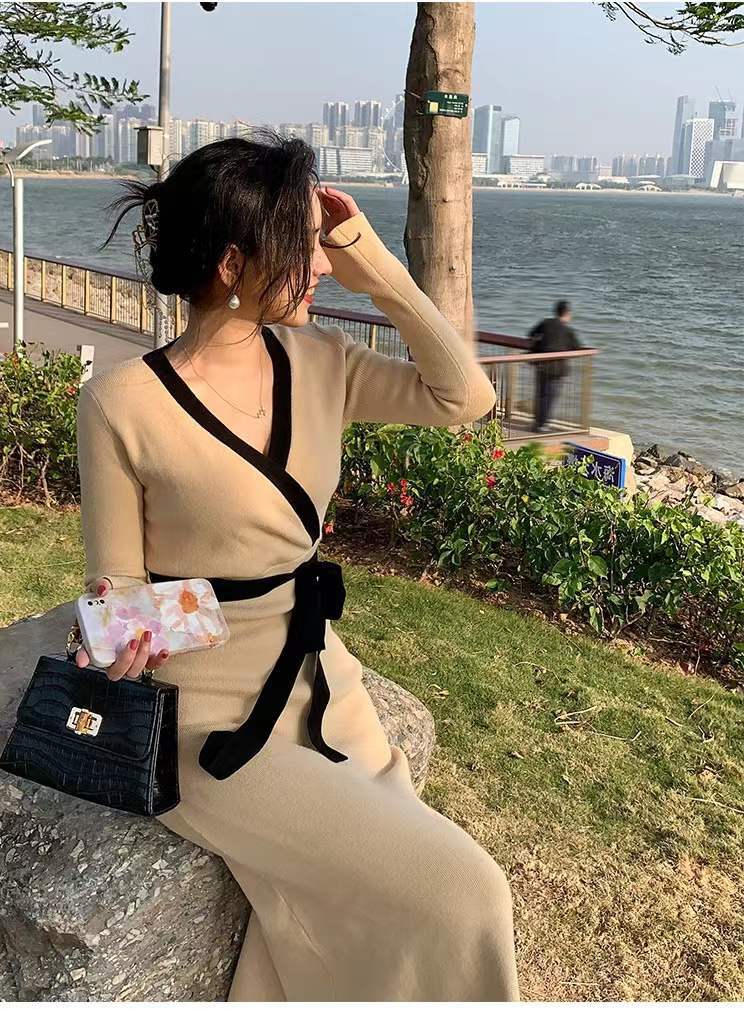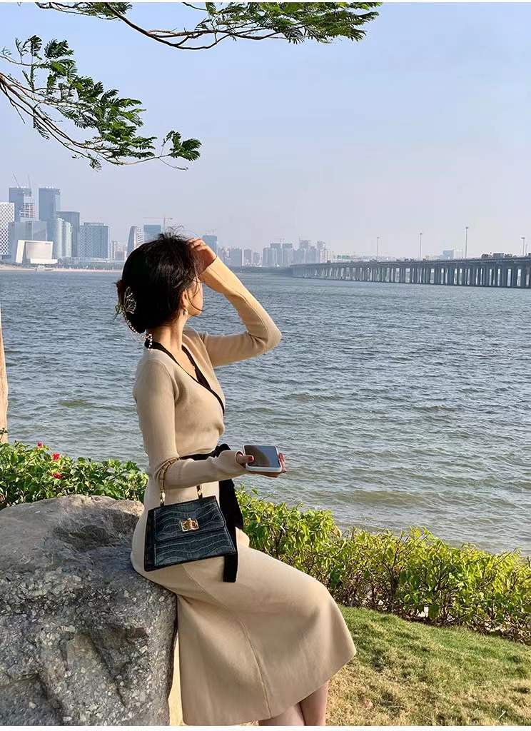 法式小香风高级感收腰显瘦连衣裙女秋季新款设计感小众V领针织裙