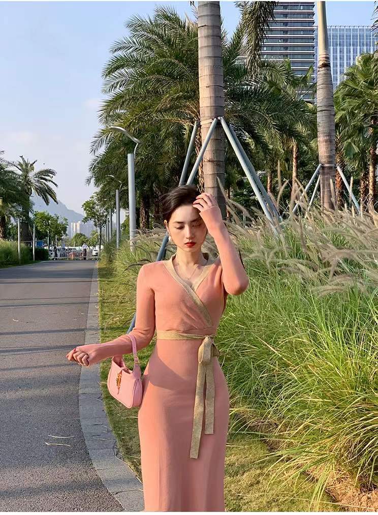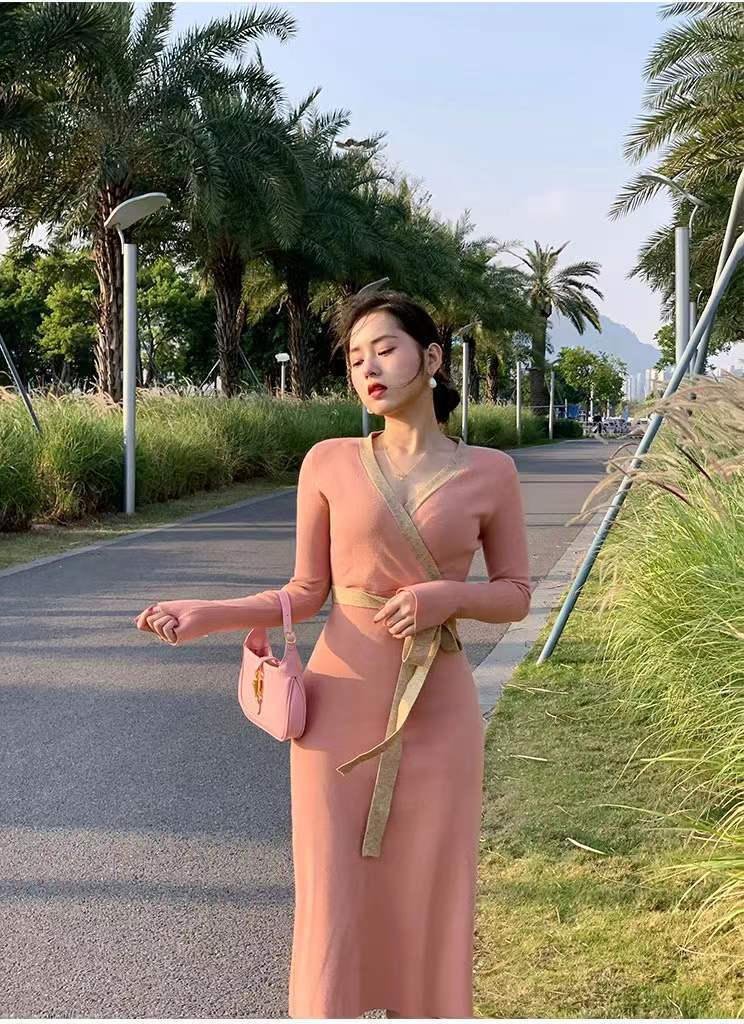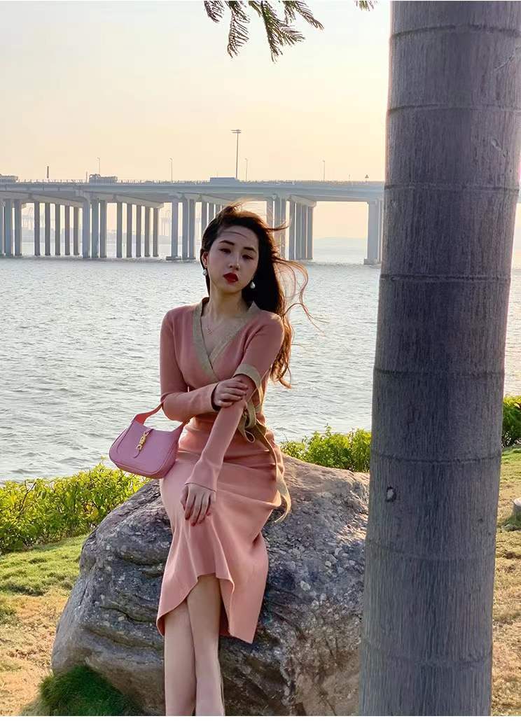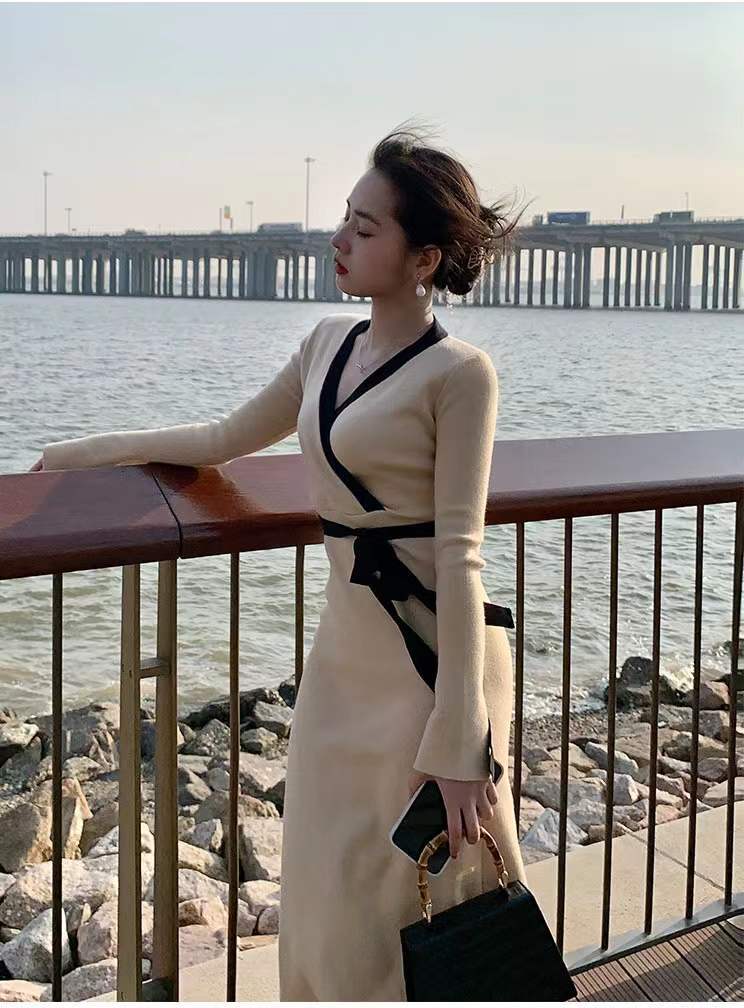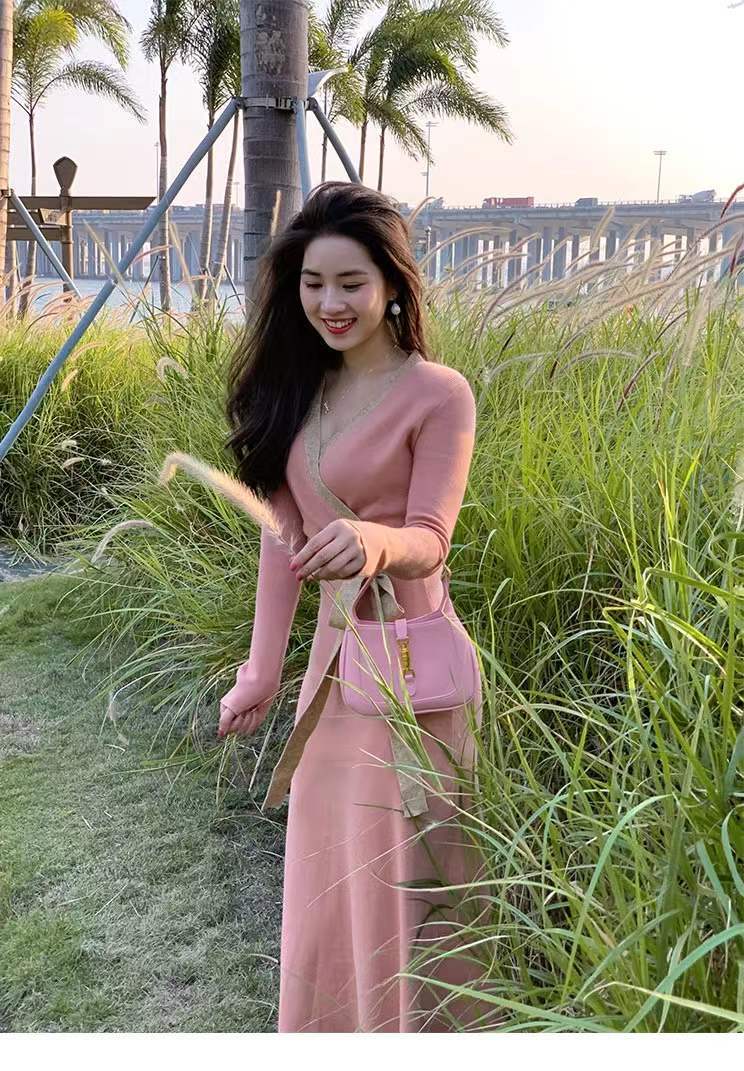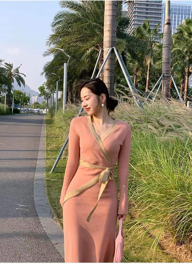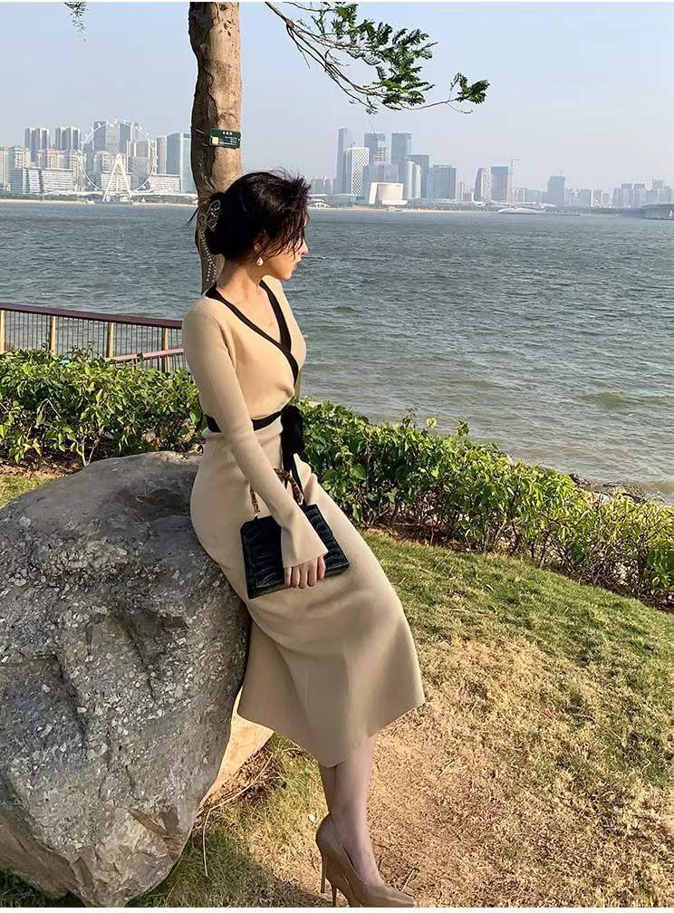 法式小香风高级感收腰显瘦连衣裙女秋季新款设计感小众V领针织裙