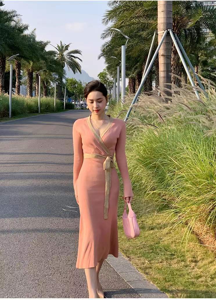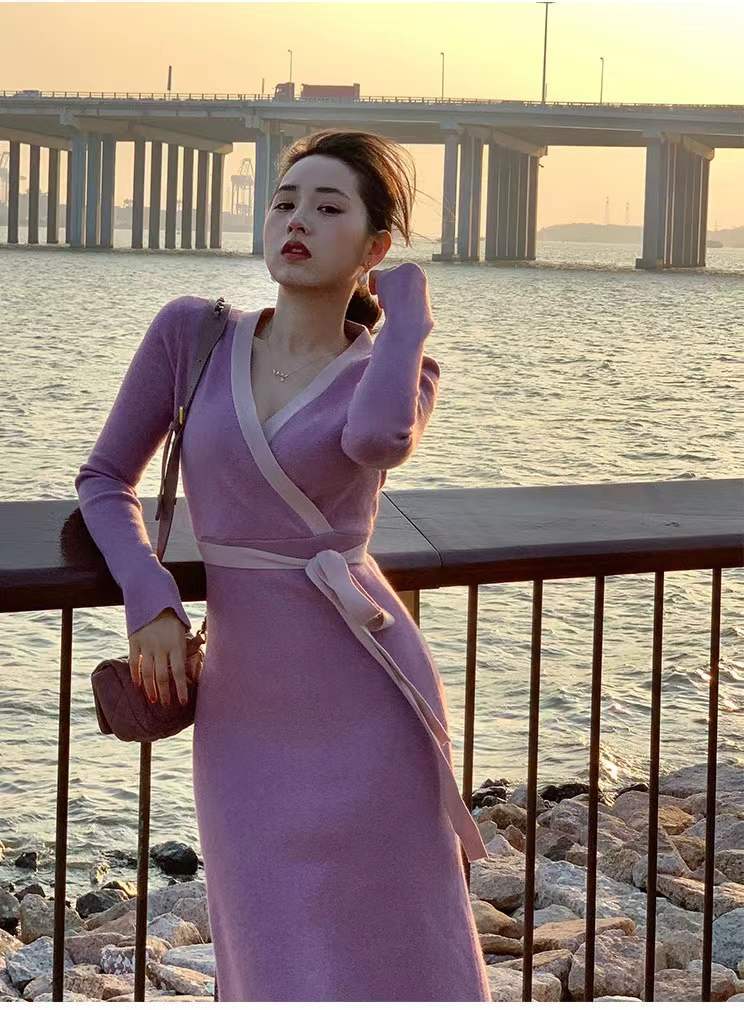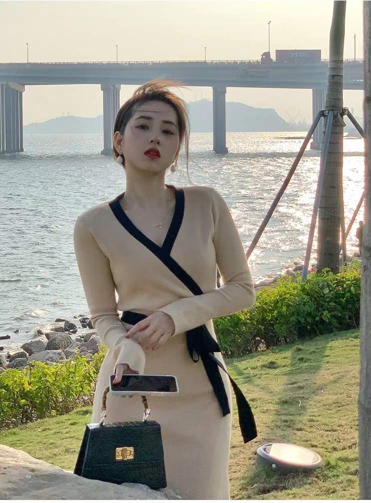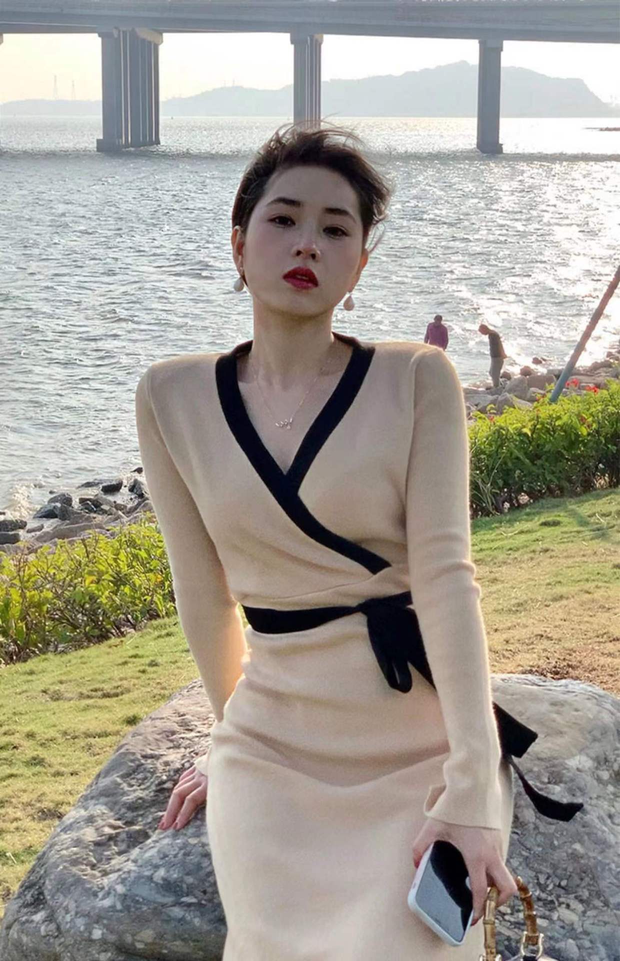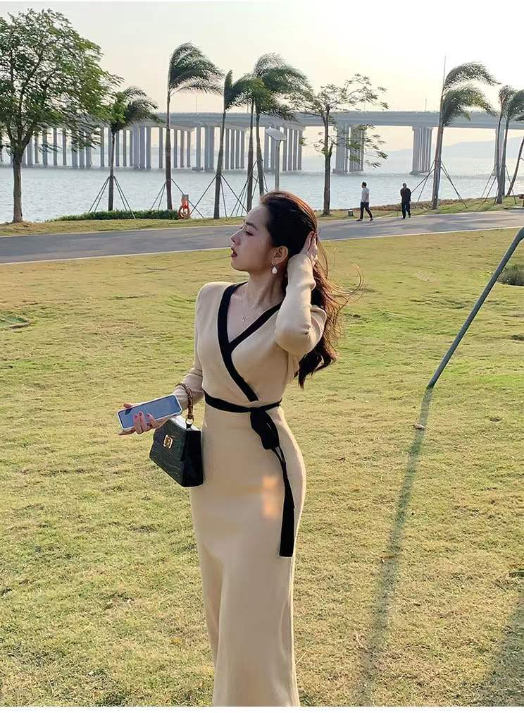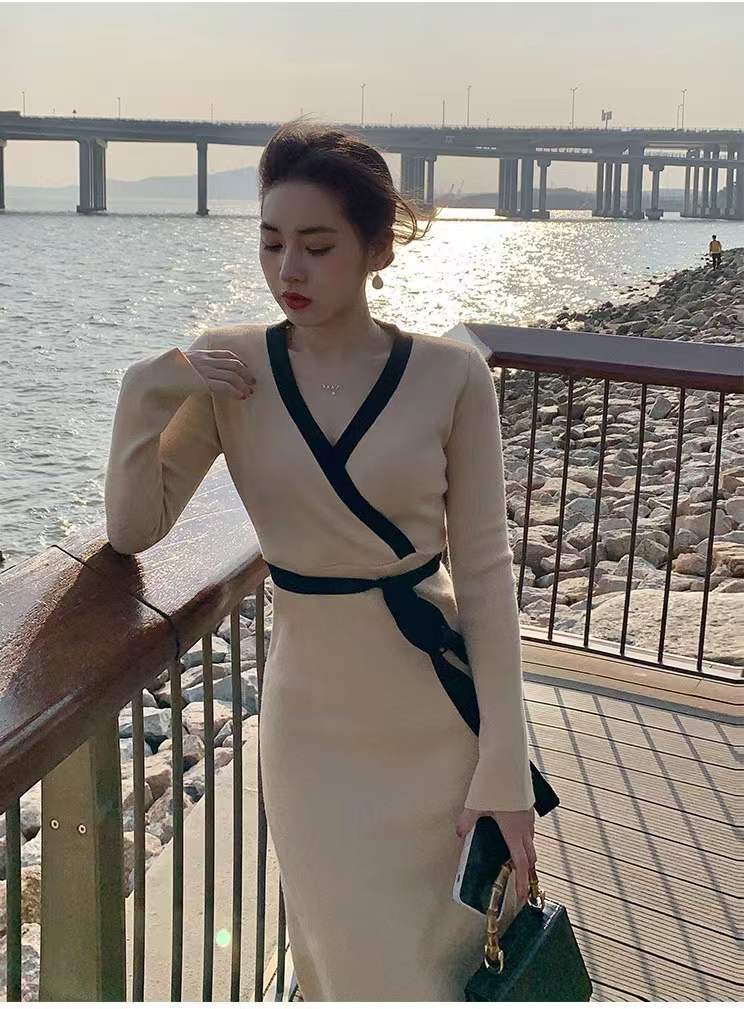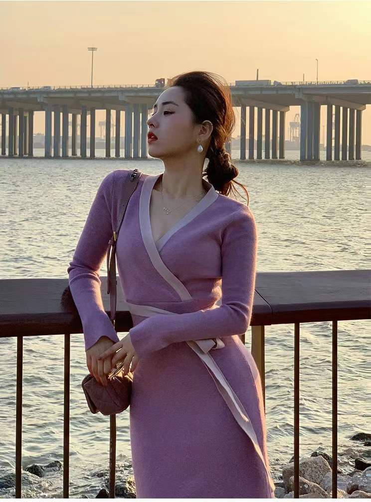 法式小香风高级感收腰显瘦连衣裙女秋季新款设计感小众V领针织裙