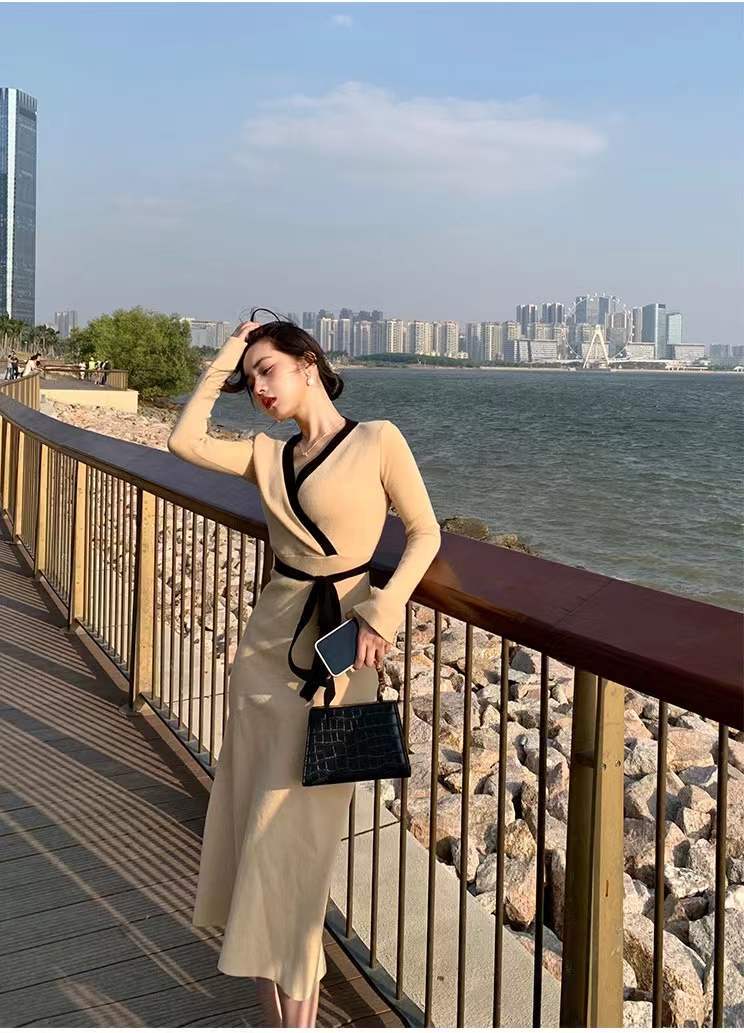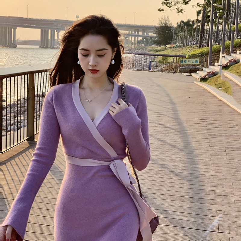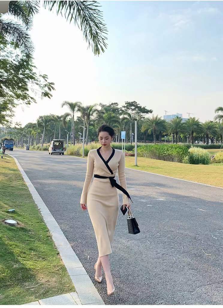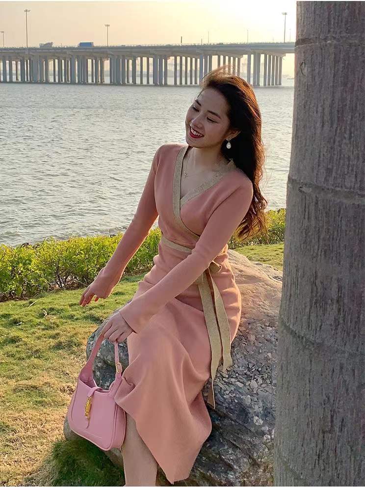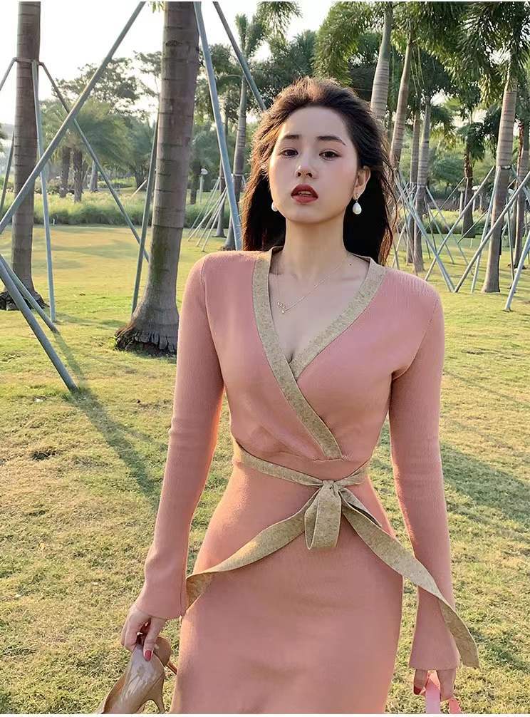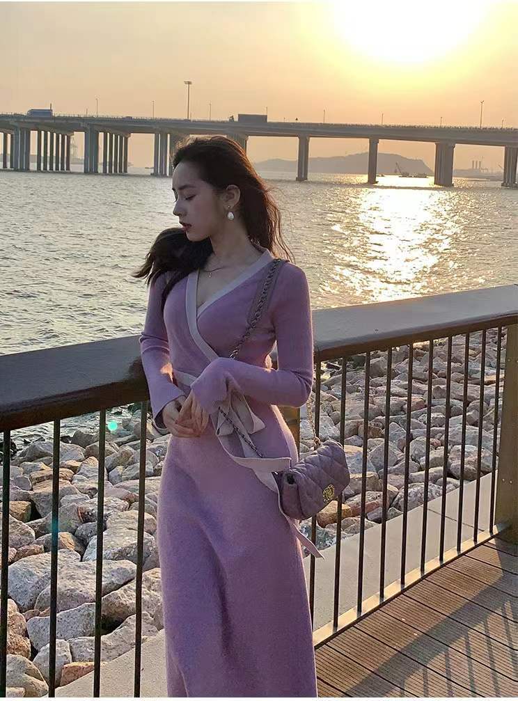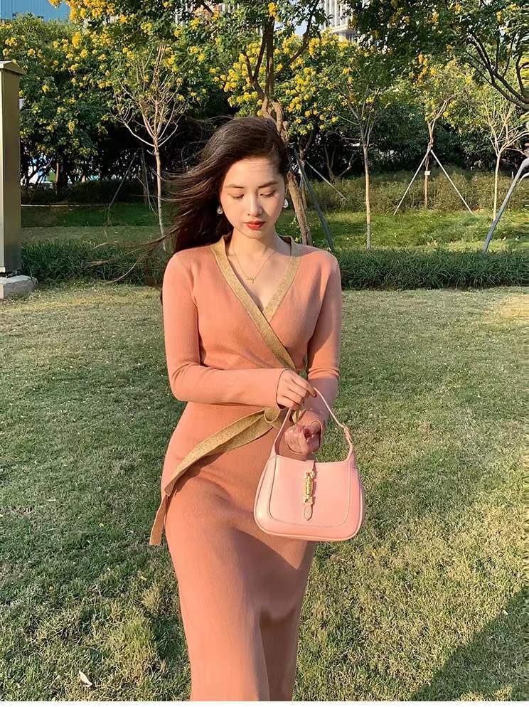 法式小香风高级感收腰显瘦连衣裙女秋季新款设计感小众V领针织裙