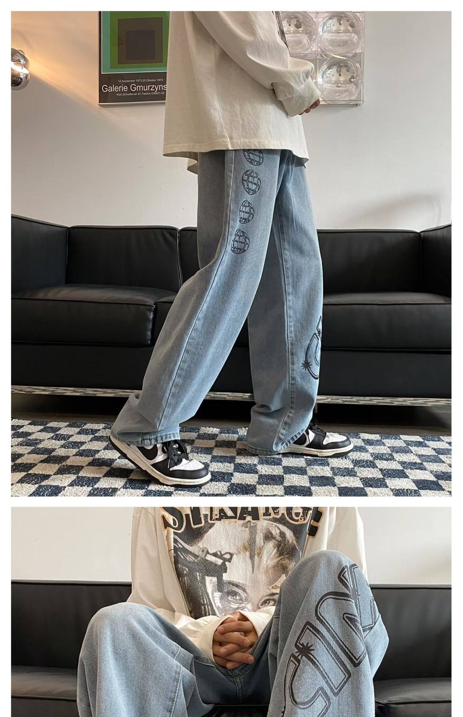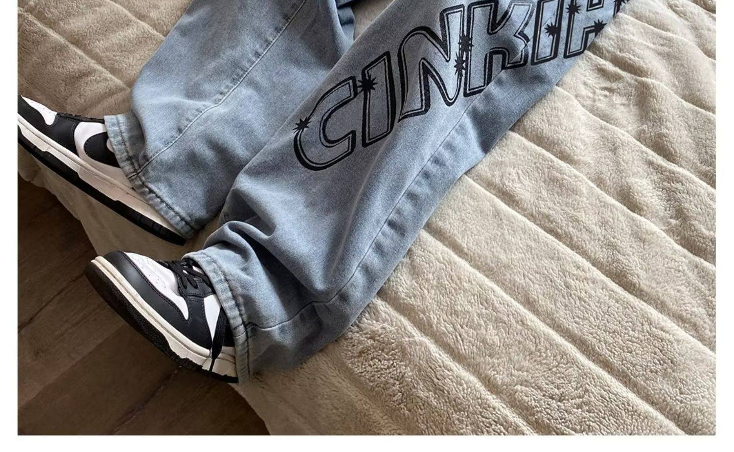 하이 스트리트 트렌드 프린트 레터링 빈티지 데님 팬츠