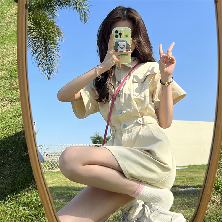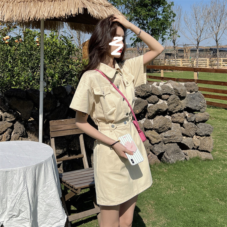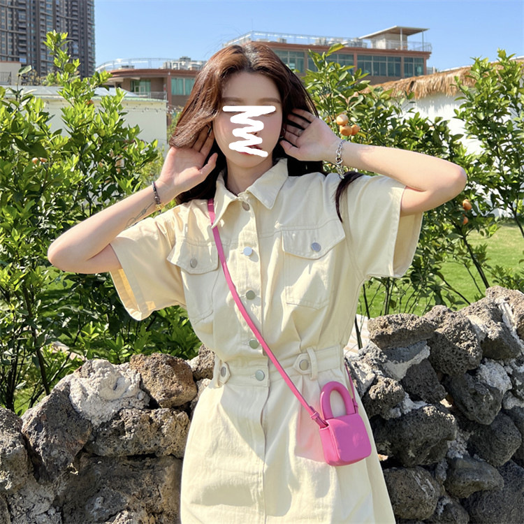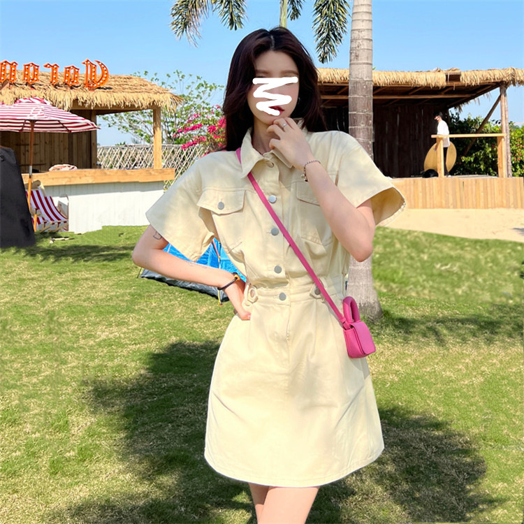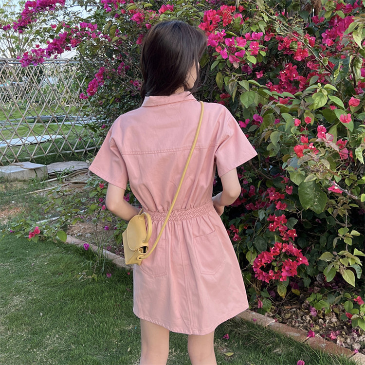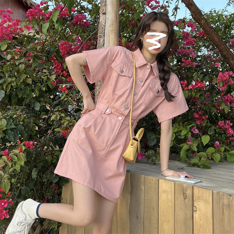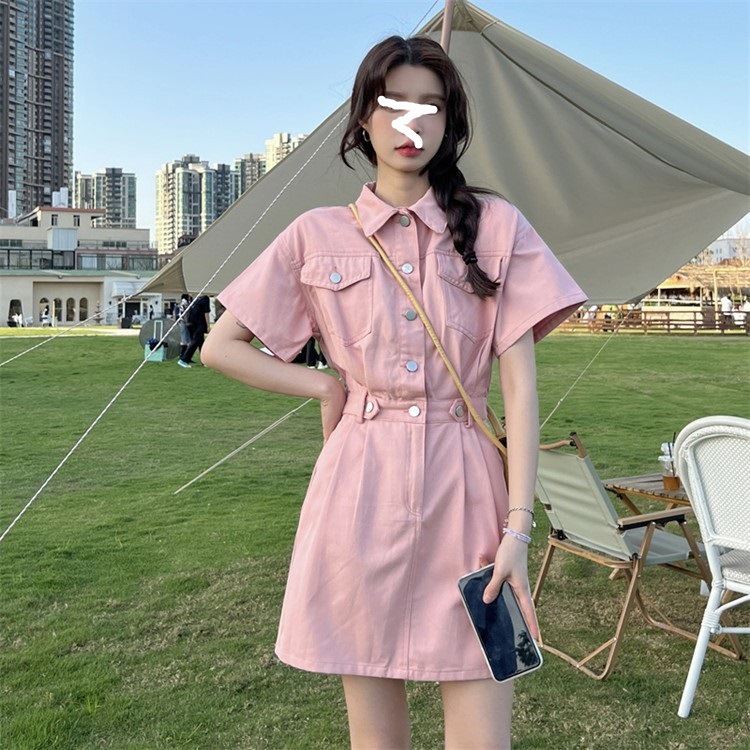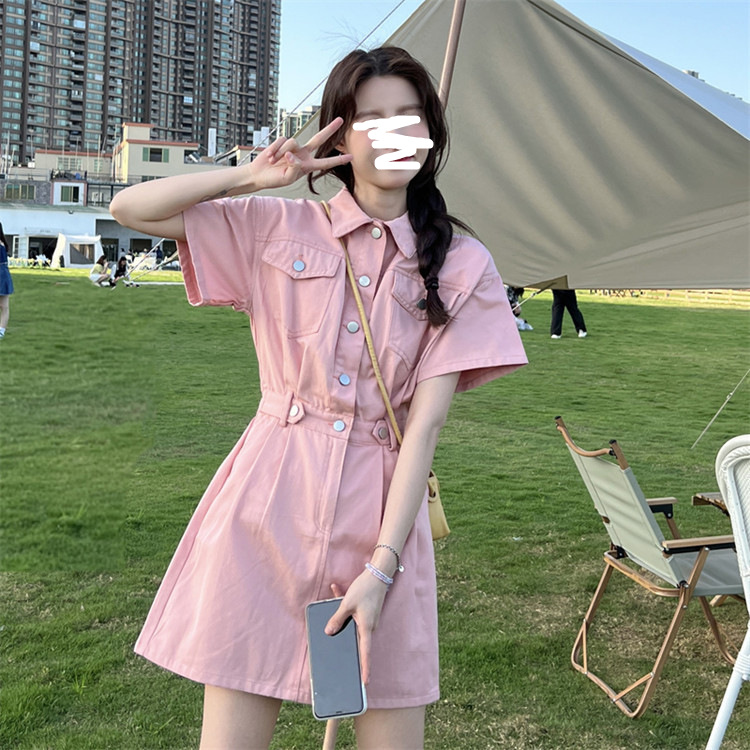 夏季2023新款女装法式洋气小个子炸街减龄粉色polo领牛仔连衣裙女