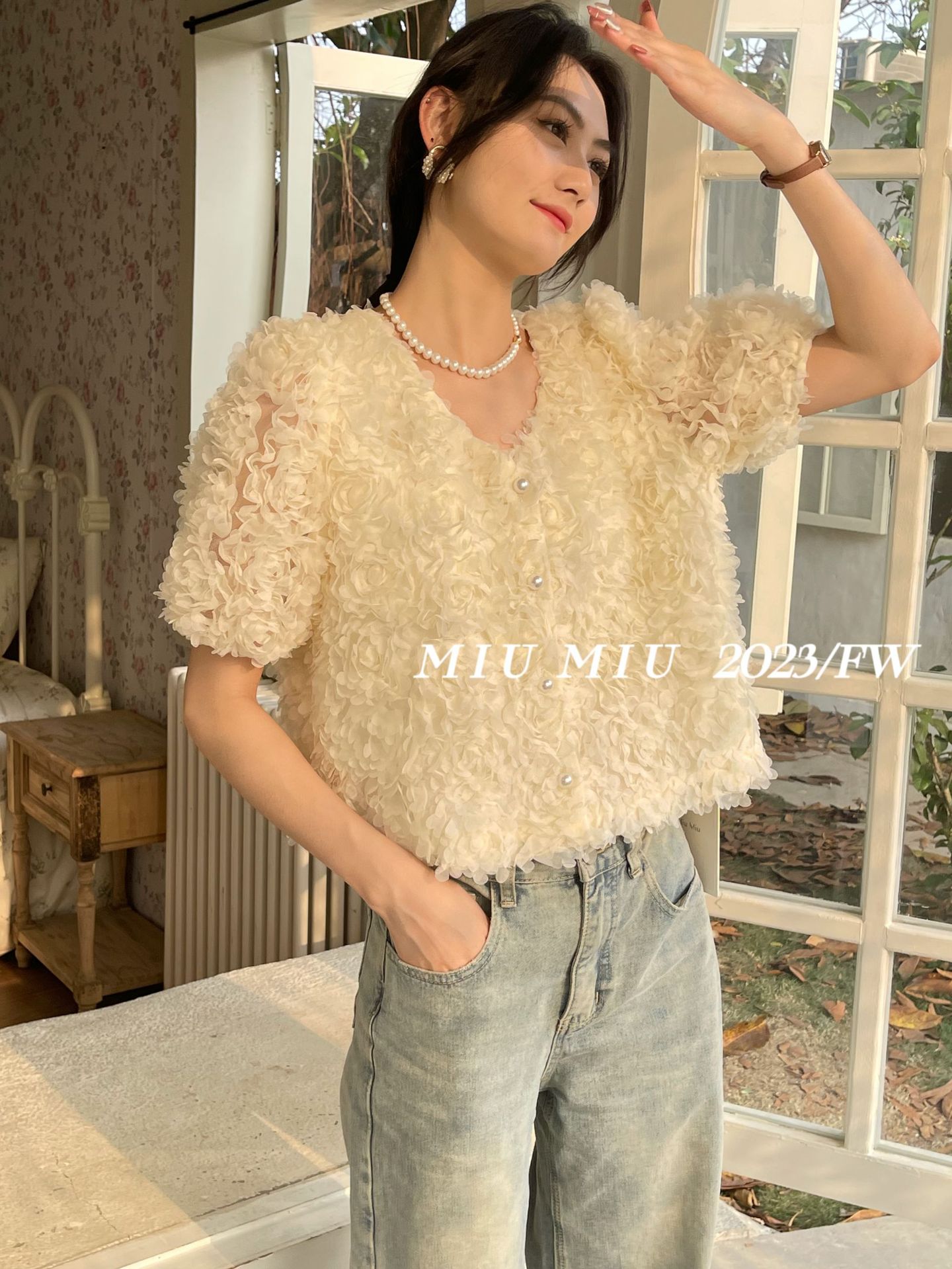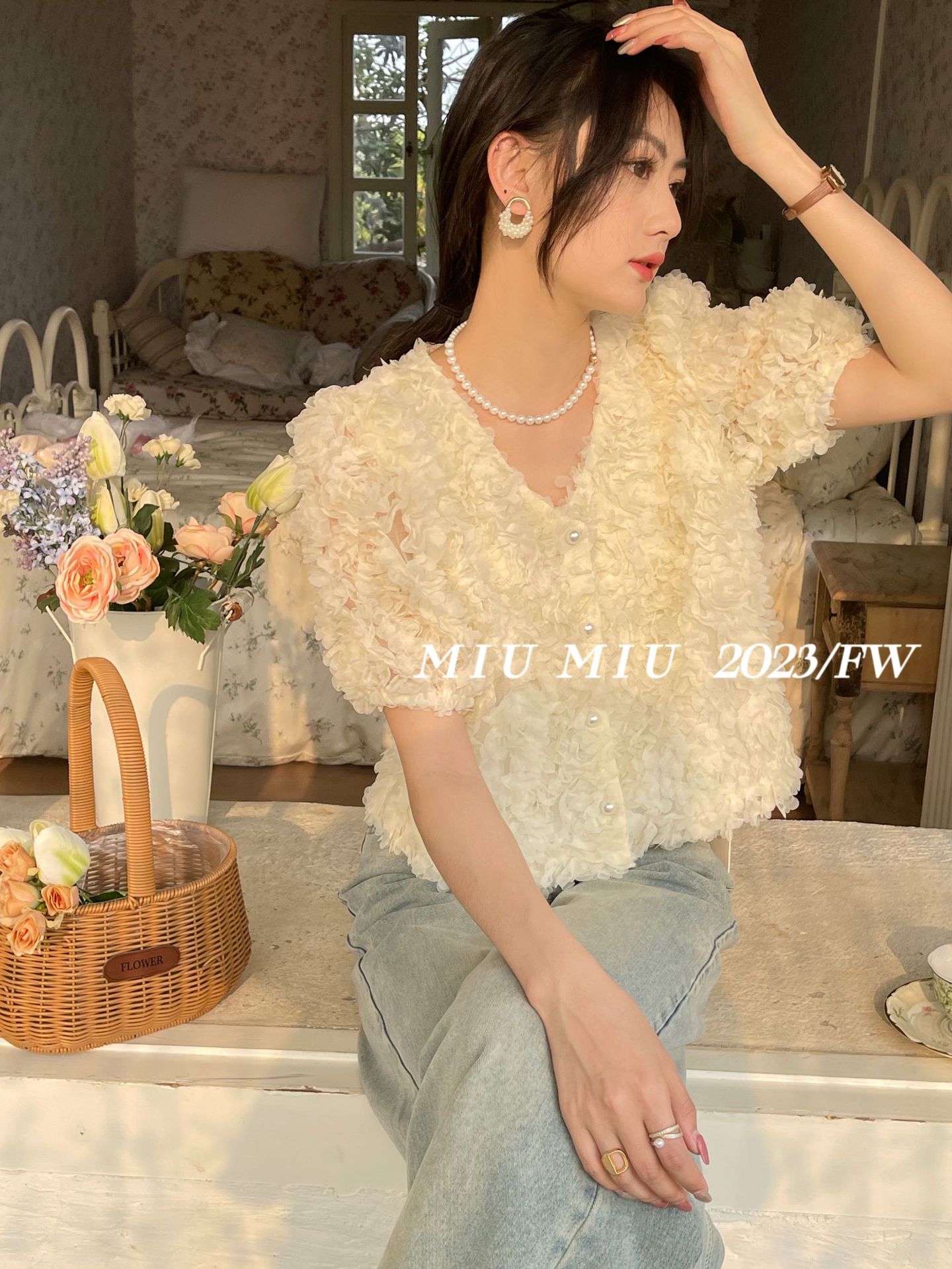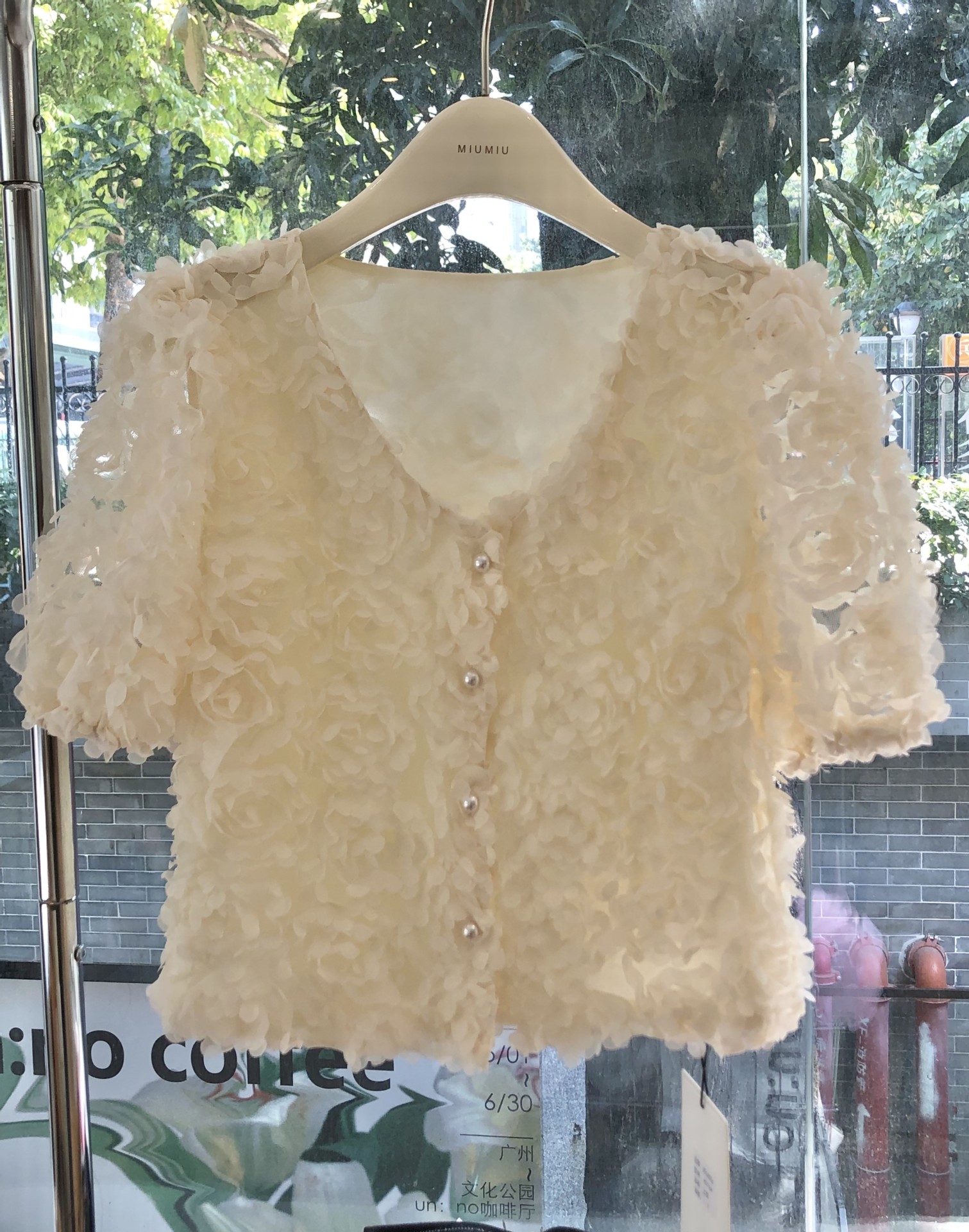 2023春夏新款设计V领开衫法式纯欲风气质花瓣高级感短袖衬衫上衣