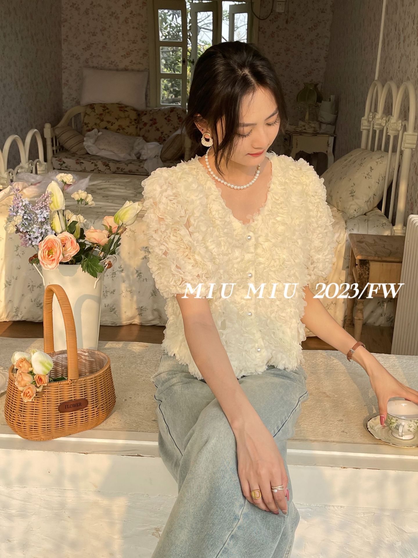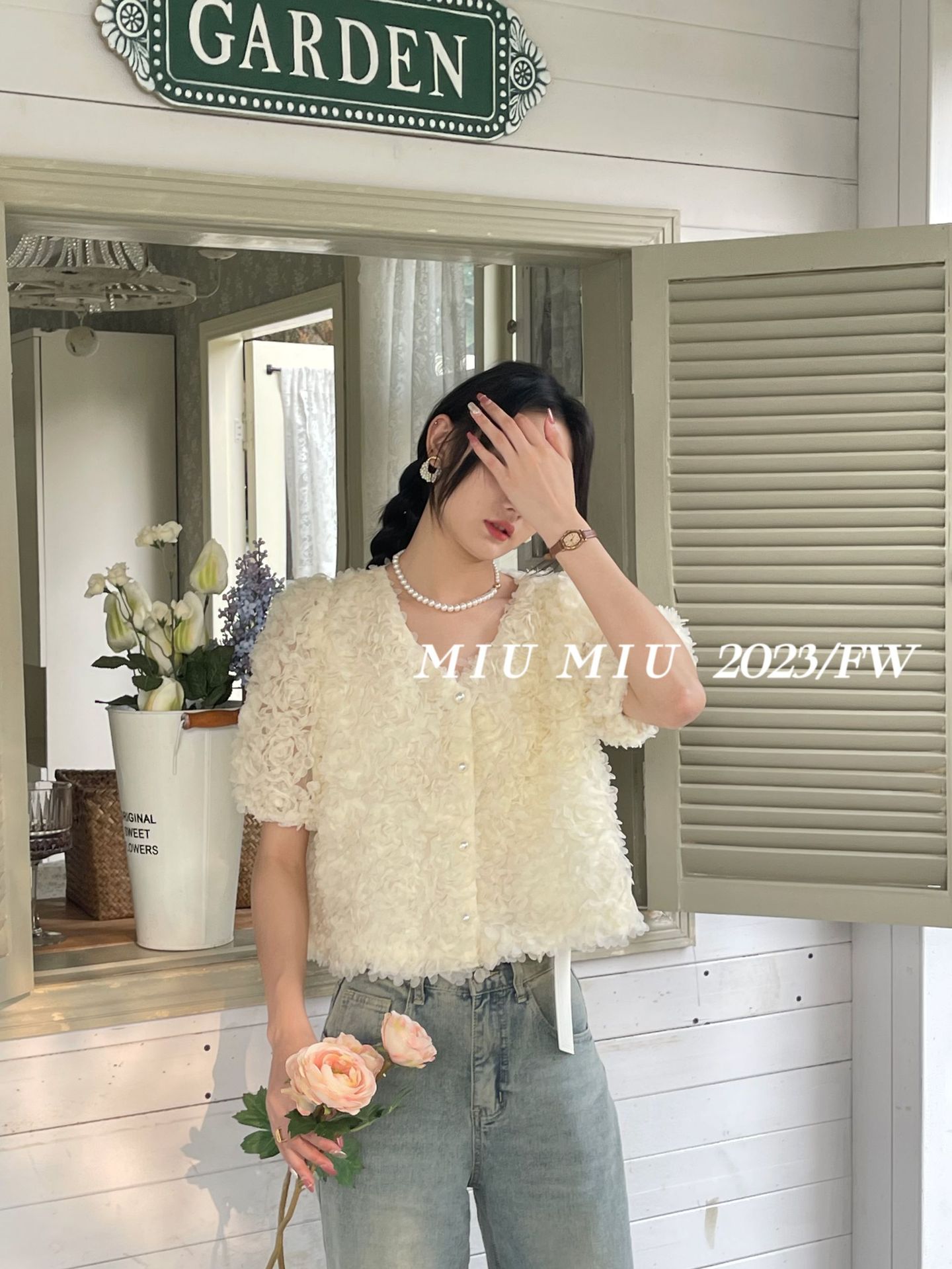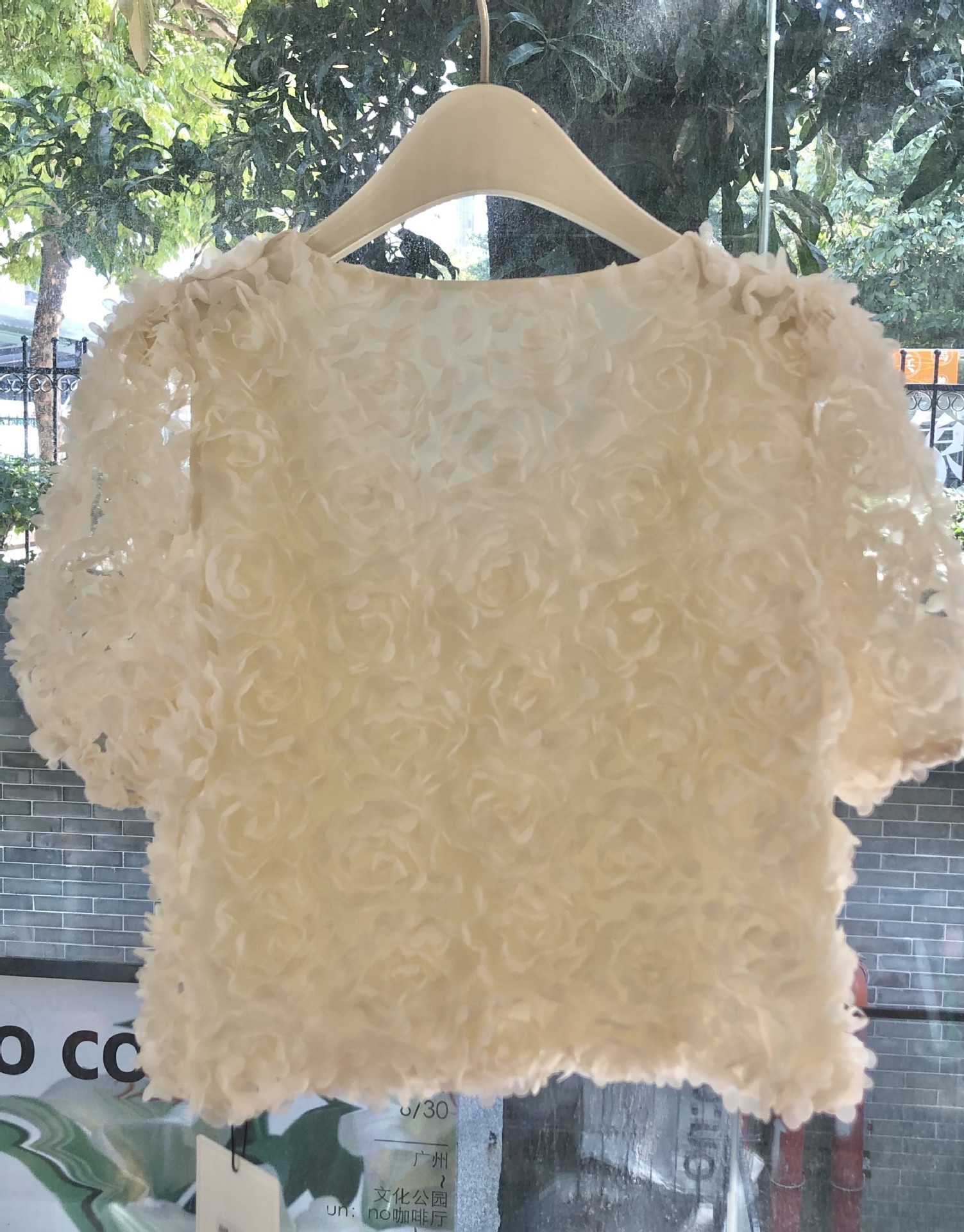 2023春夏新款设计V领开衫法式纯欲风气质花瓣高级感短袖衬衫上衣