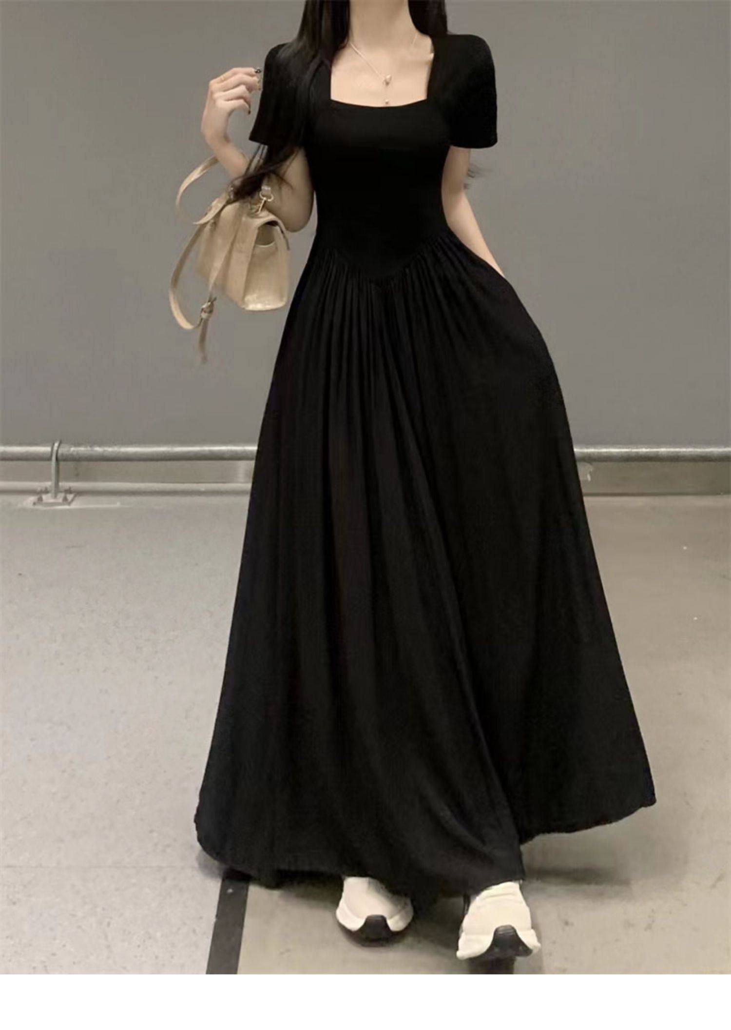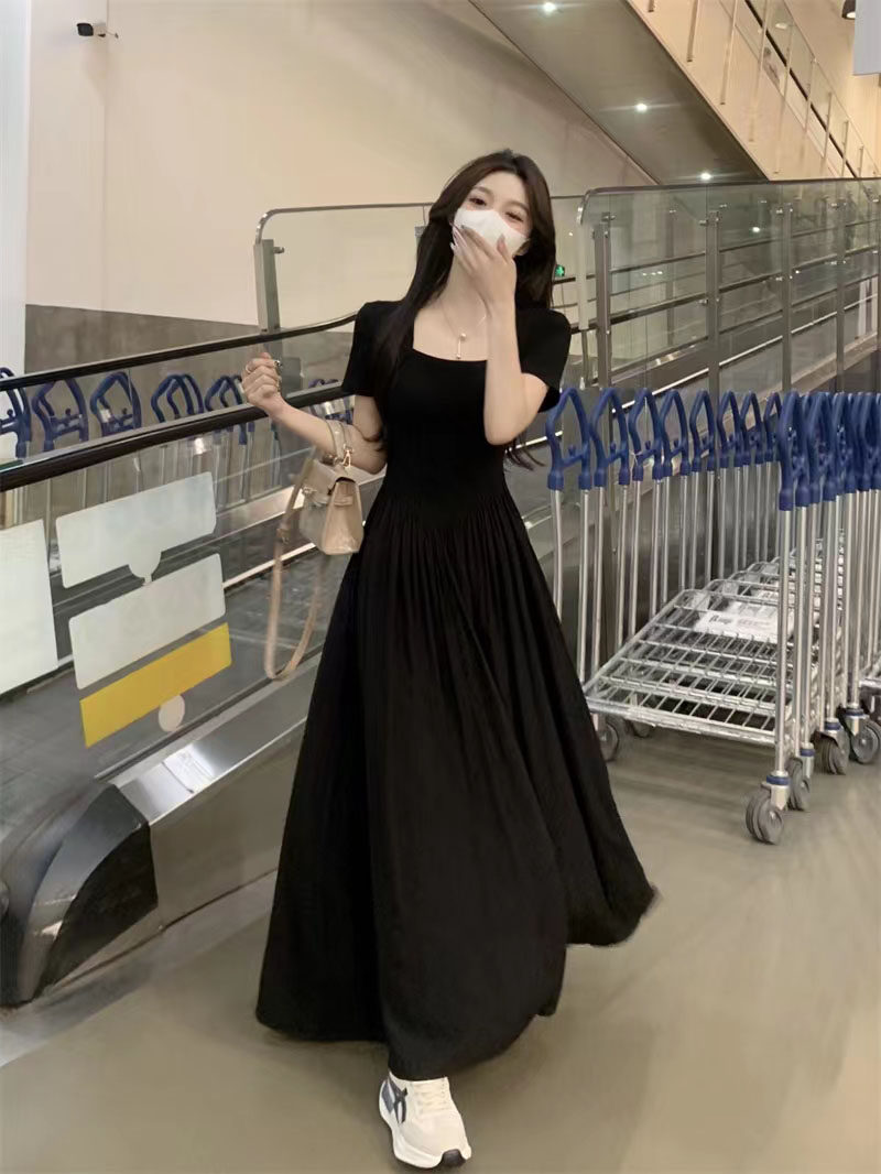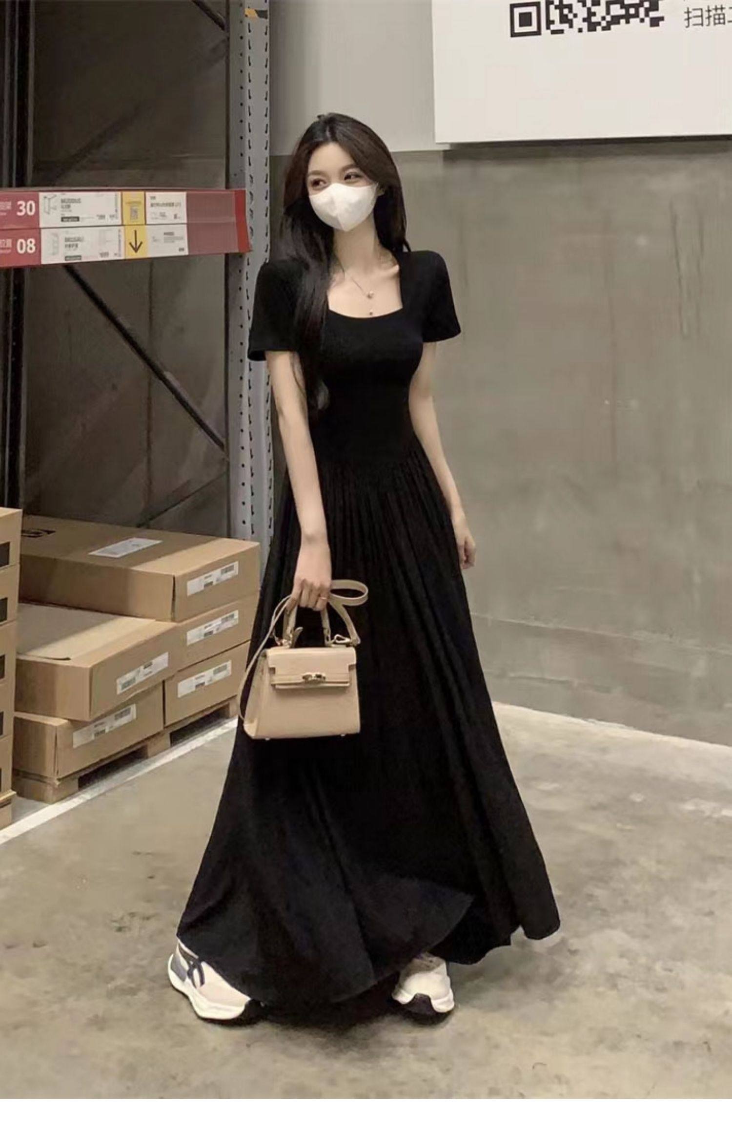 高个子女生连衣裙夏季法式加长款到脚踝170黑色短袖针织超长裙175