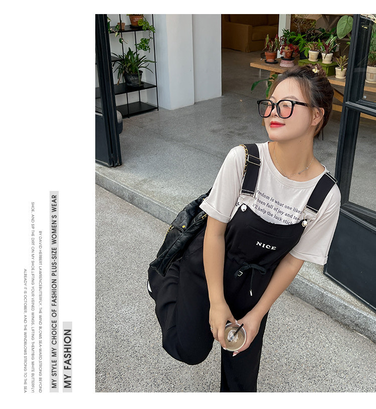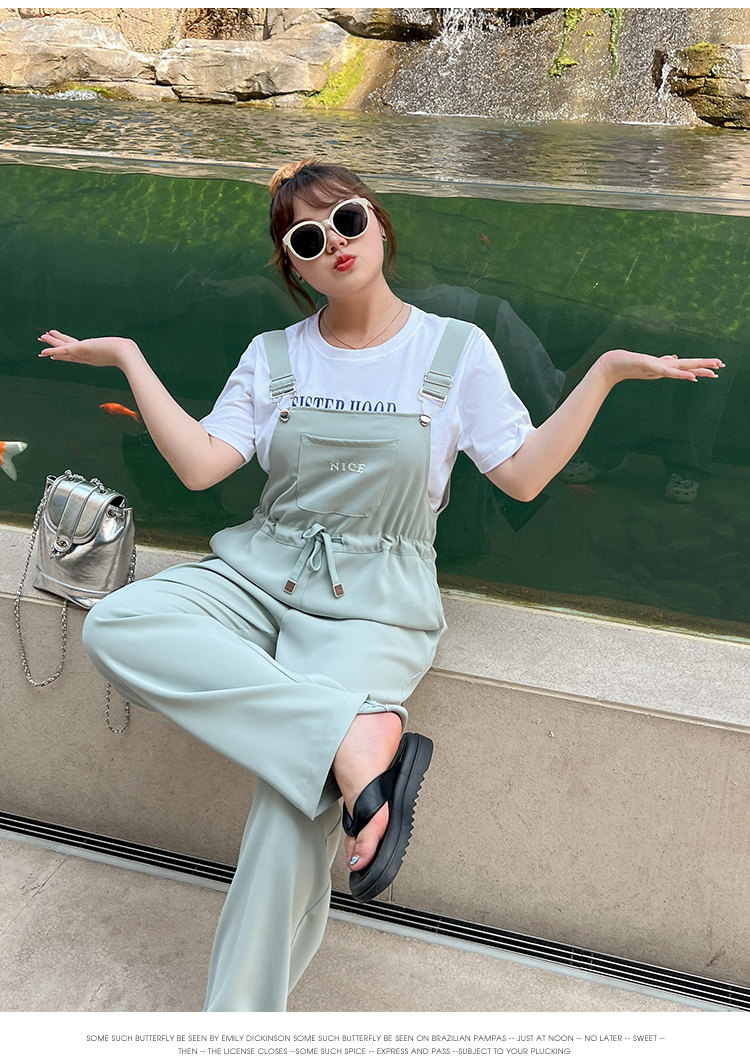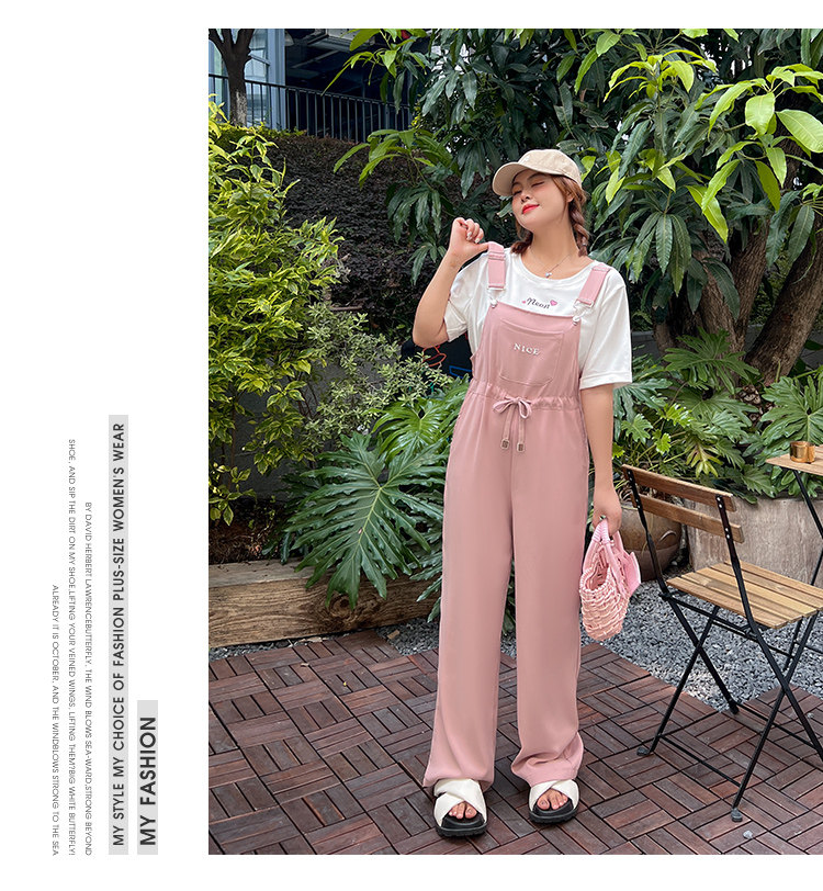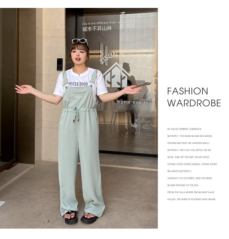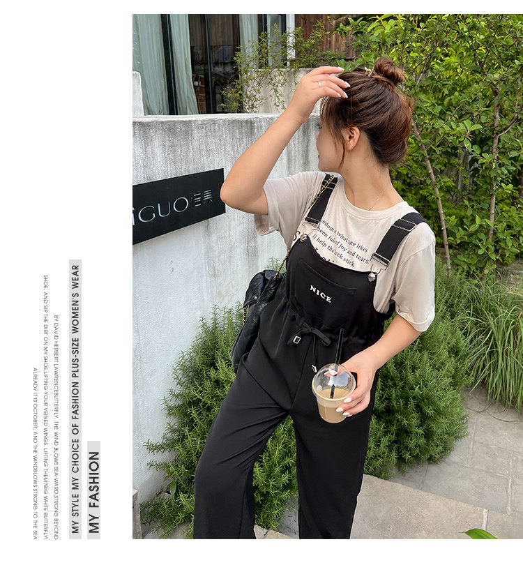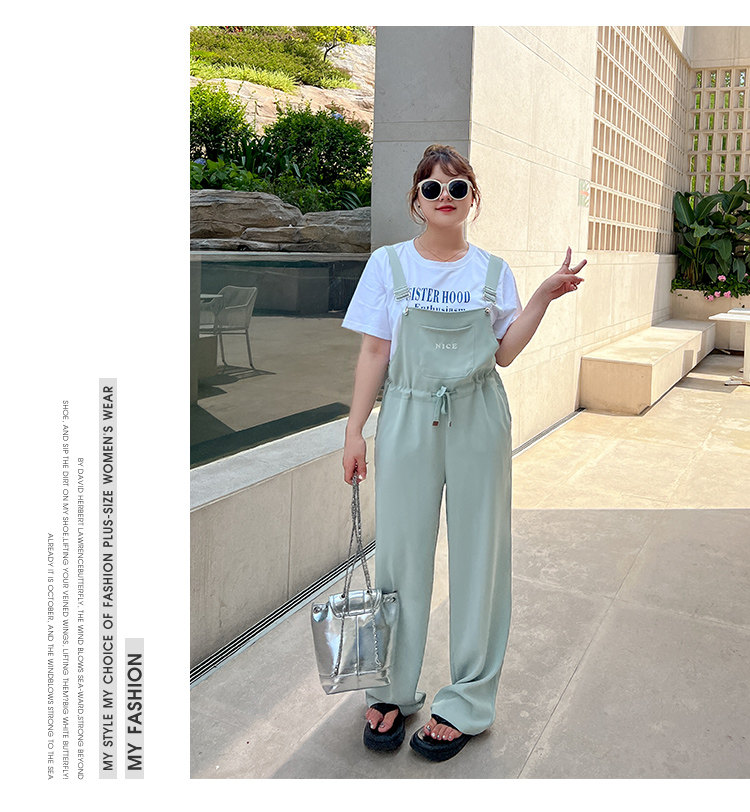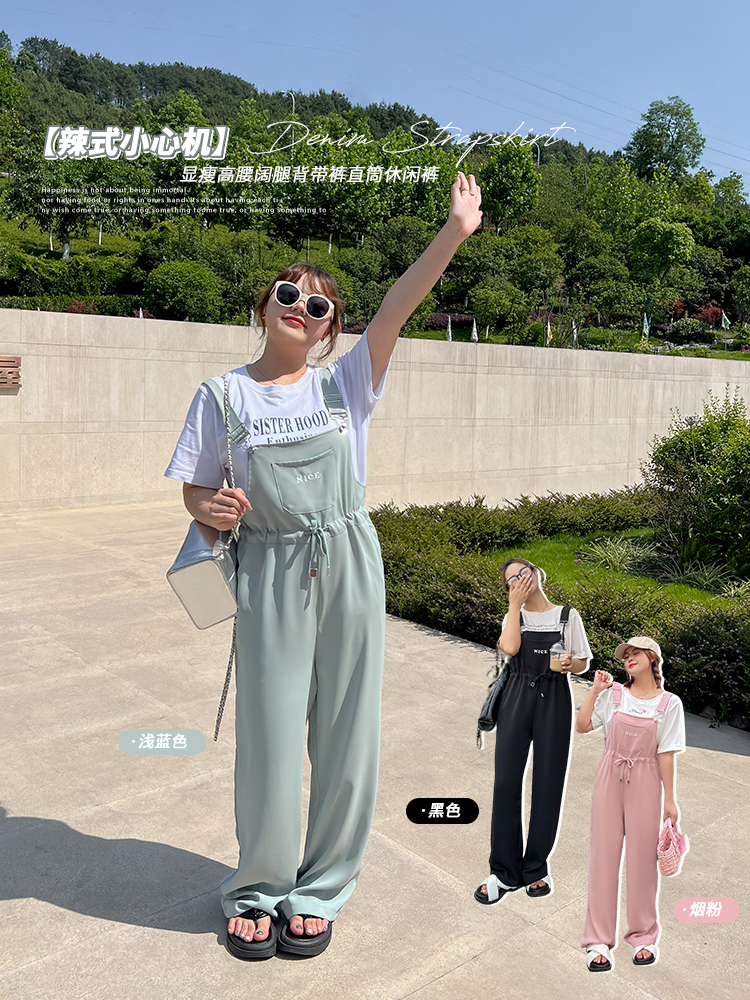 大码百分百/2023夏新款女装微胖mm显瘦高腰阔腿背带裤直筒休闲裤