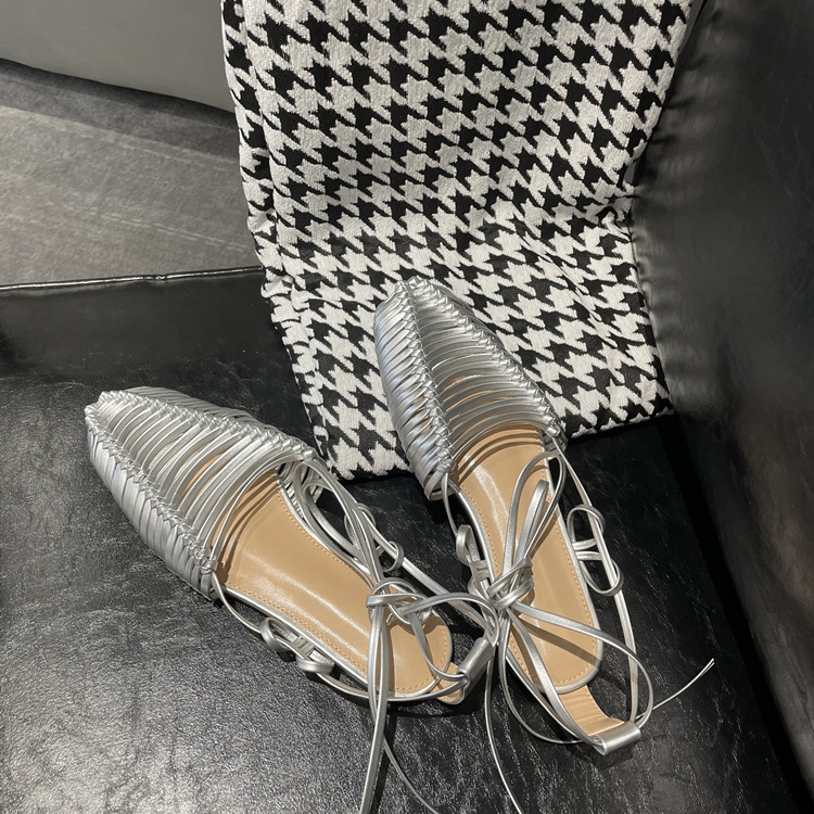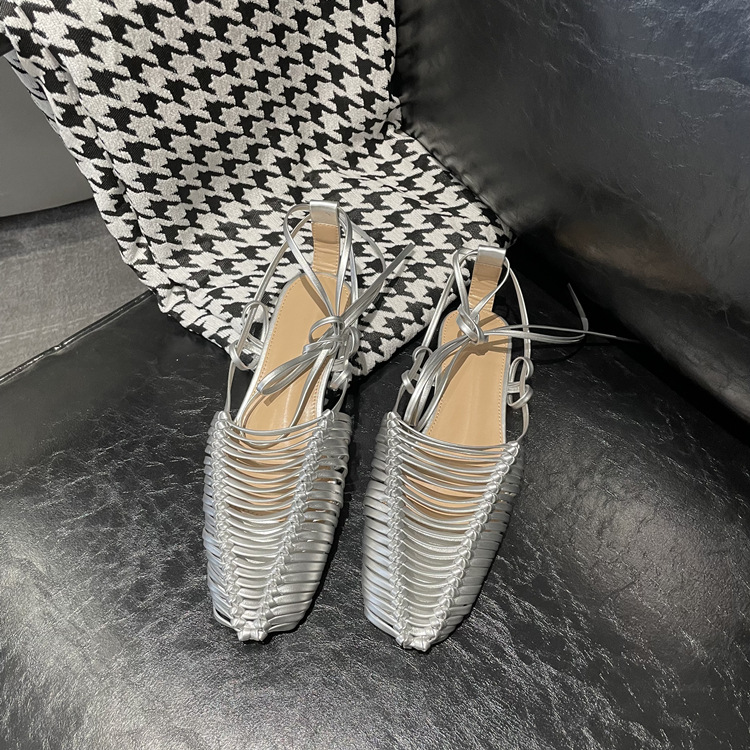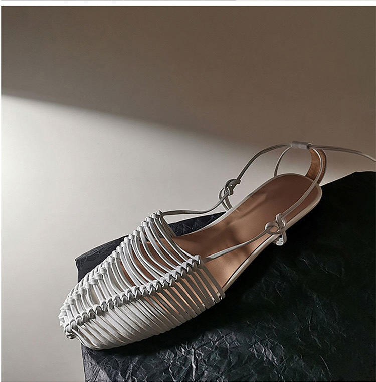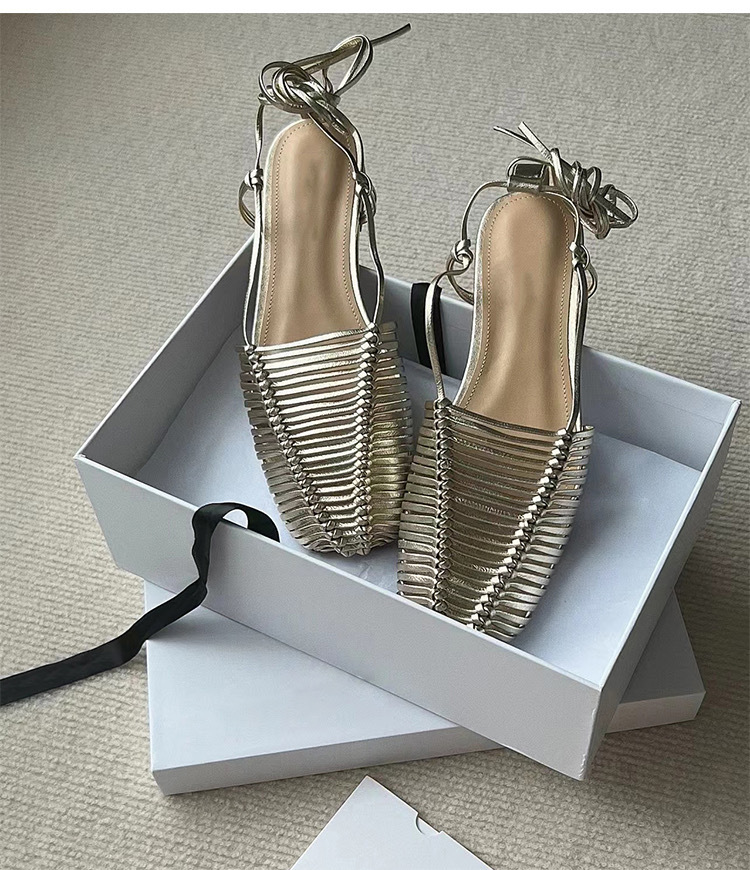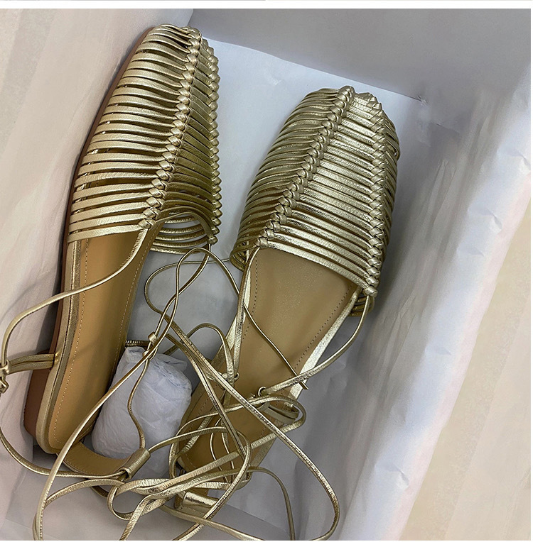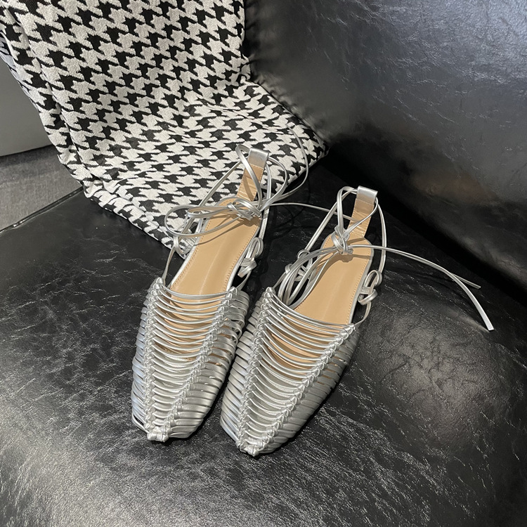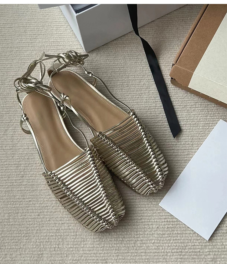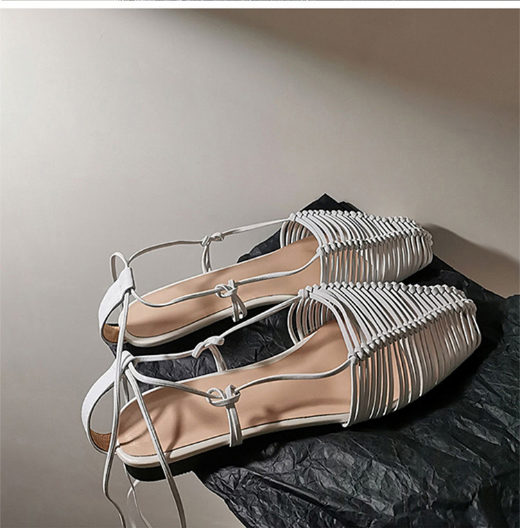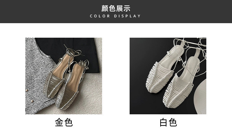 羊皮版~2023年小众脚环绑带真皮罗马凉鞋女夏平底包头编织凉拖鞋