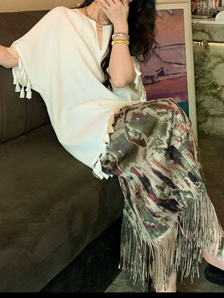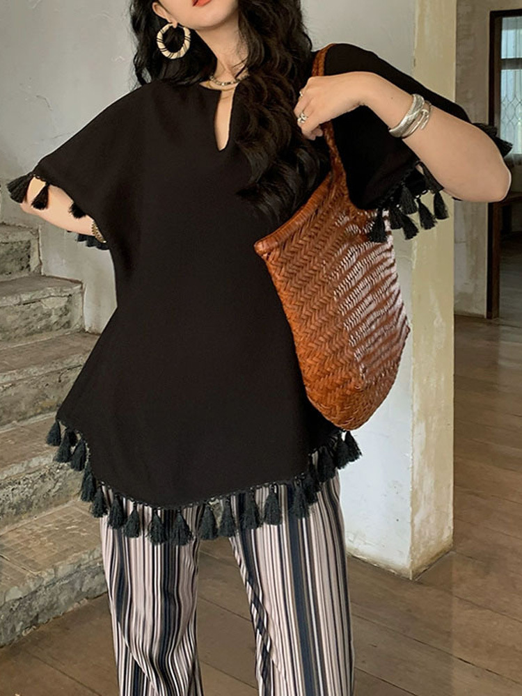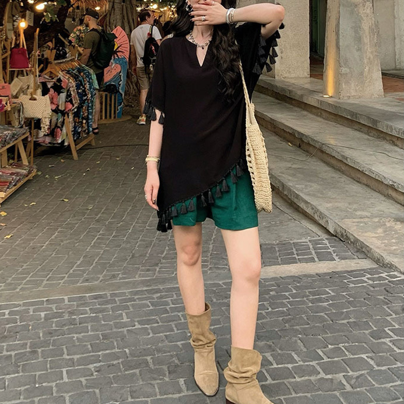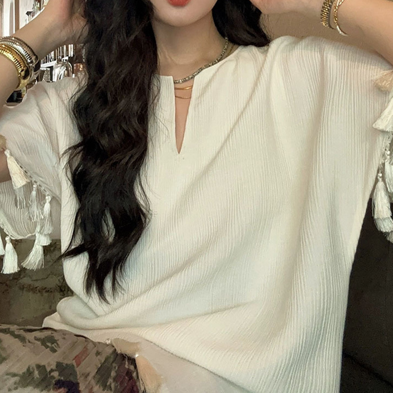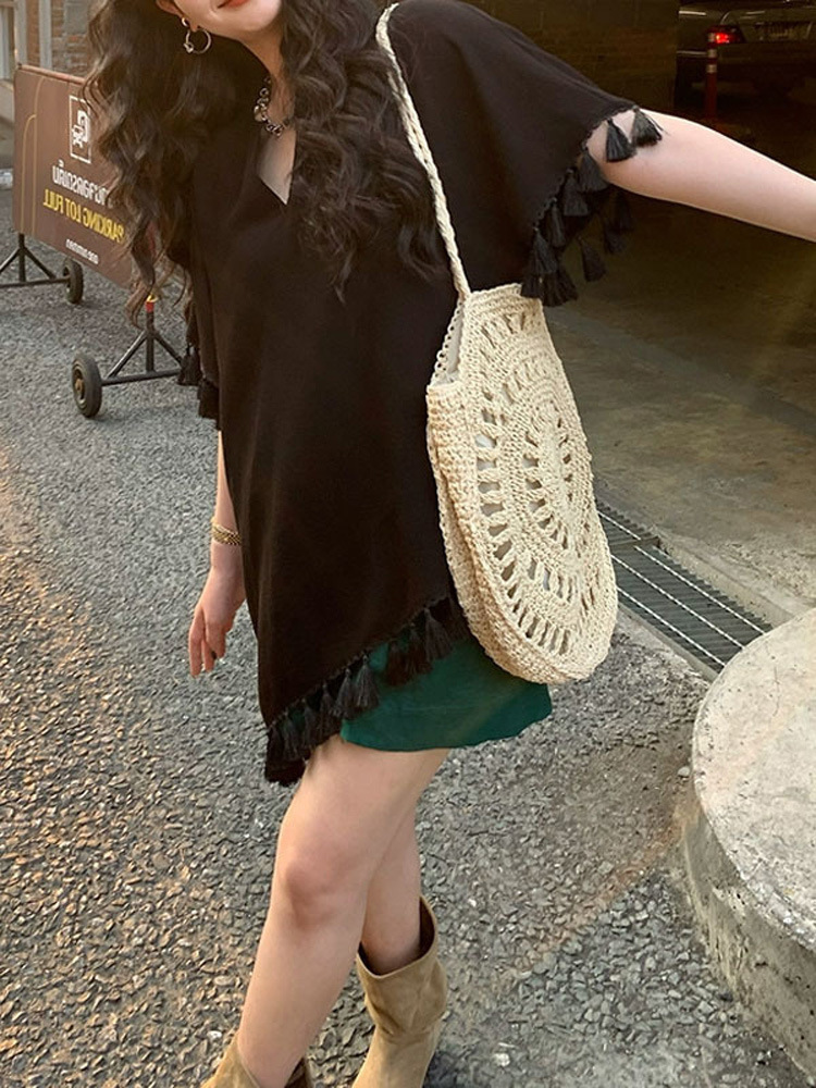 流苏v领t恤女中长款2023夏装新款宽松时尚短袖纯色设计感上衣