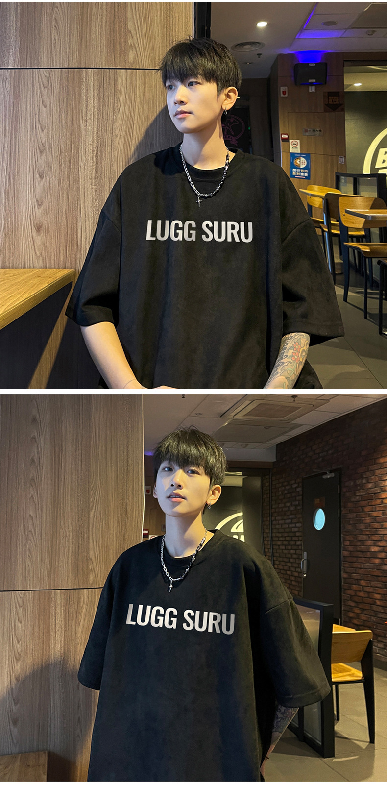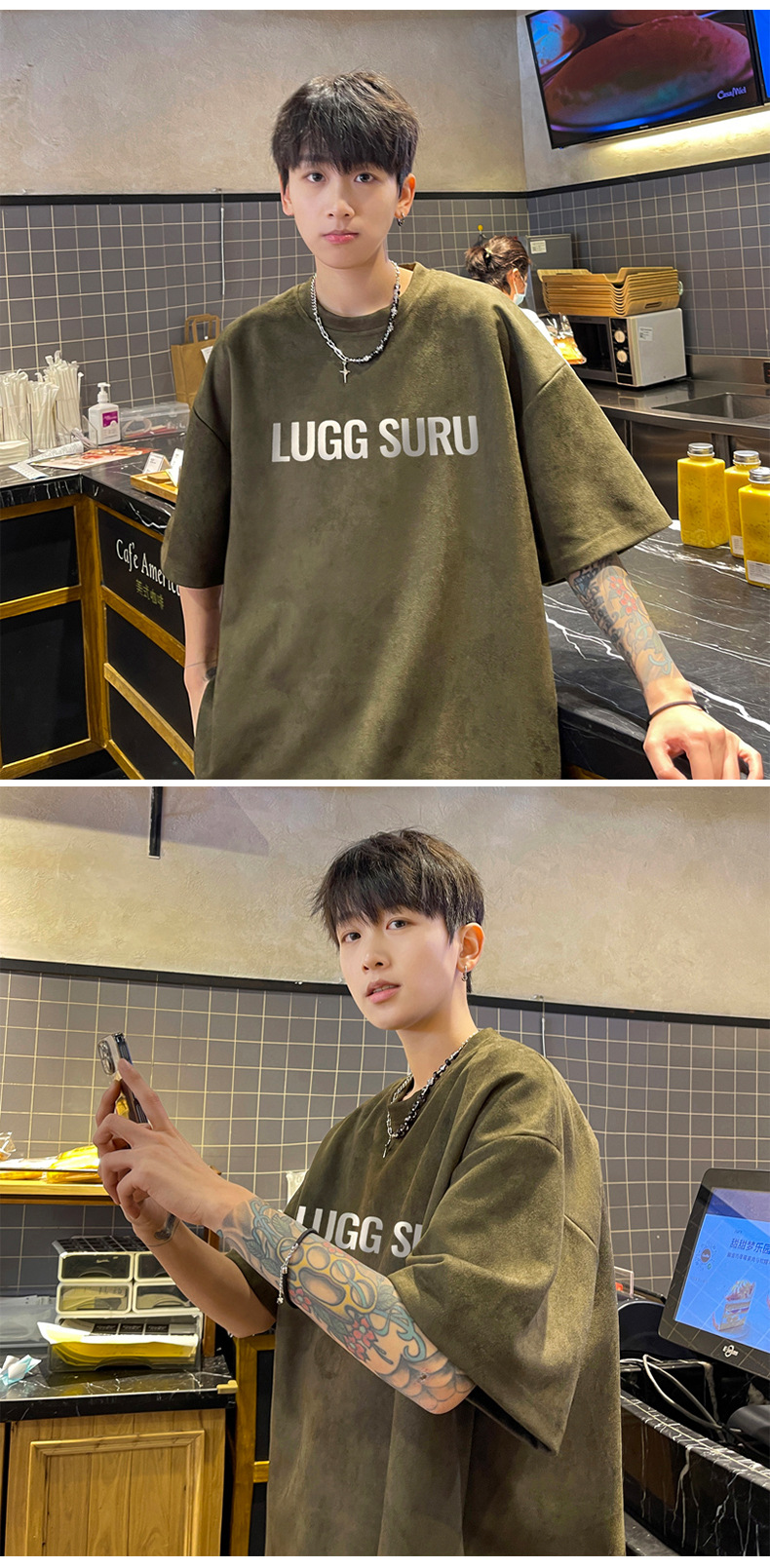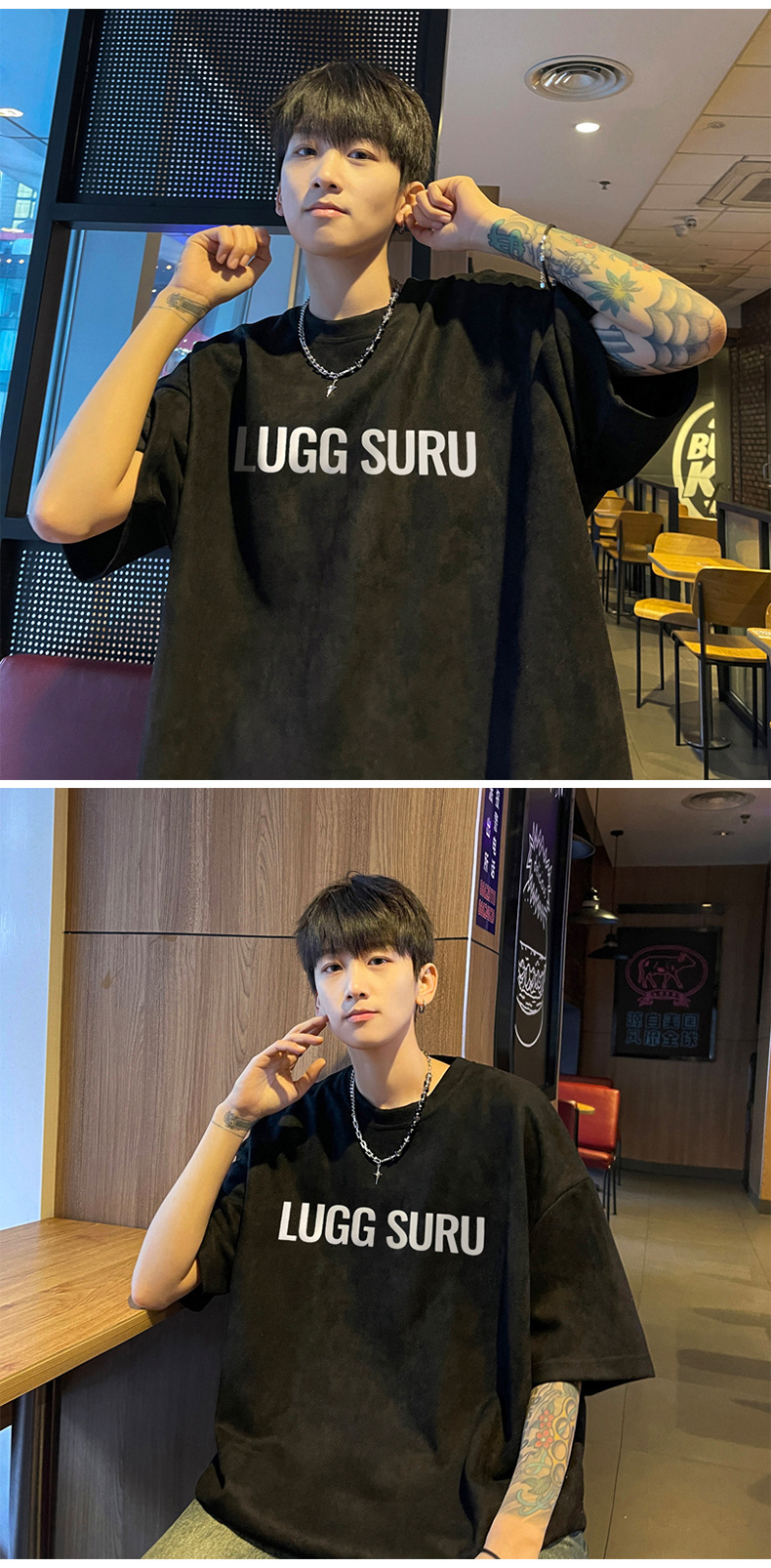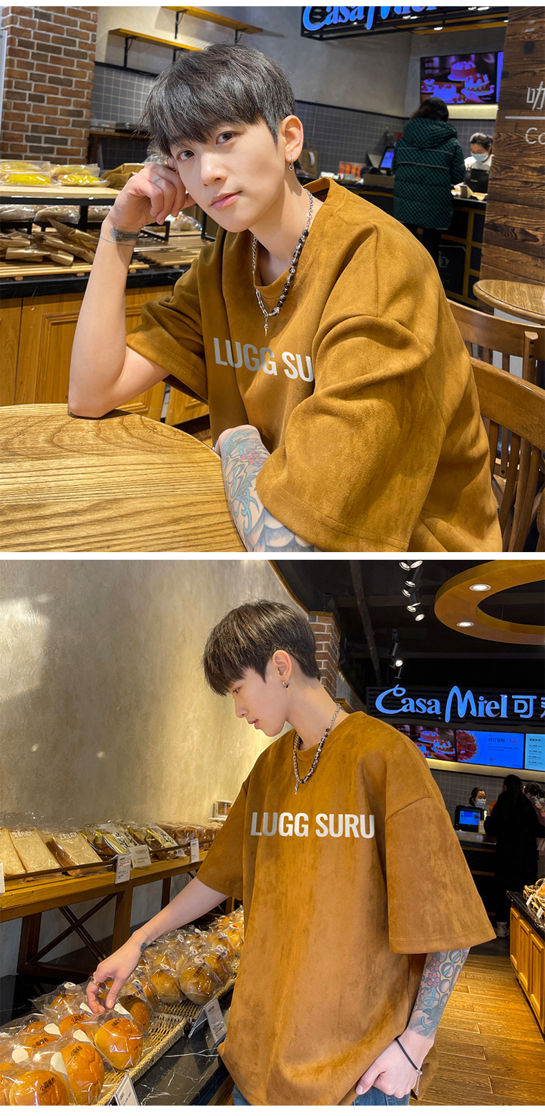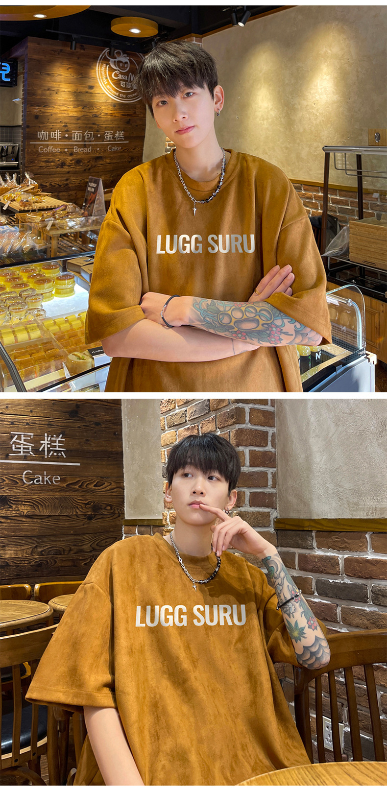 珀斯人青年麂皮绒短袖t恤宽松大码圆领印花打底衫男夏季情侣上衣