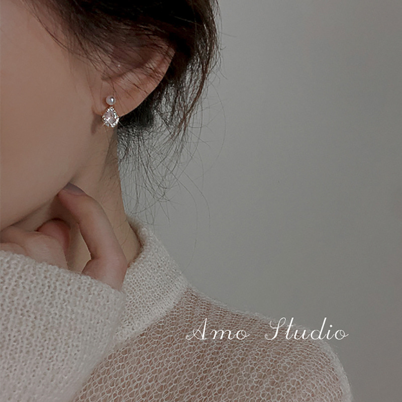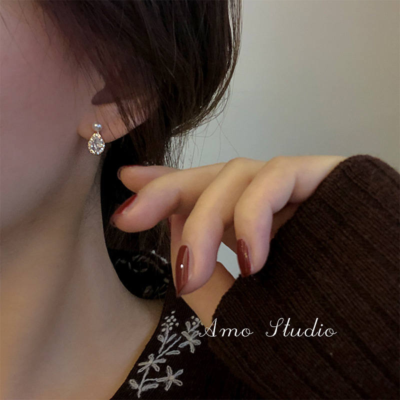 S925纯银镀金珍珠耳钉女 水滴满钻气质小众设计感高级耳饰新款潮