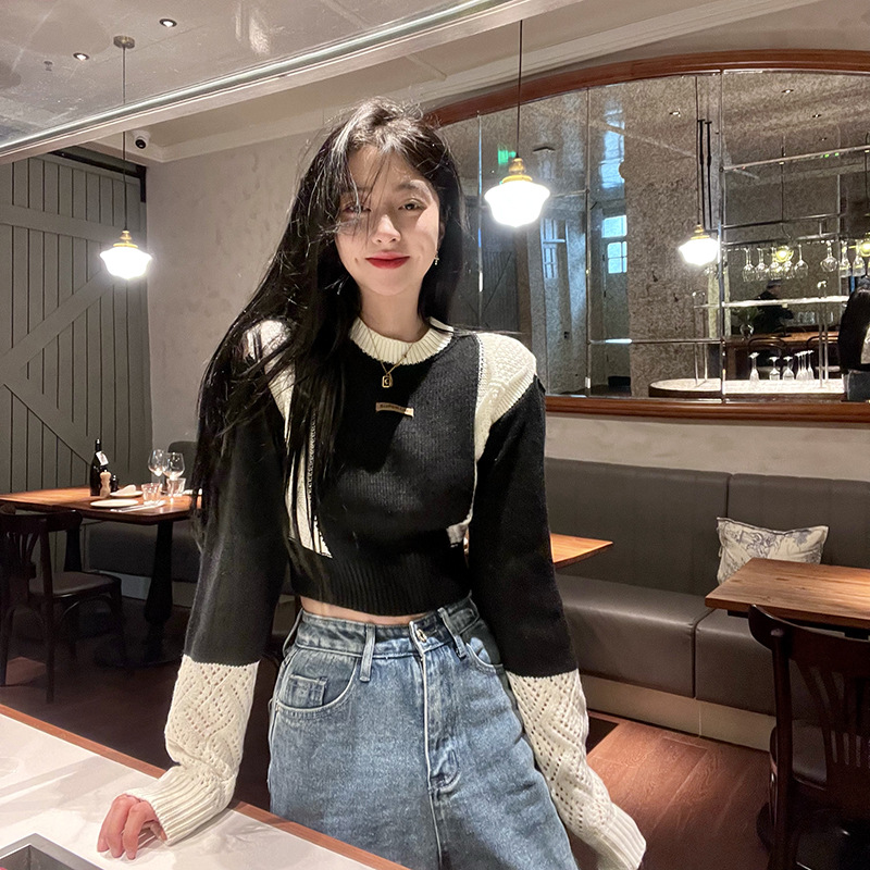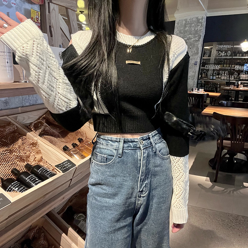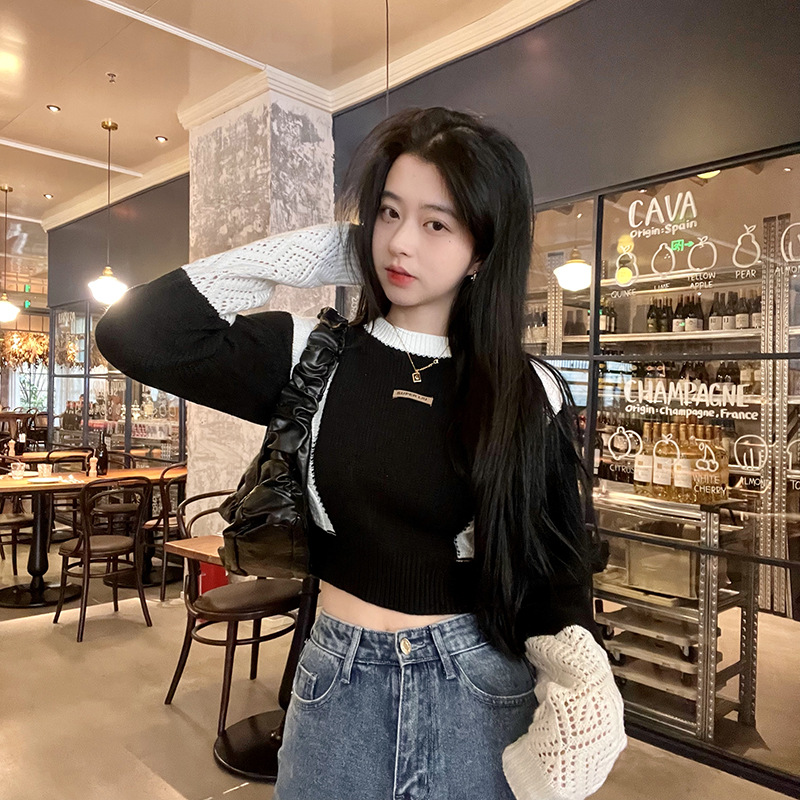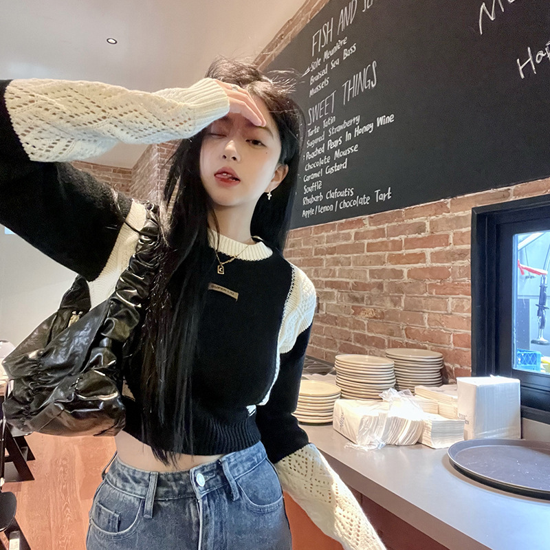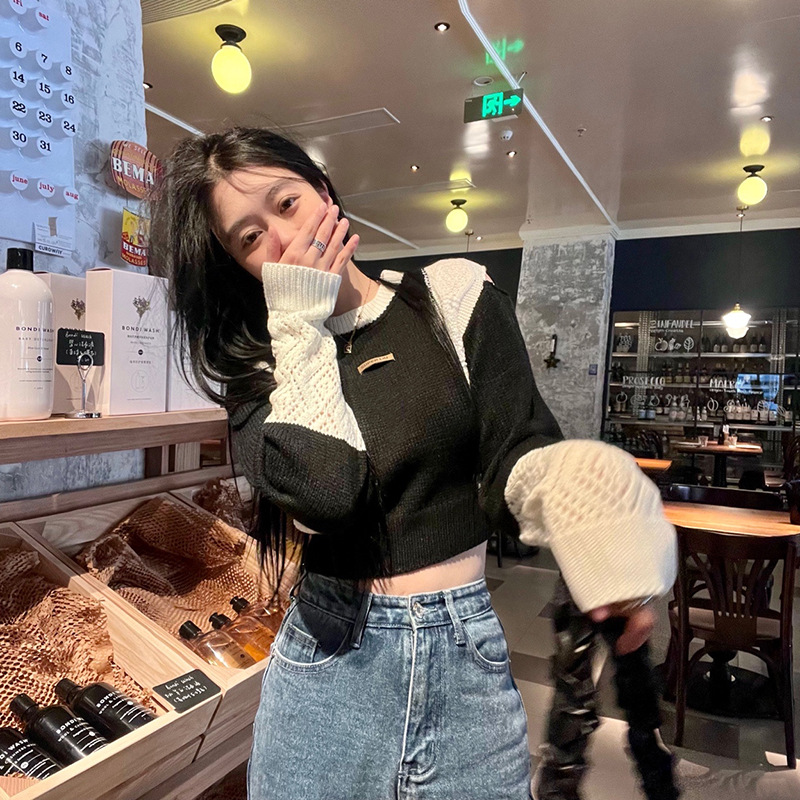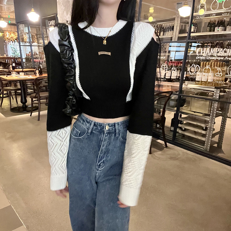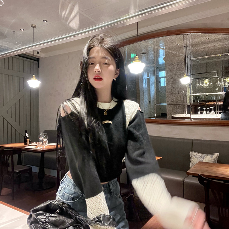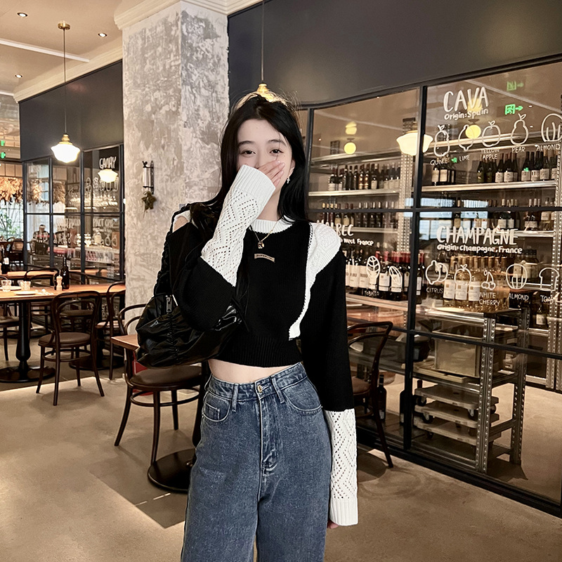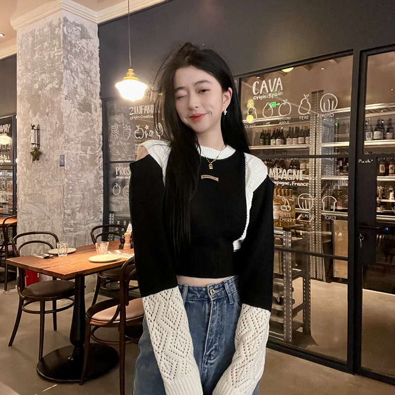 甜酷风黑白拼色毛衣秋季2023新款露肩镂空设计感小众针织衫上衣女
