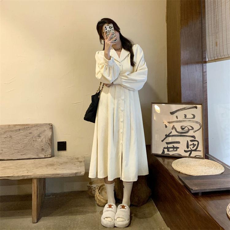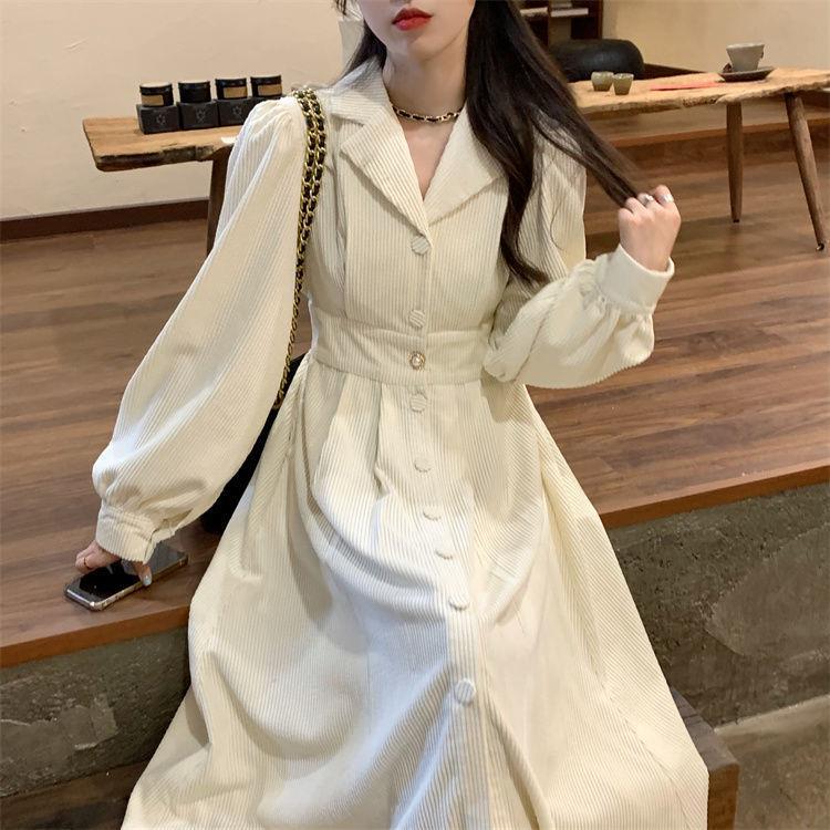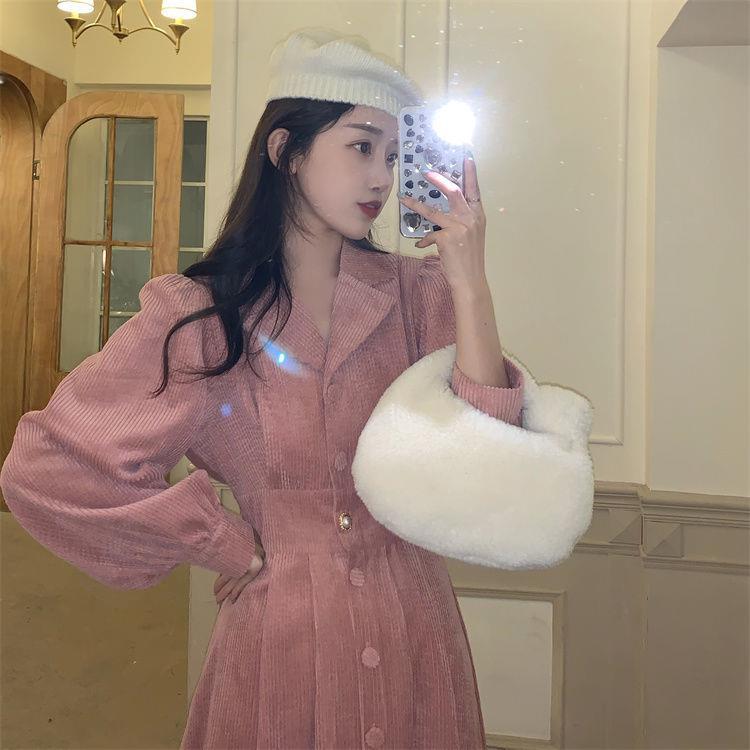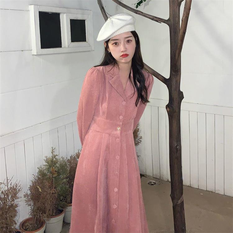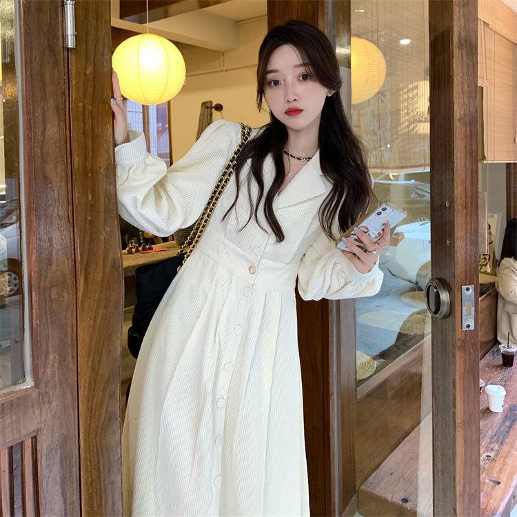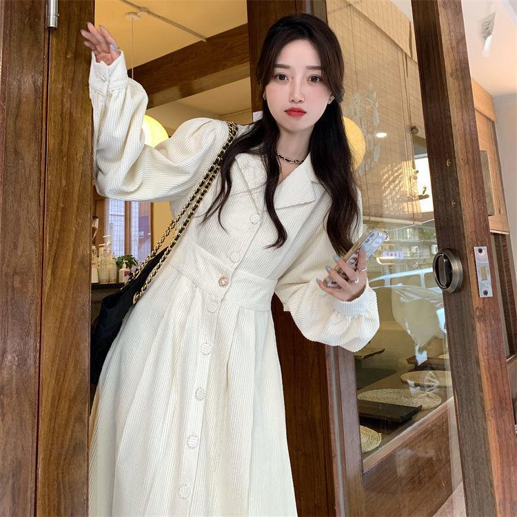 灯芯绒连衣裙女装秋冬2023新款法式西装领设计感可甜可盐中长裙子
