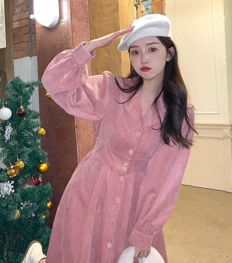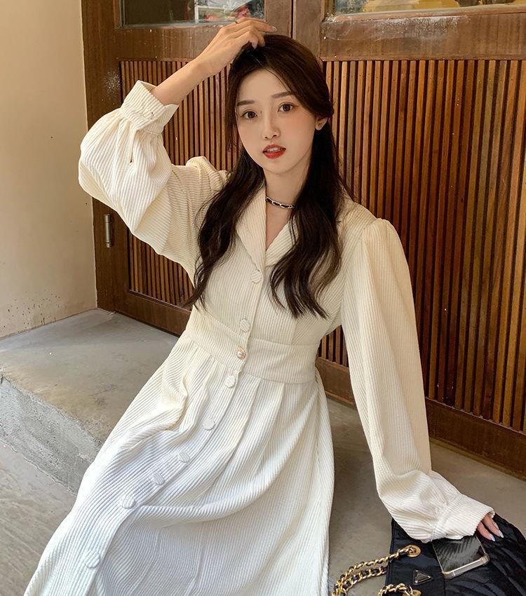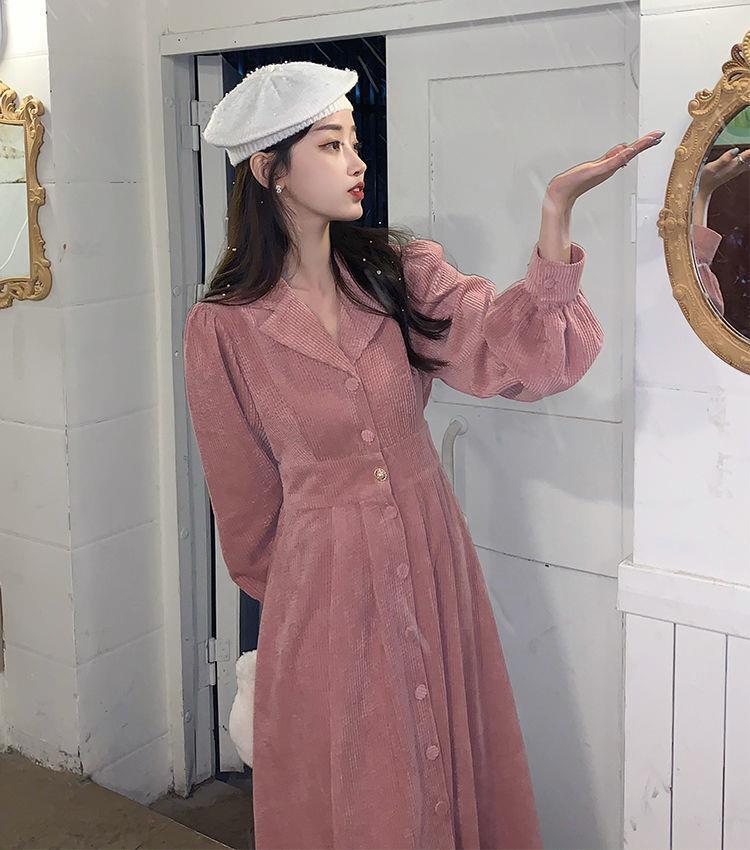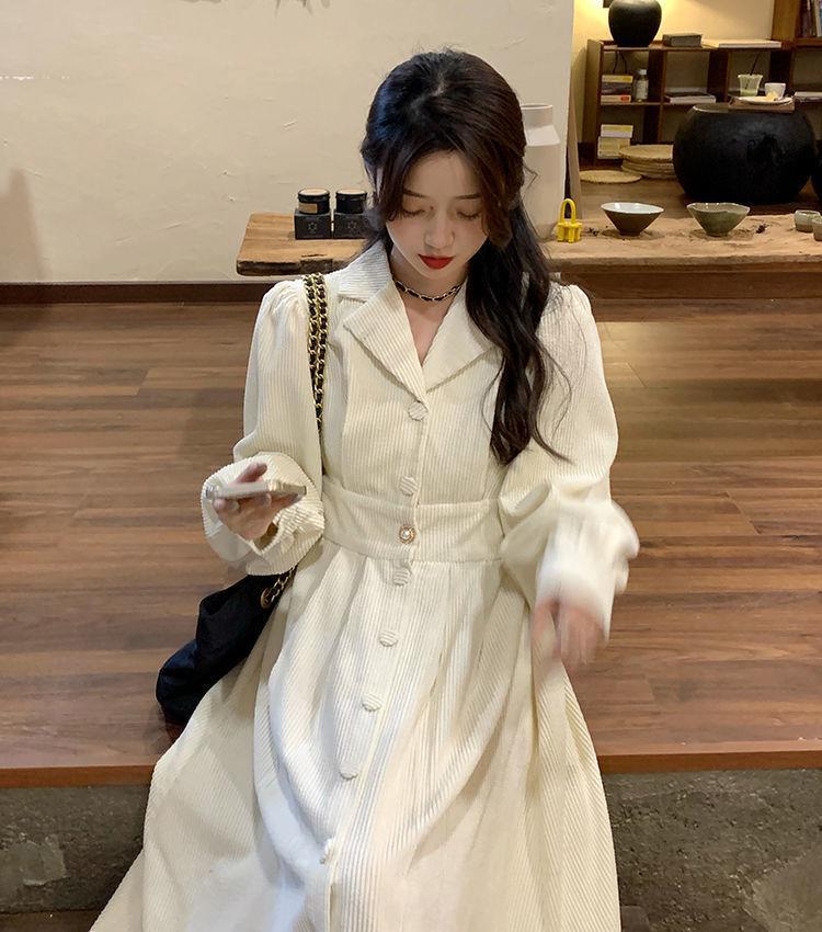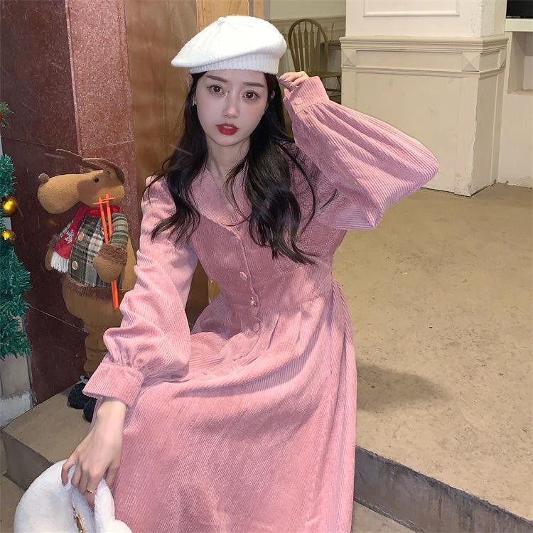灯芯绒连衣裙女装秋冬2023新款法式西装领设计感可甜可盐中长裙子
