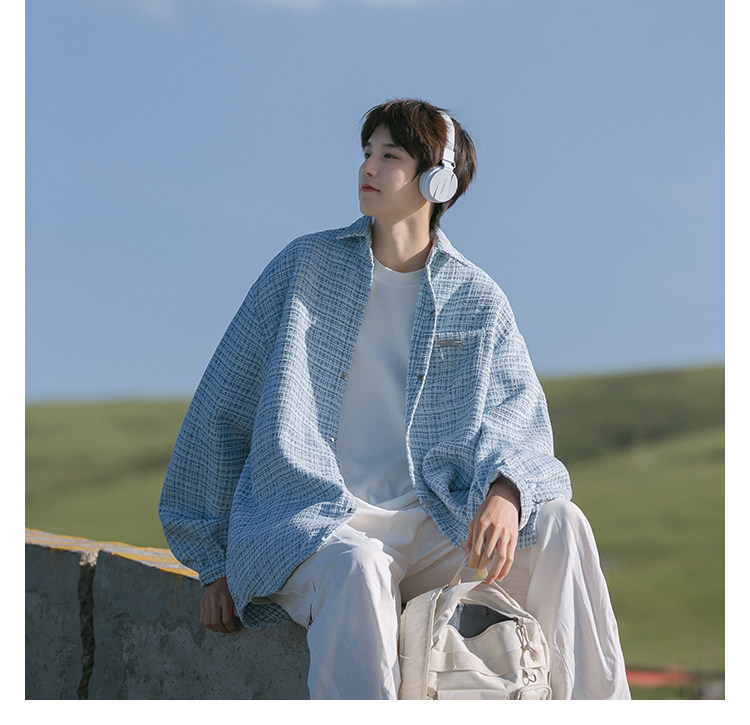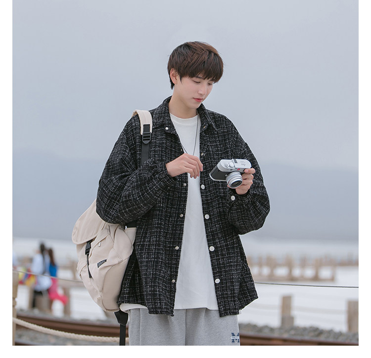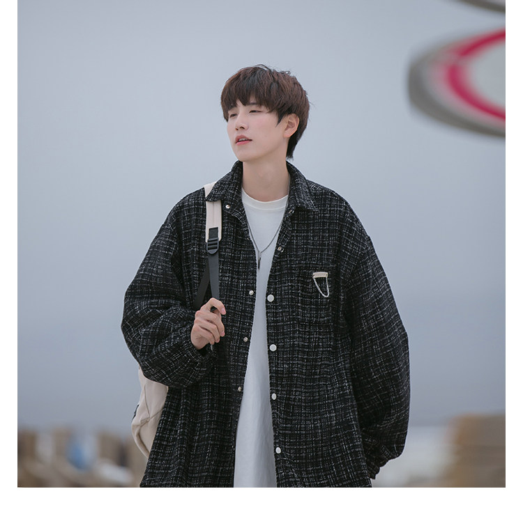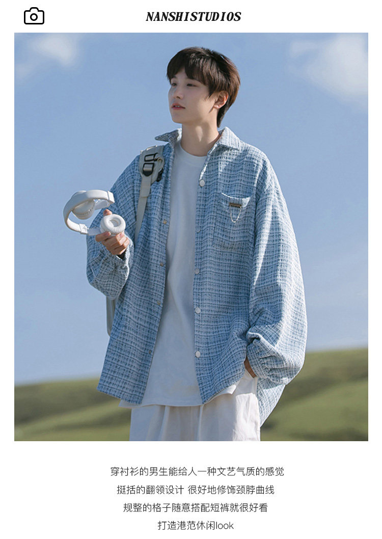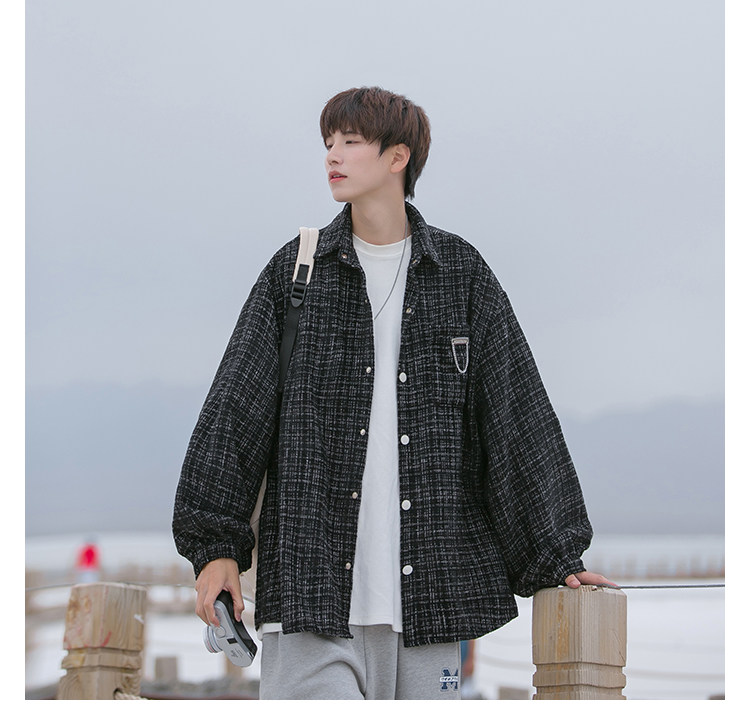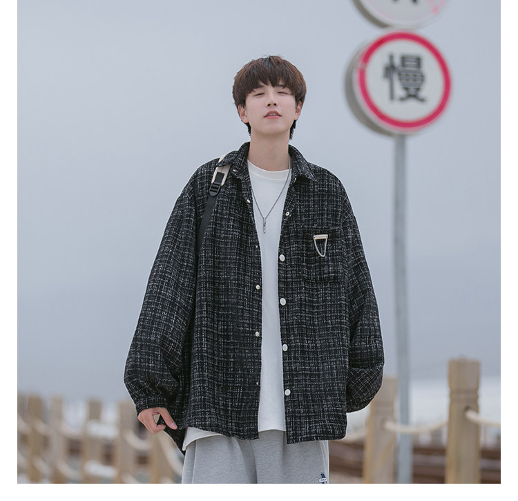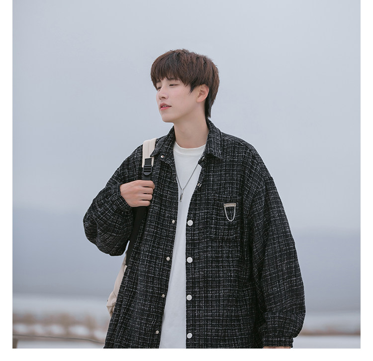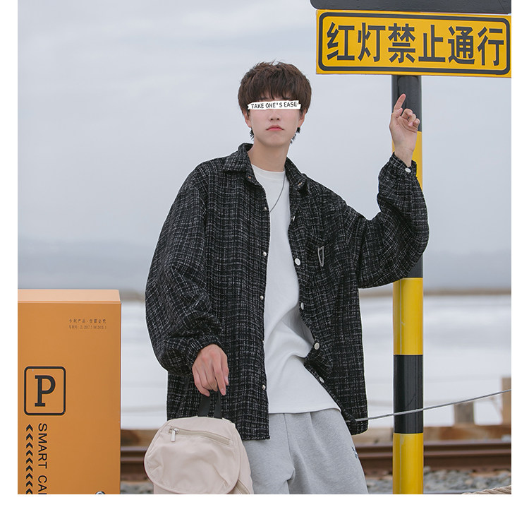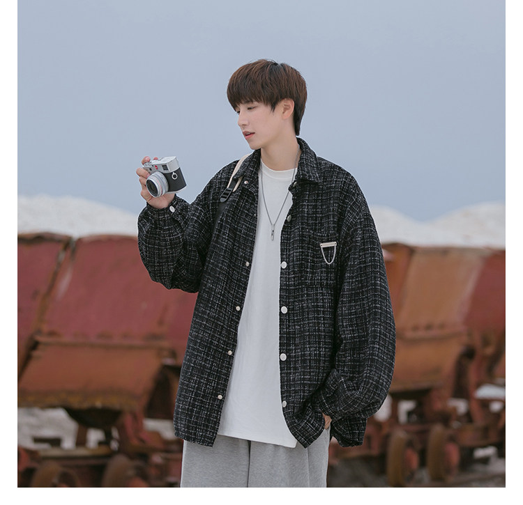 高级小香风衬衫男士春秋潮牌宽松青少年长袖衬衣美式复古痞帅外套
