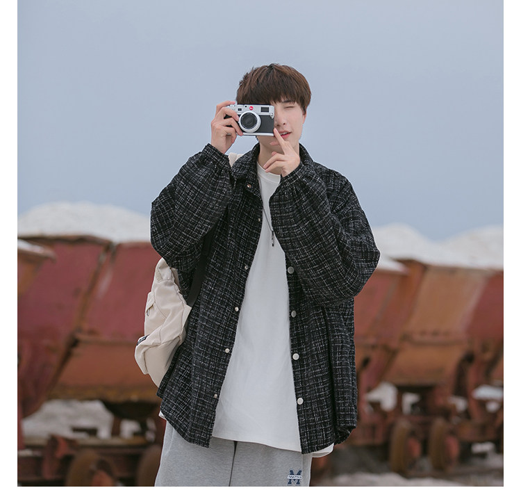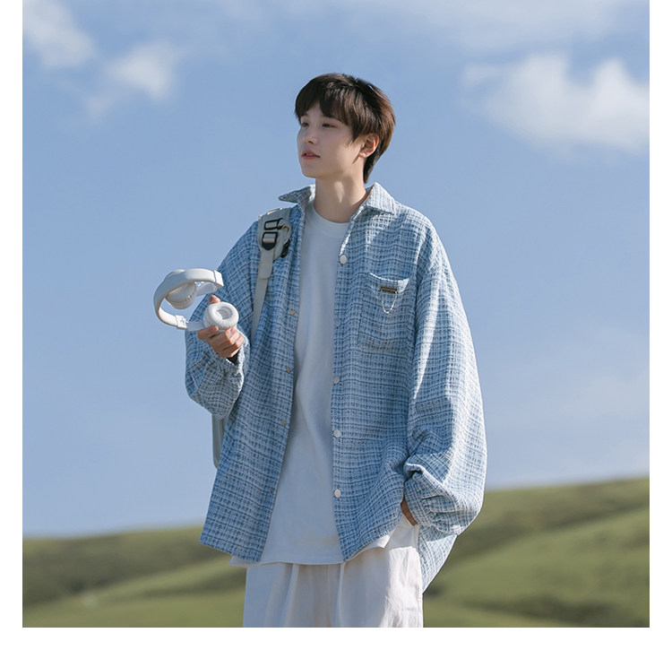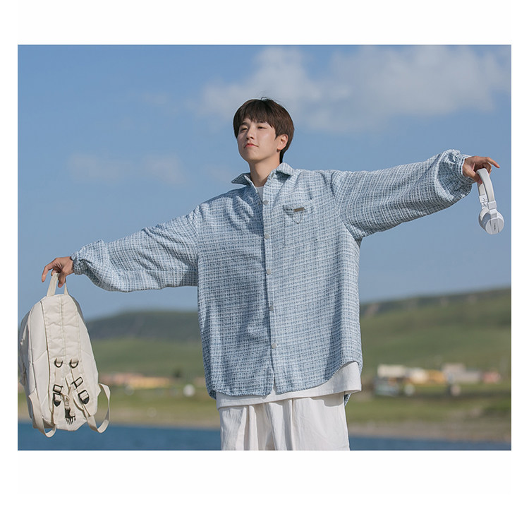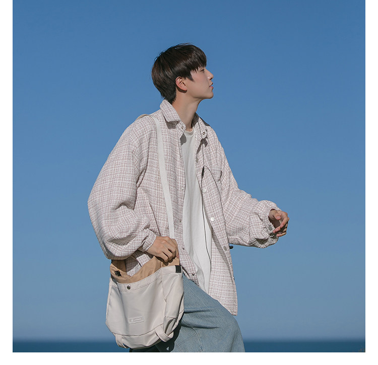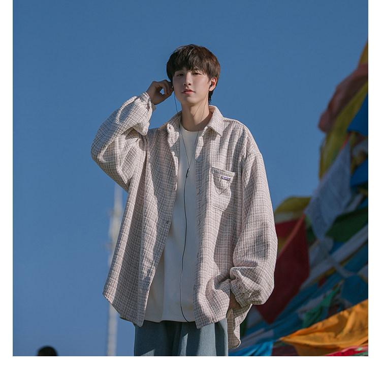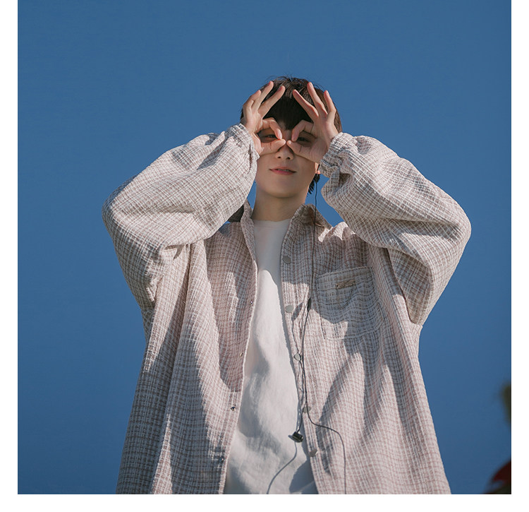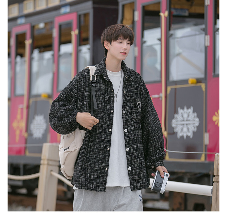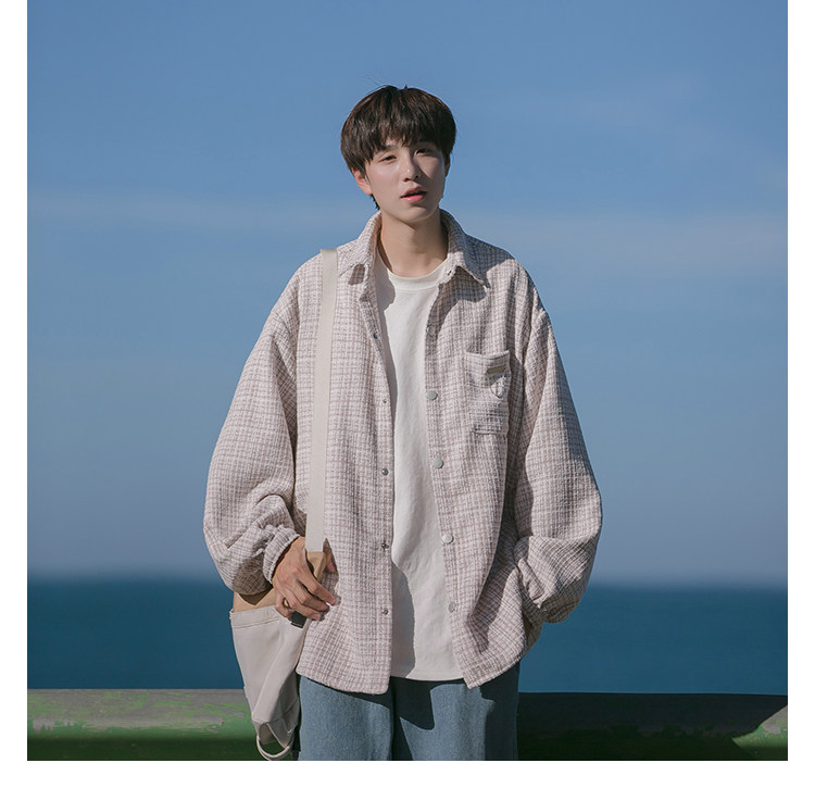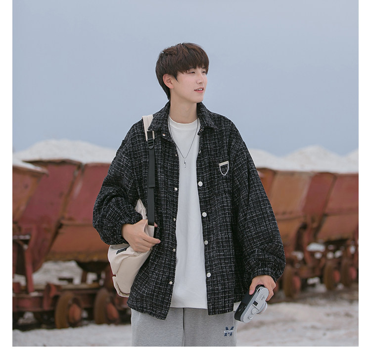 高级小香风衬衫男士春秋潮牌宽松青少年长袖衬衣美式复古痞帅外套