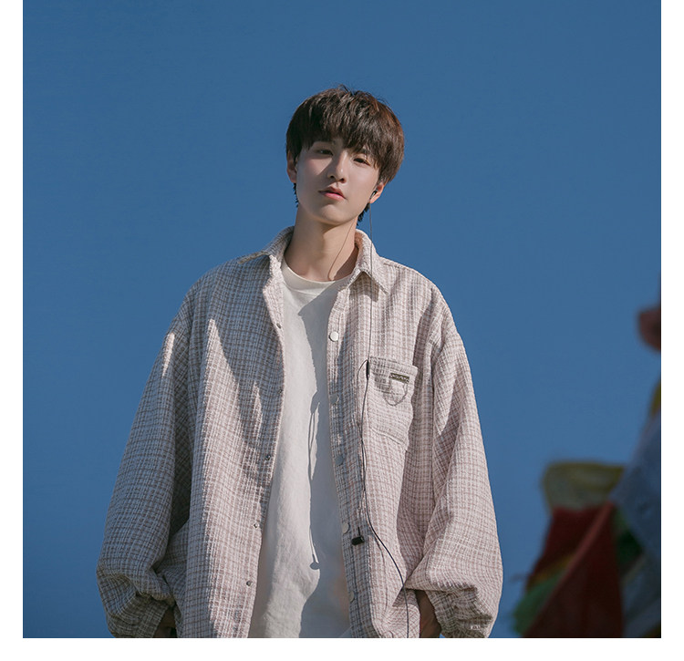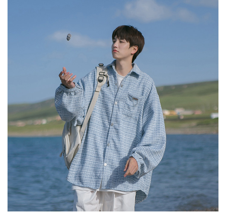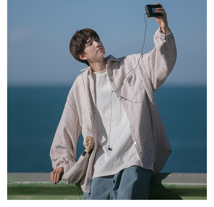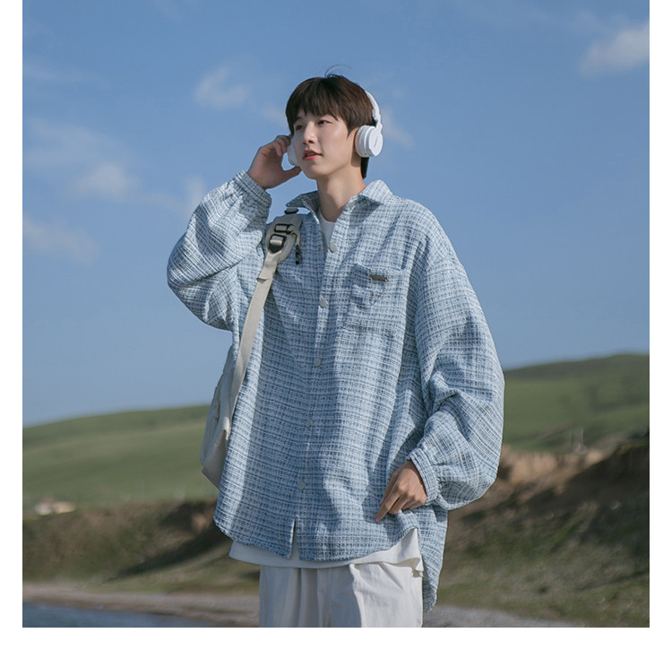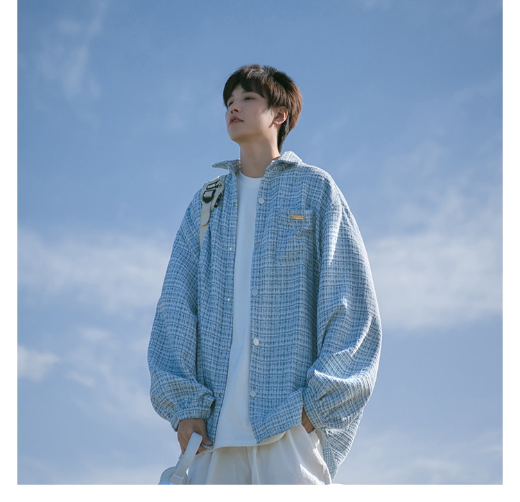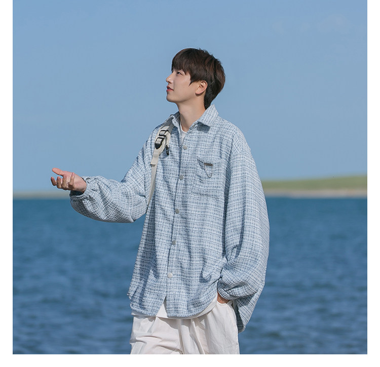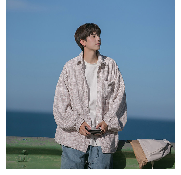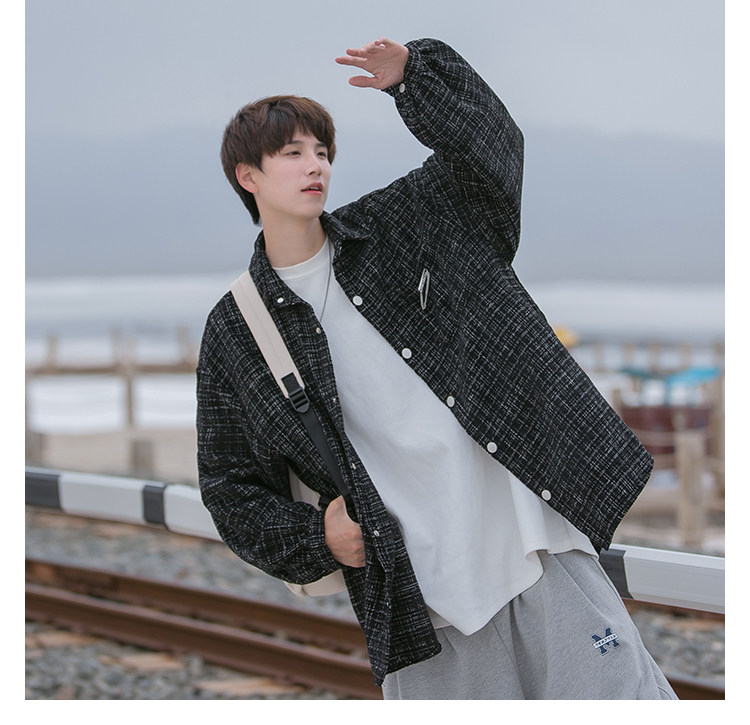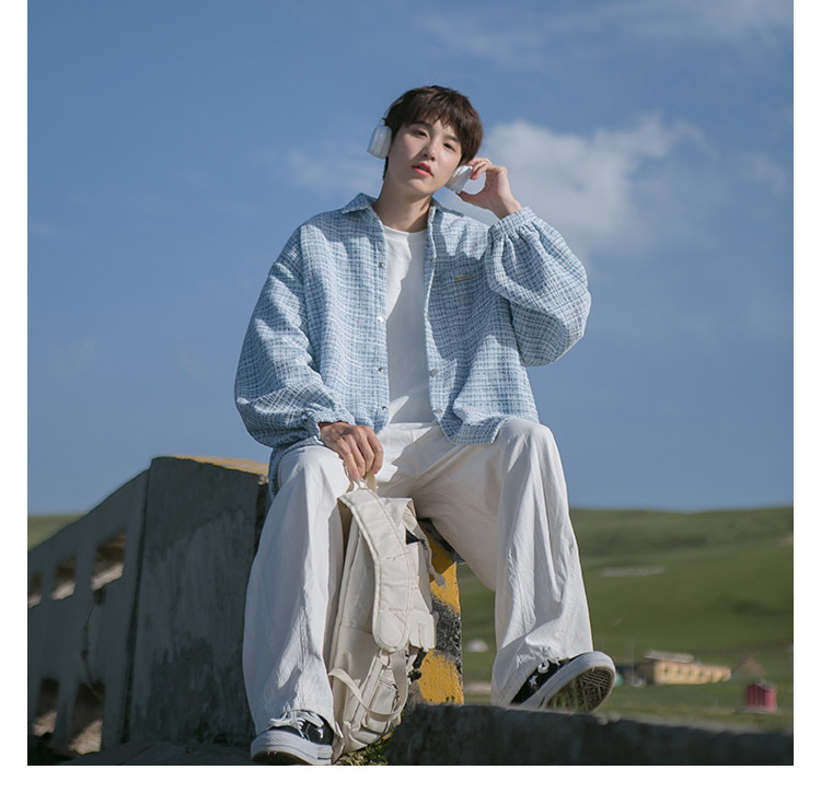 高级小香风衬衫男士春秋潮牌宽松青少年长袖衬衣美式复古痞帅外套