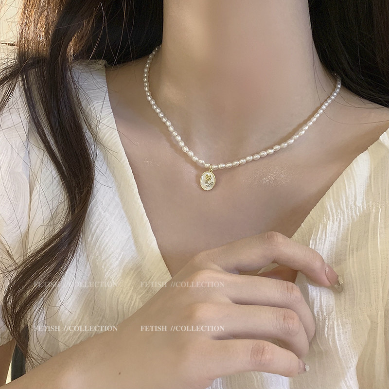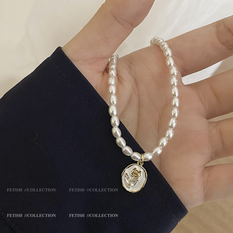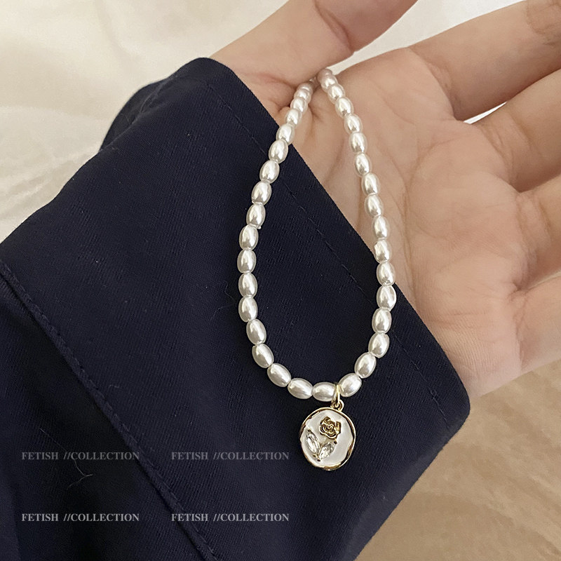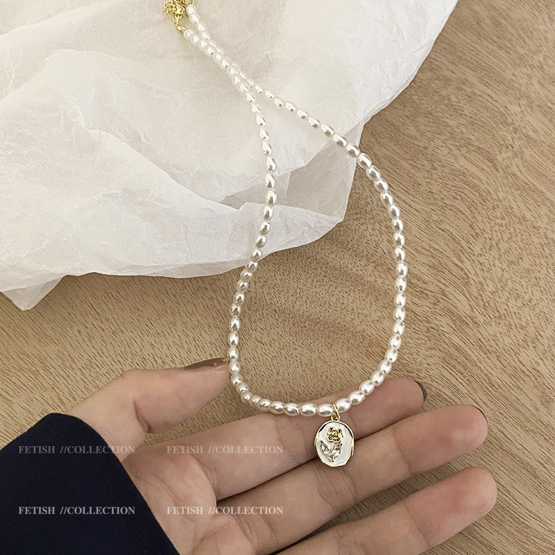 法式复古玫瑰花牌吊坠珍珠项链女轻奢小众设计感高级锁骨链配饰品