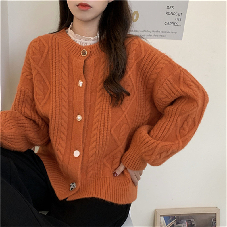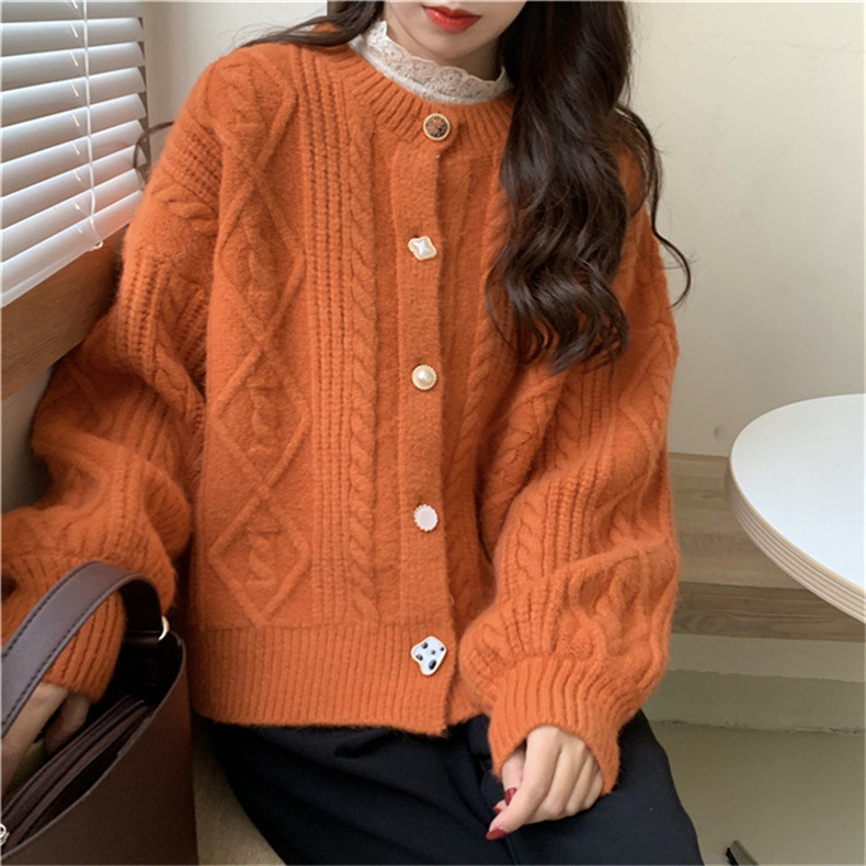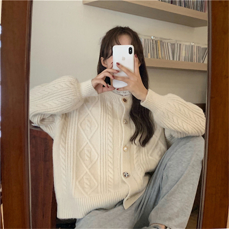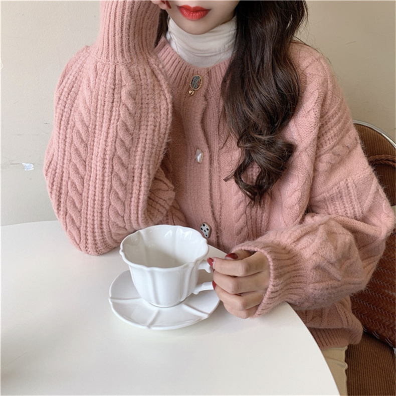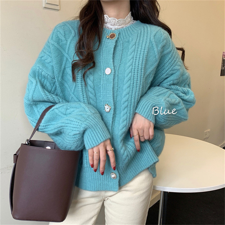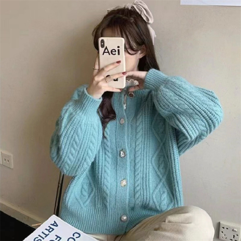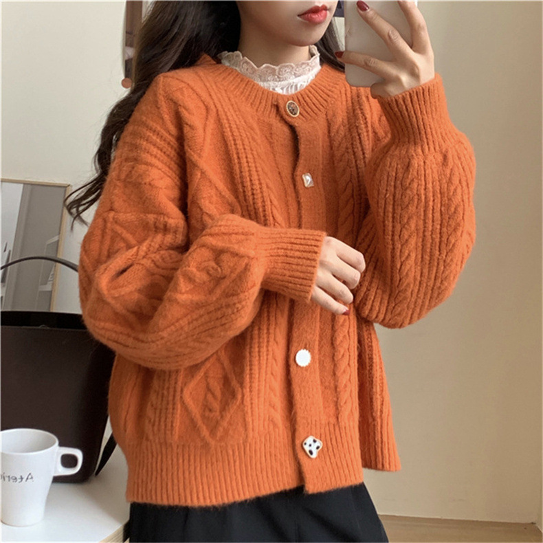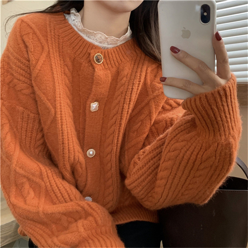 法式复古麻花圆领毛衣外套女秋季新款灯笼袖宽松百搭针织开衫女装
