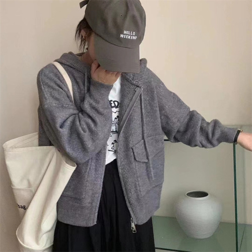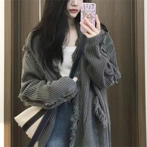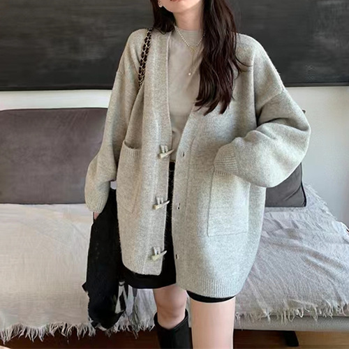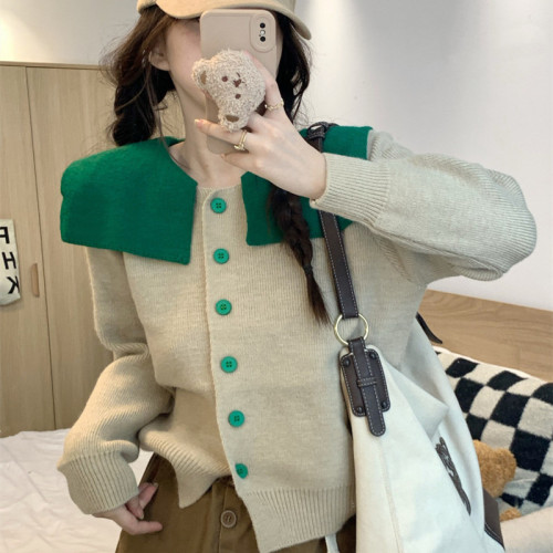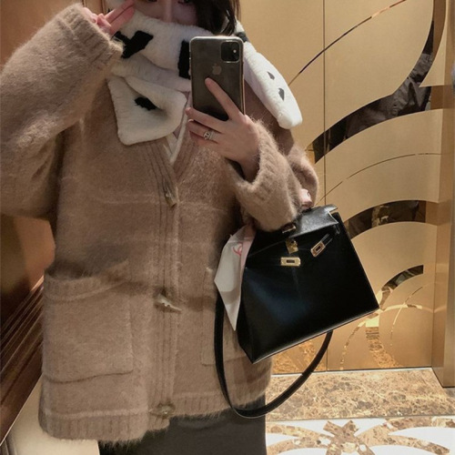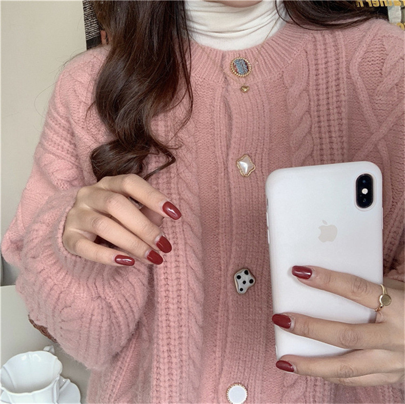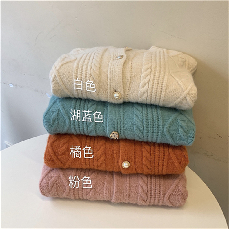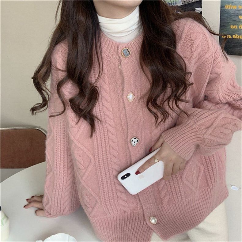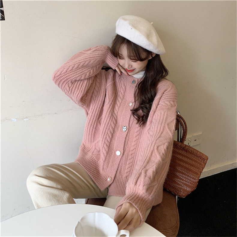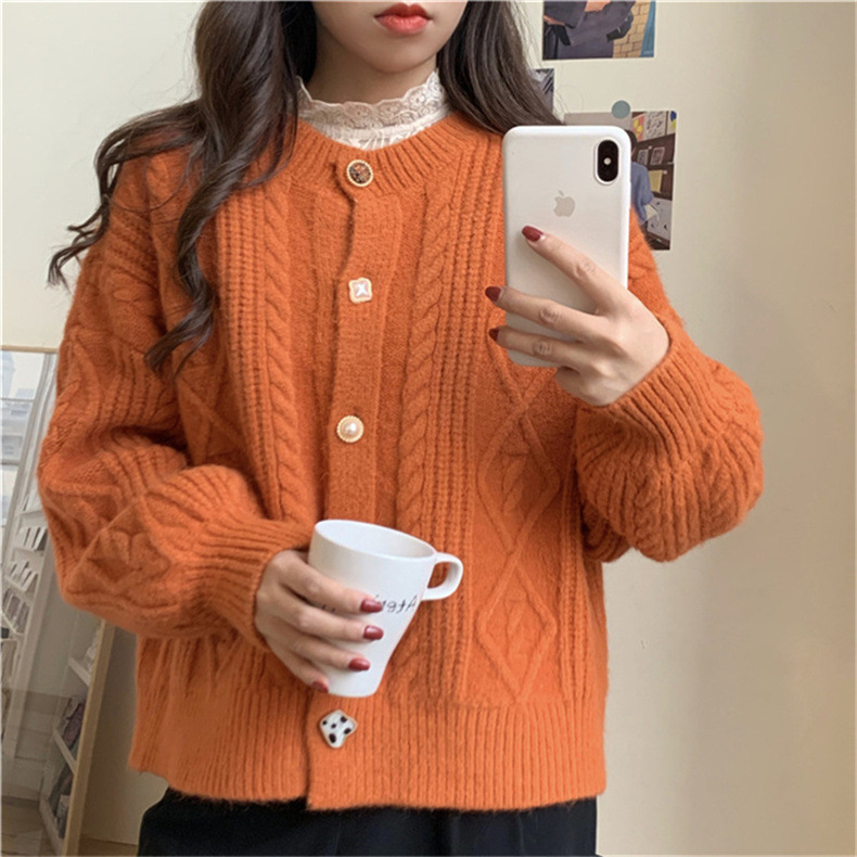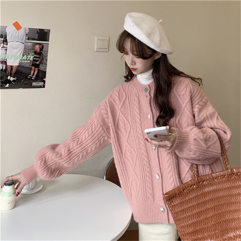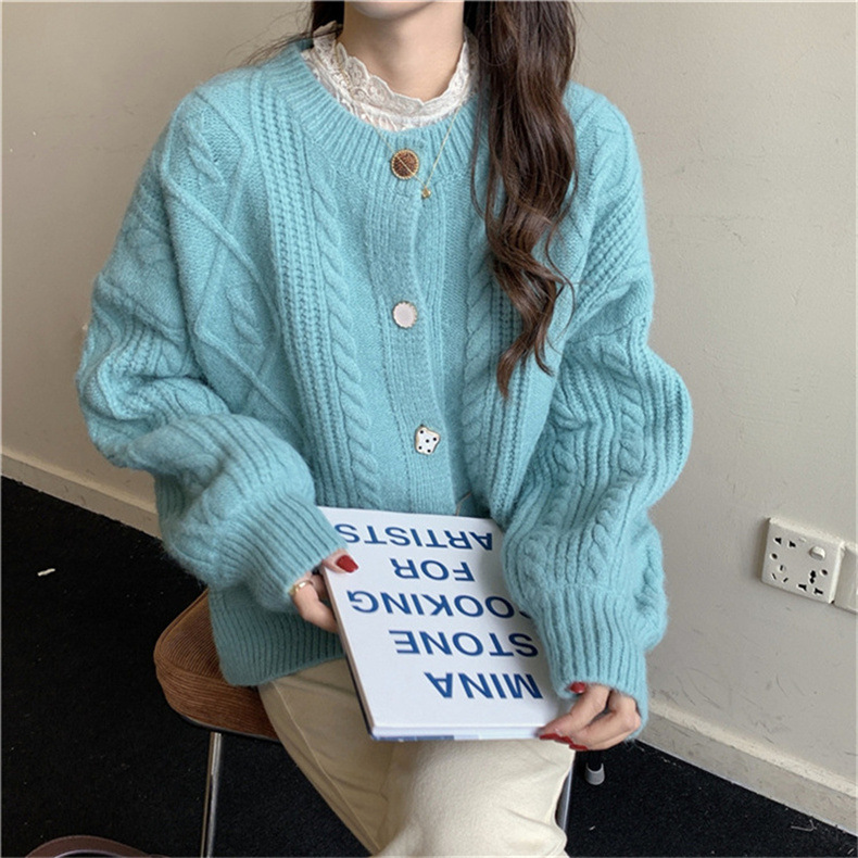 法式复古麻花圆领毛衣外套女秋季新款灯笼袖宽松百搭针织开衫女装