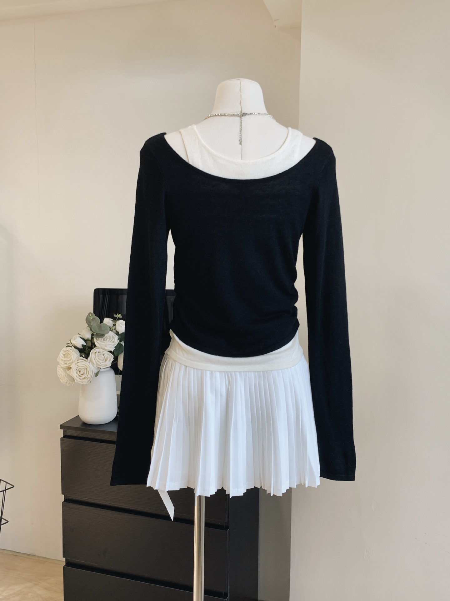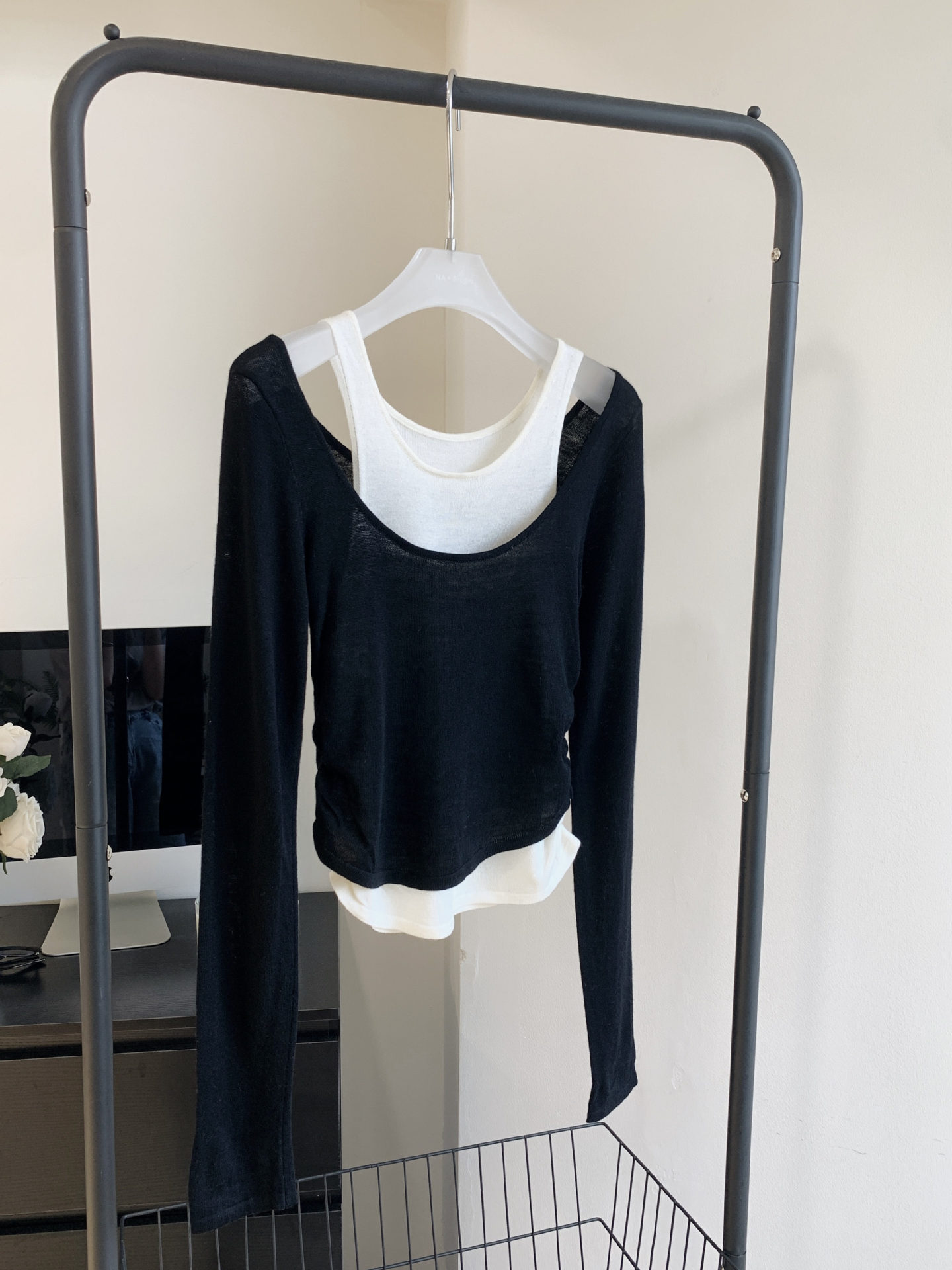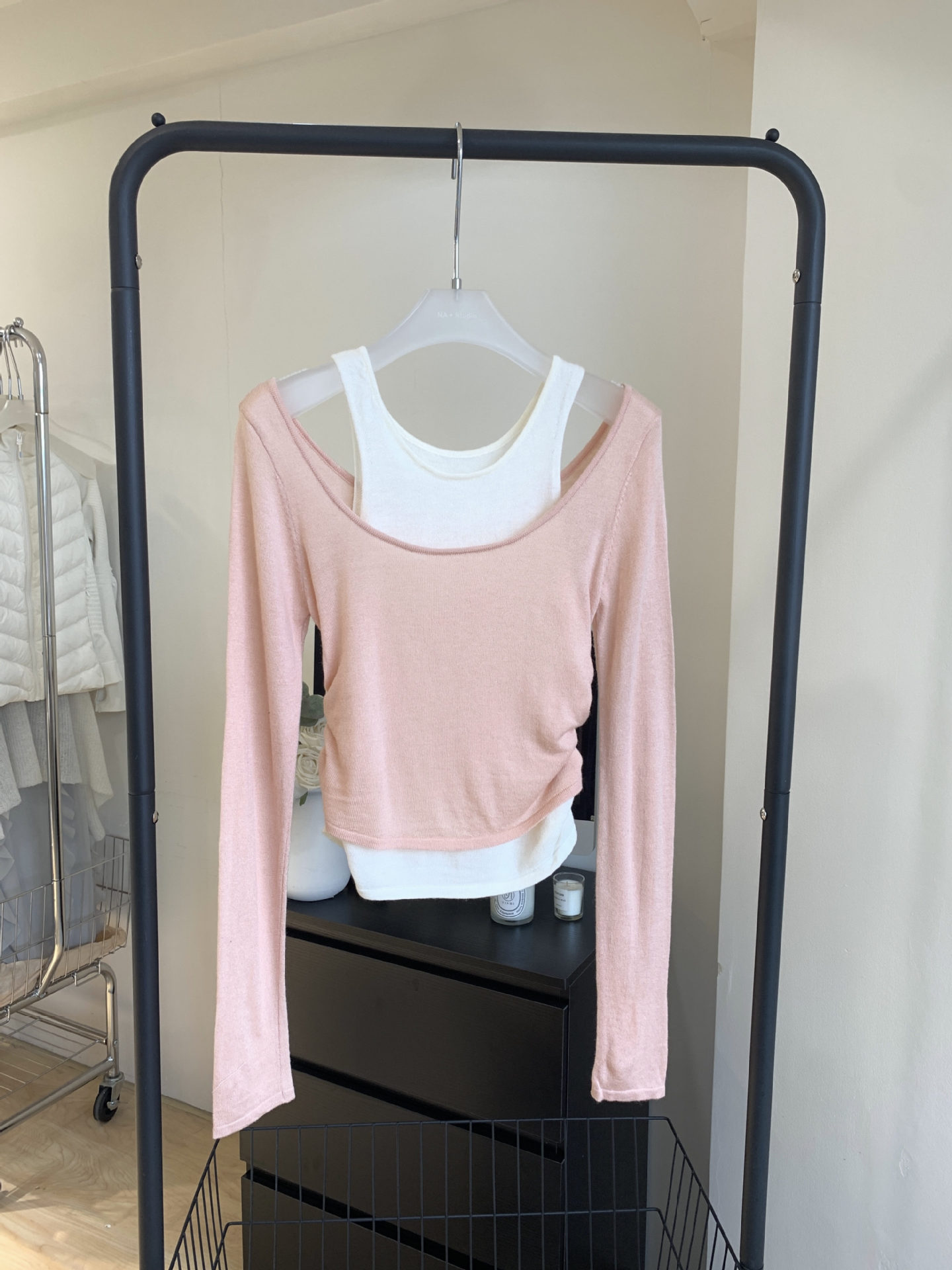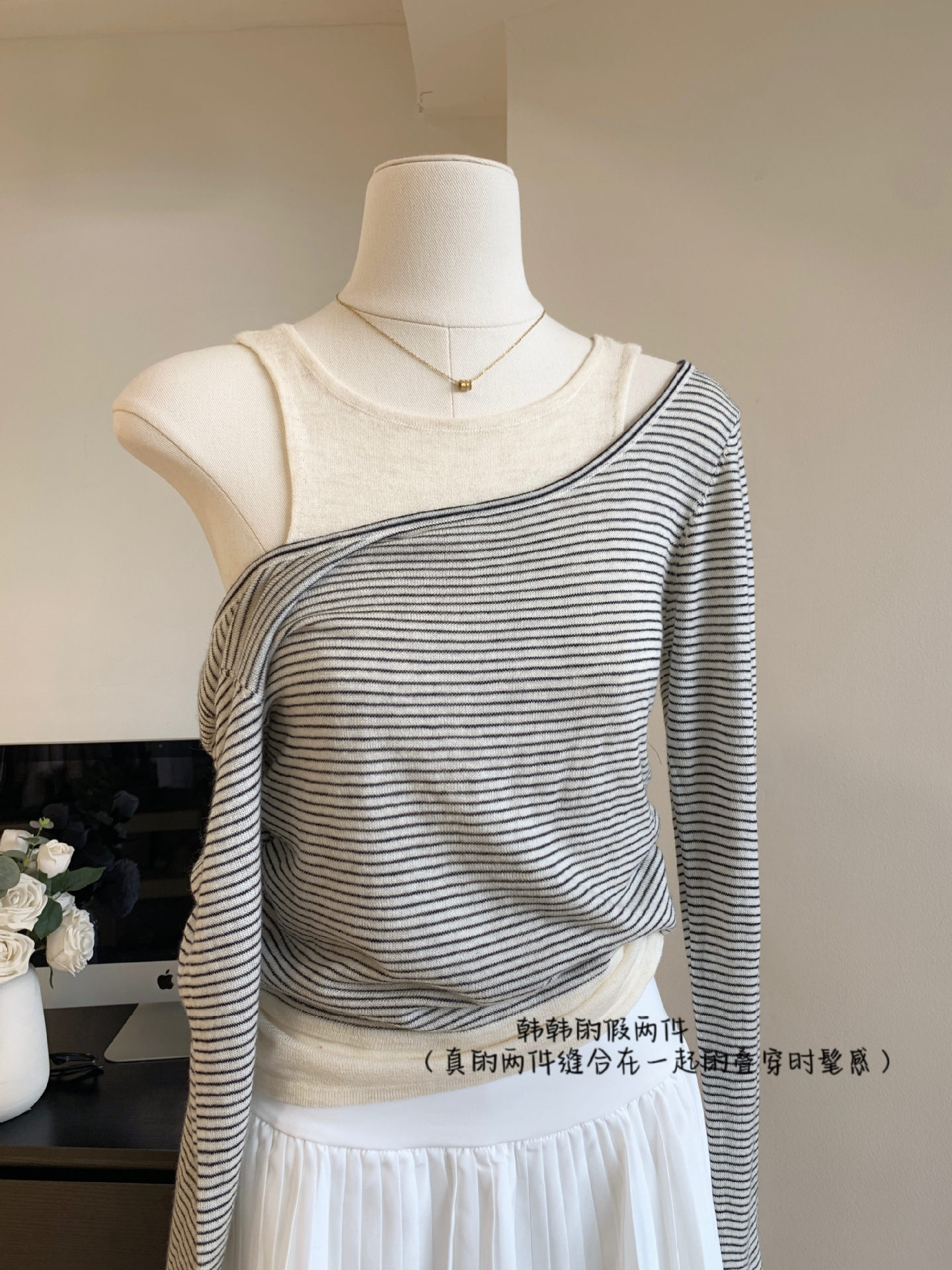 2023秋季新款假两件纯欲露肩针织衫长袖设计感温柔打底衫掐腰上衣