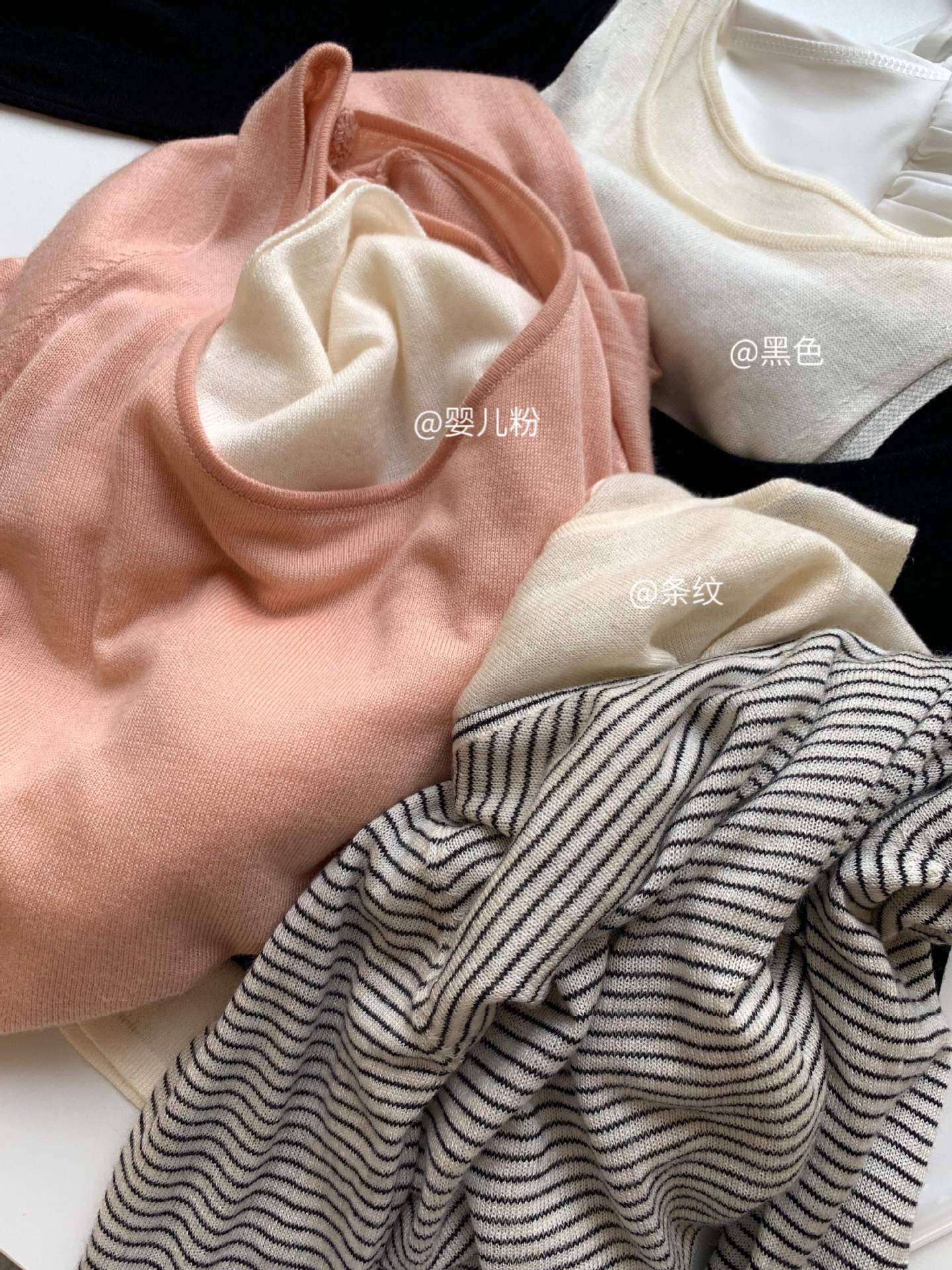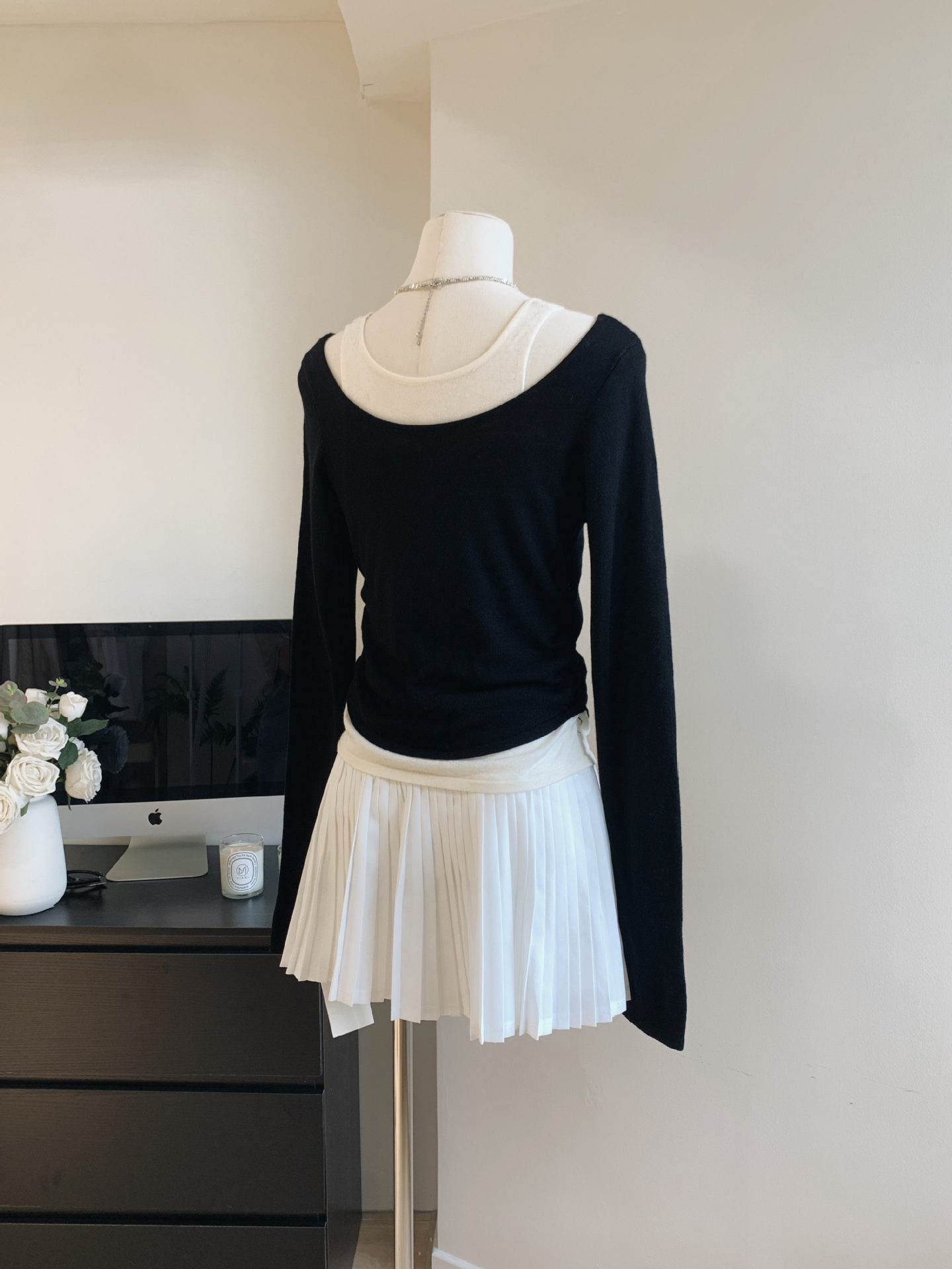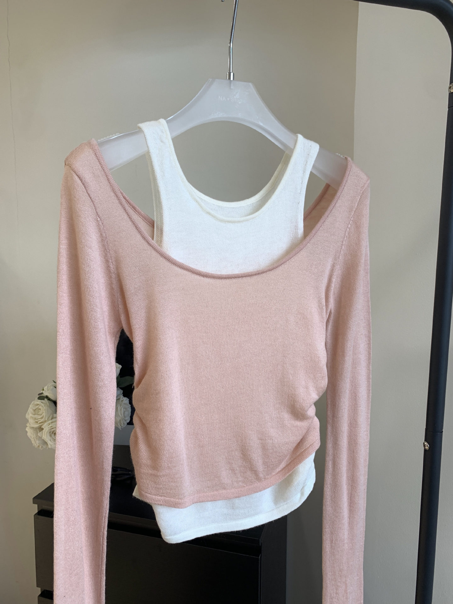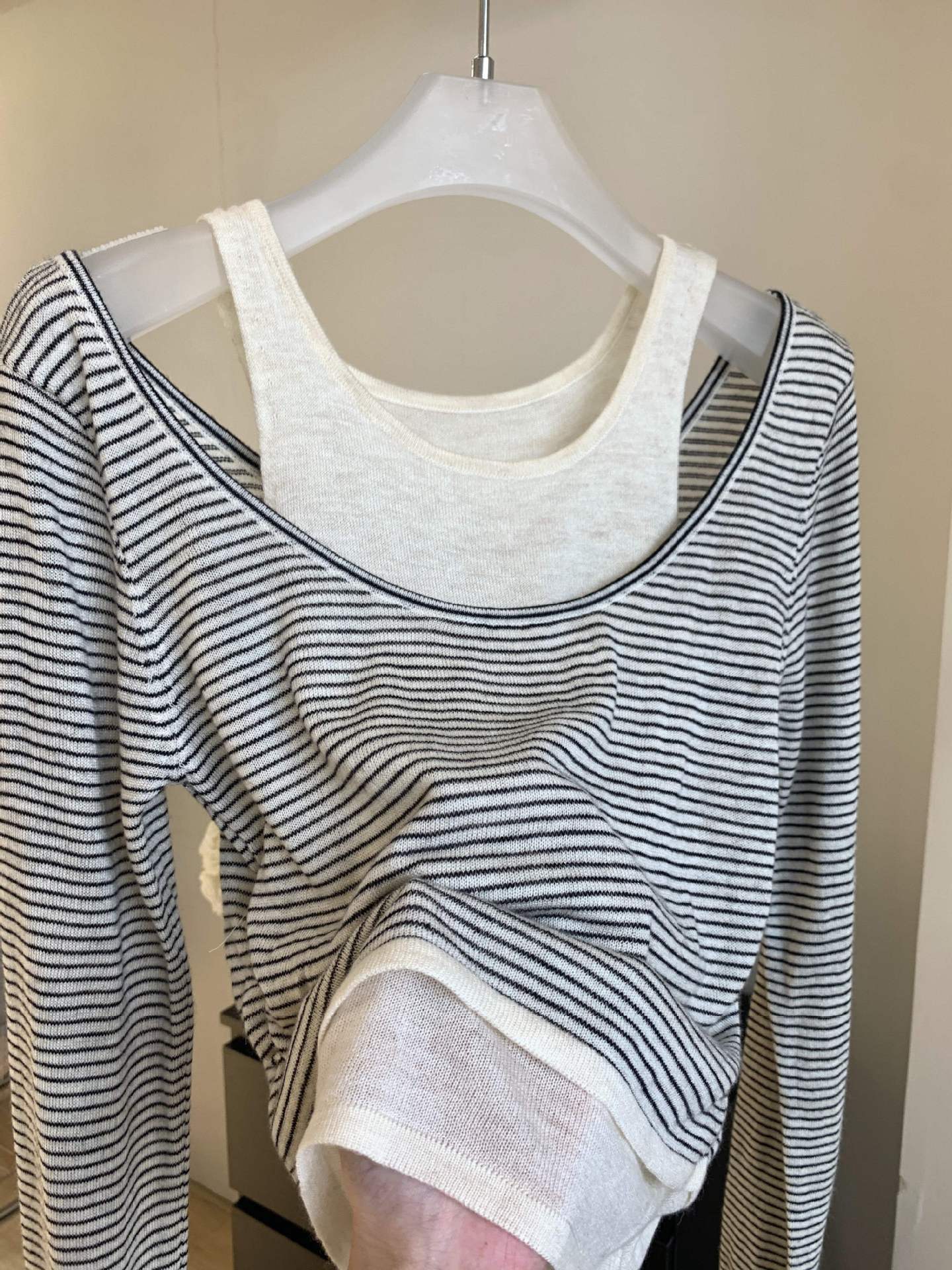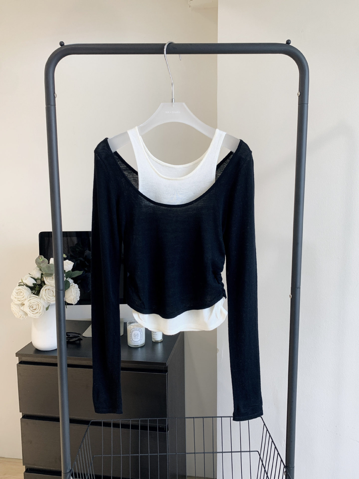 2023秋季新款假两件纯欲露肩针织衫长袖设计感温柔打底衫掐腰上衣