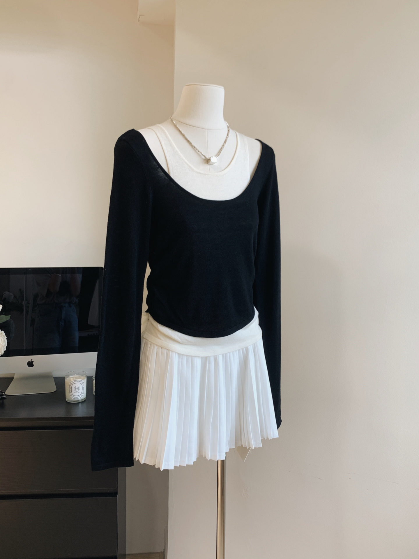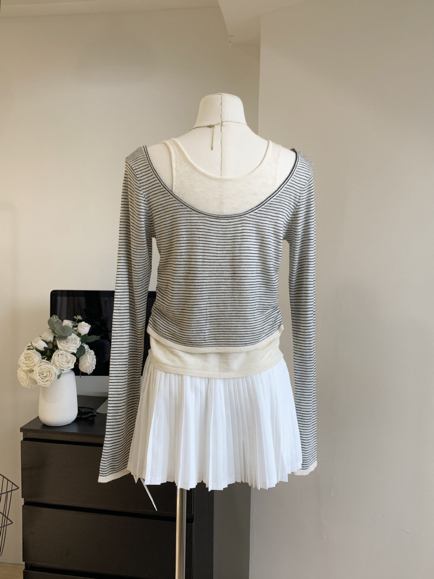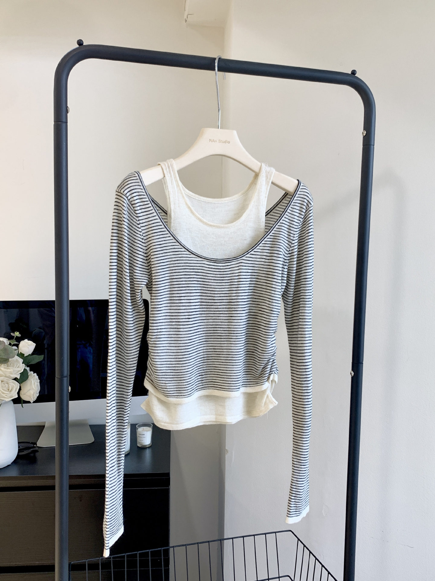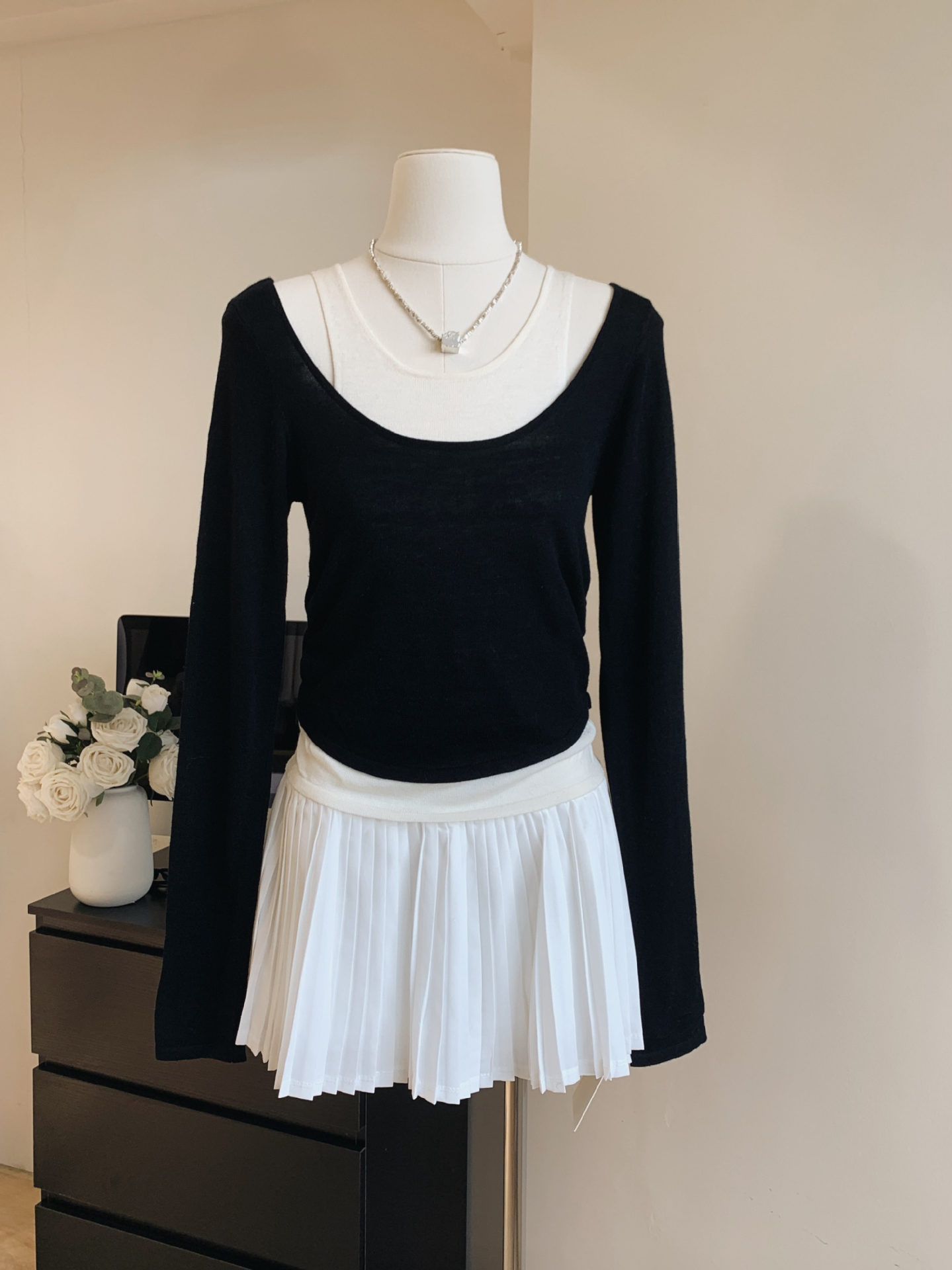 2023秋季新款假两件纯欲露肩针织衫长袖设计感温柔打底衫掐腰上衣
