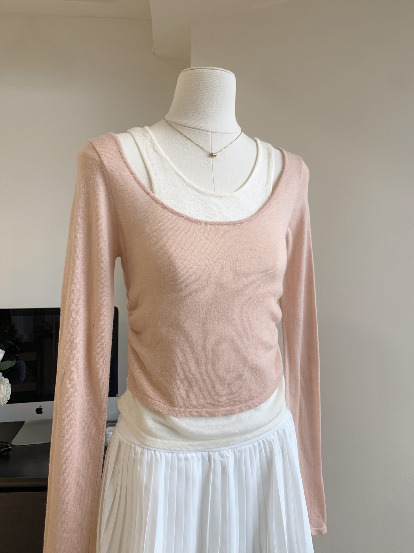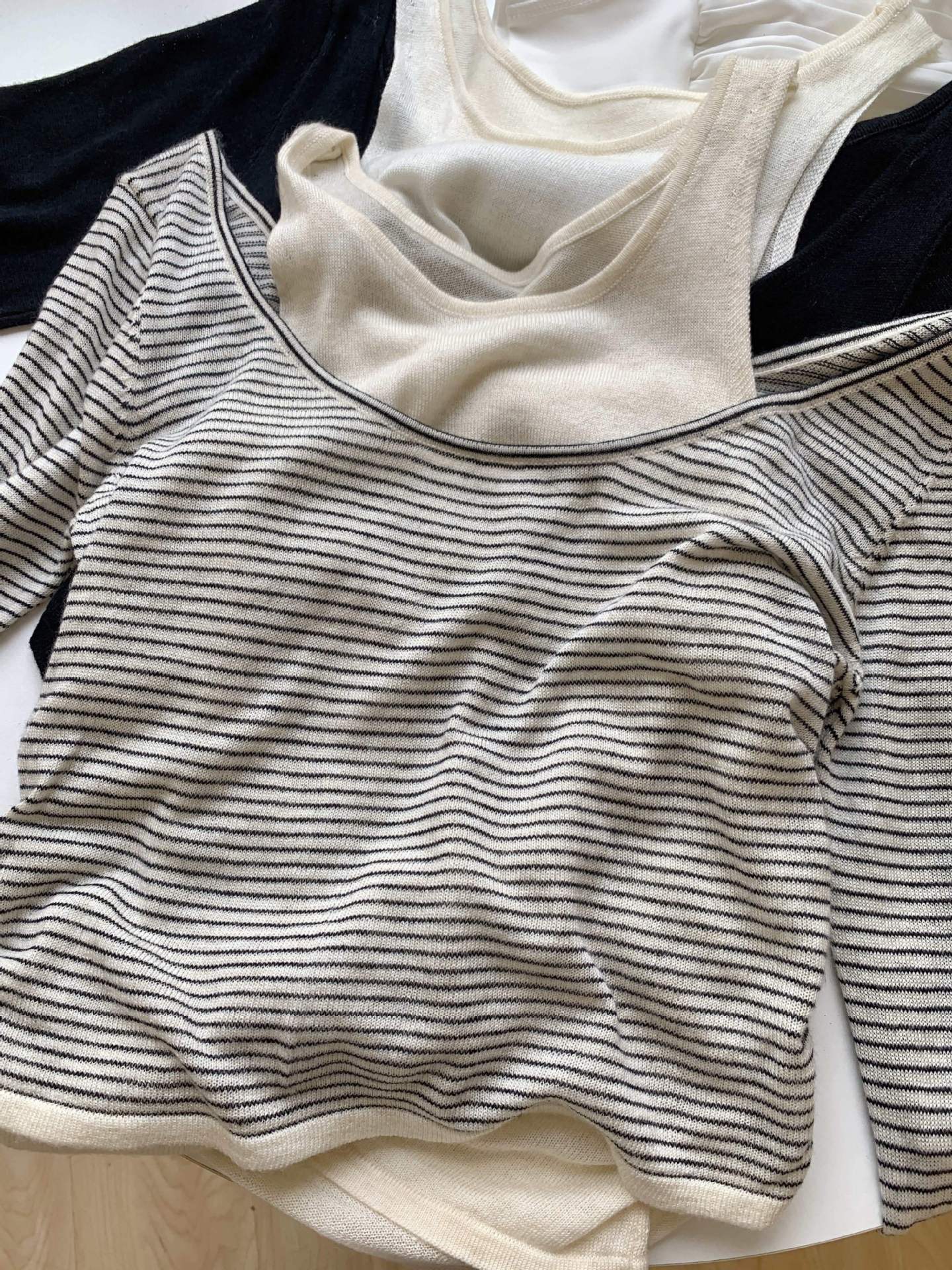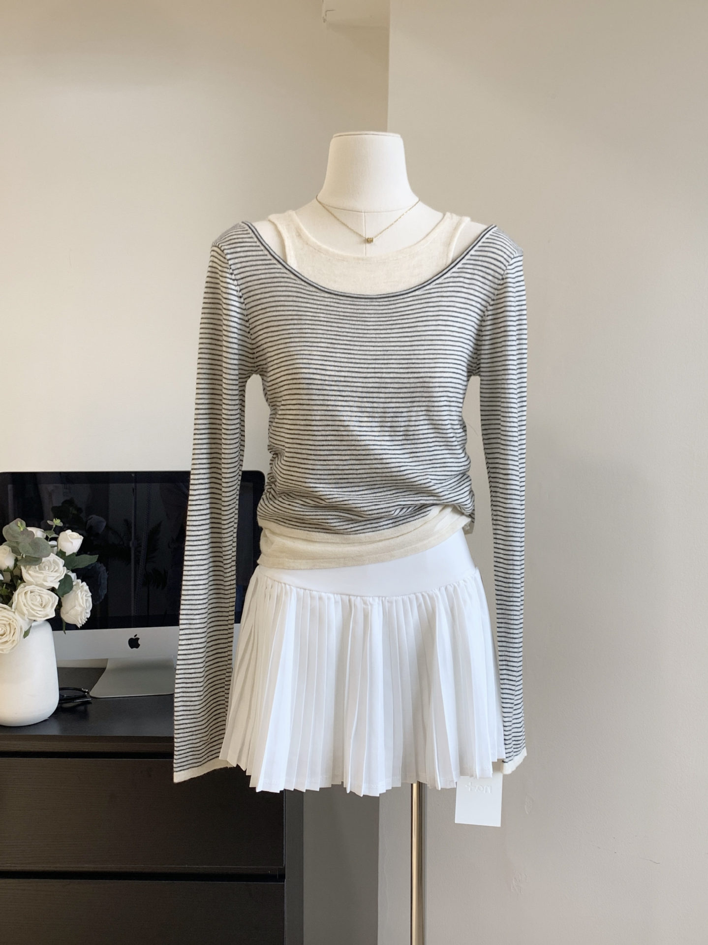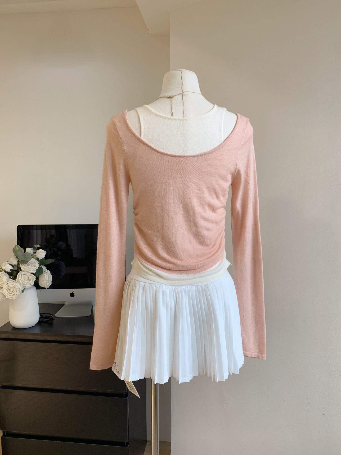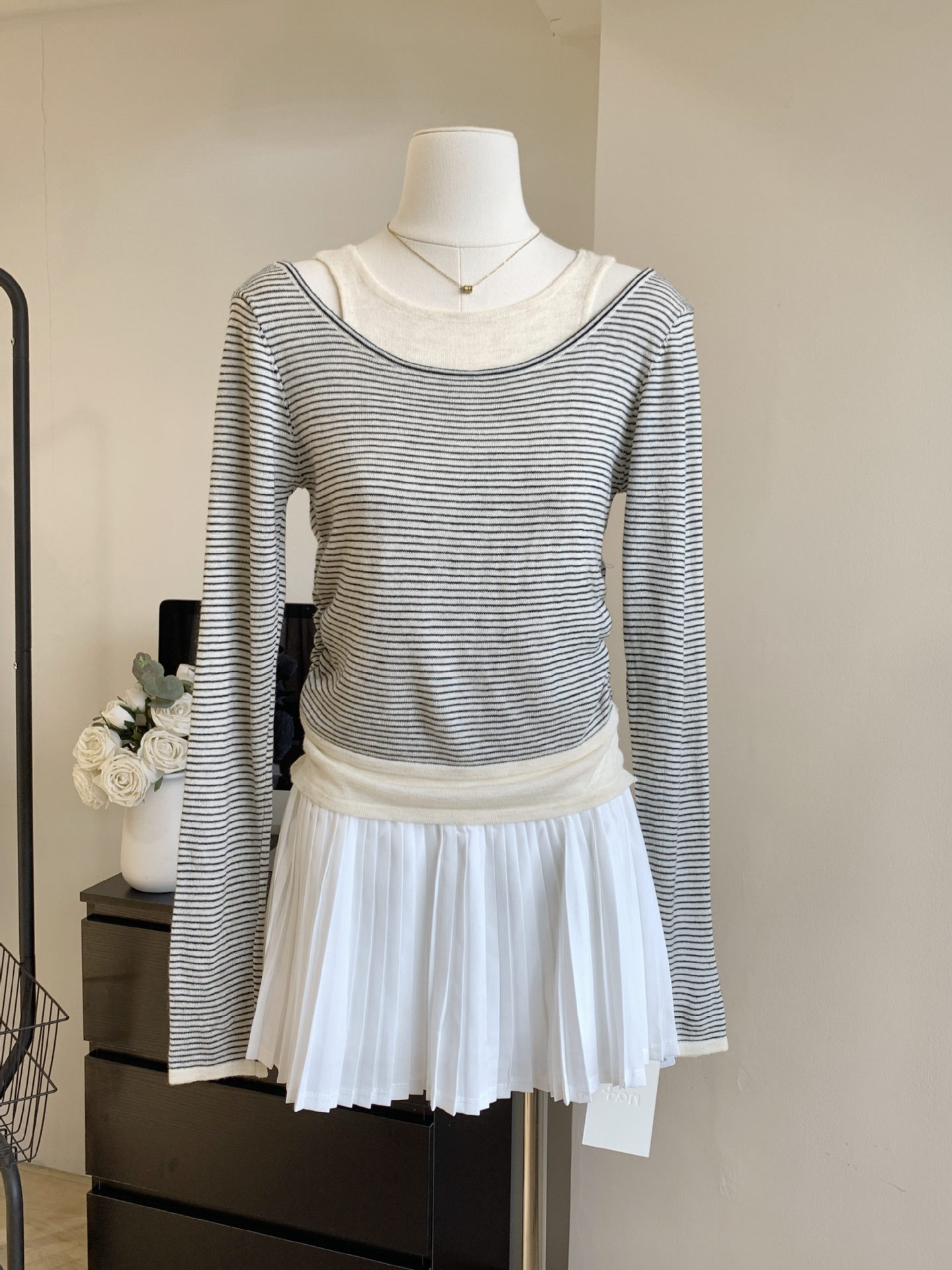 2023秋季新款假两件纯欲露肩针织衫长袖设计感温柔打底衫掐腰上衣