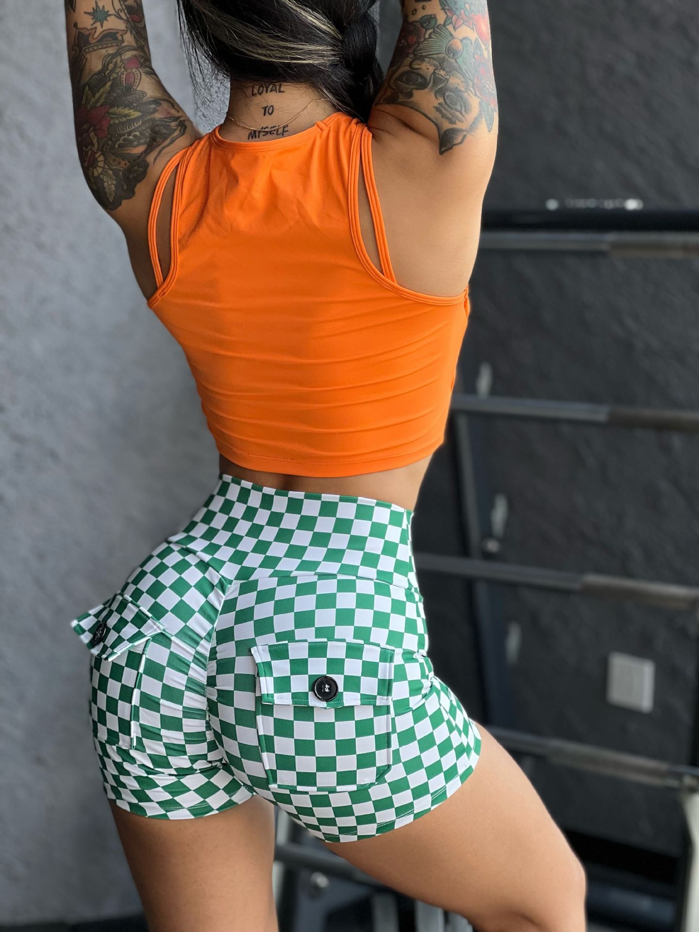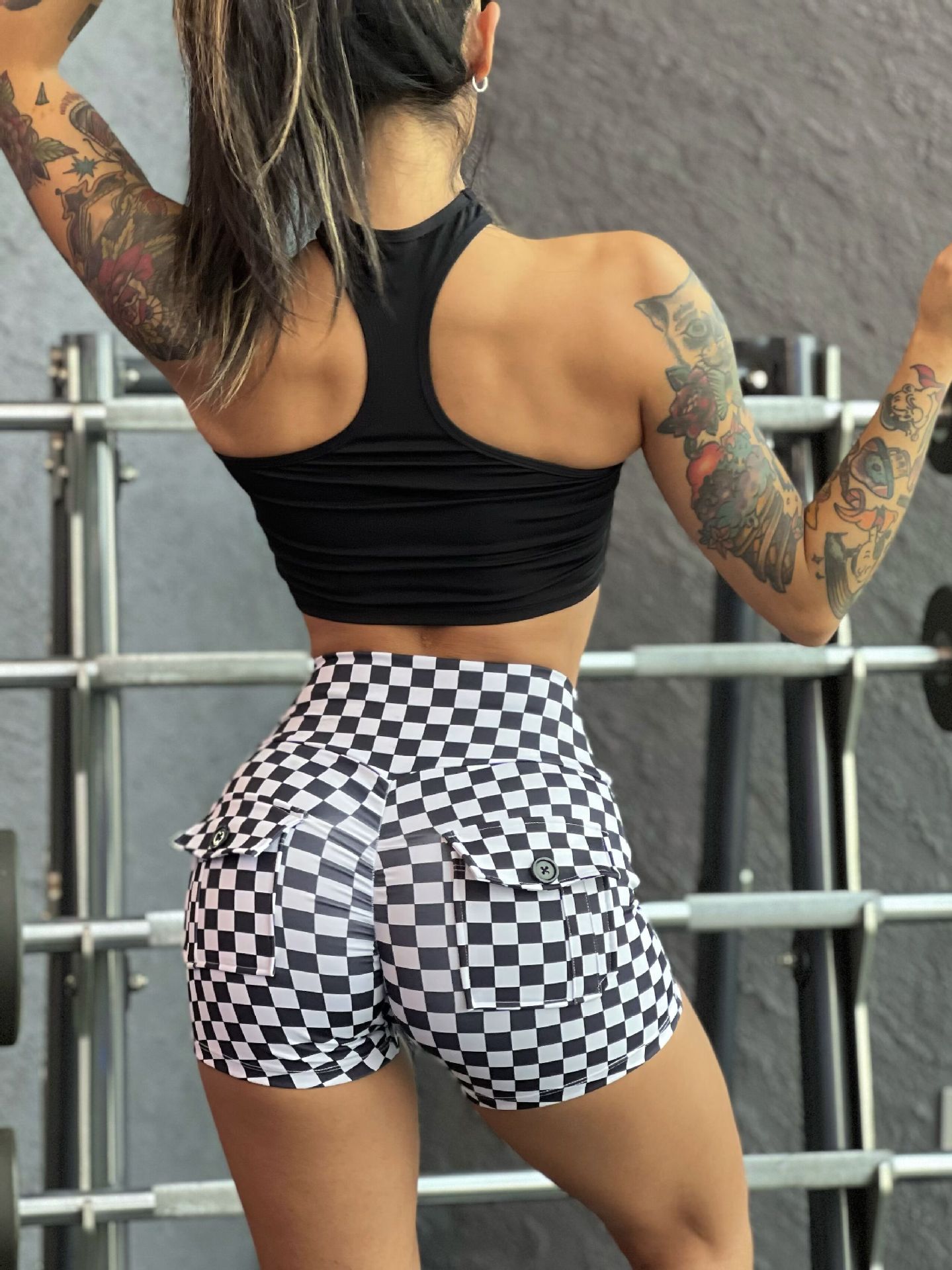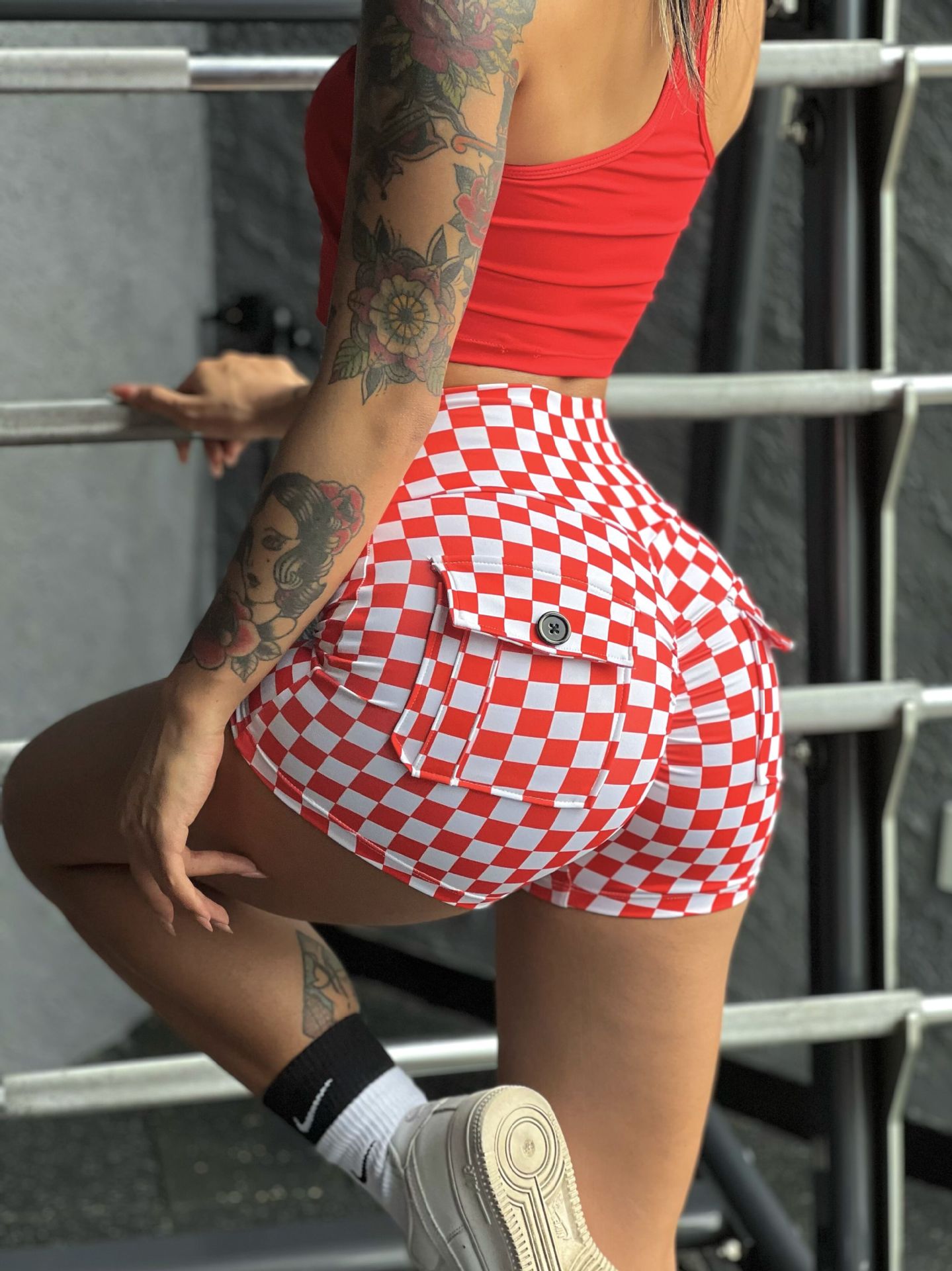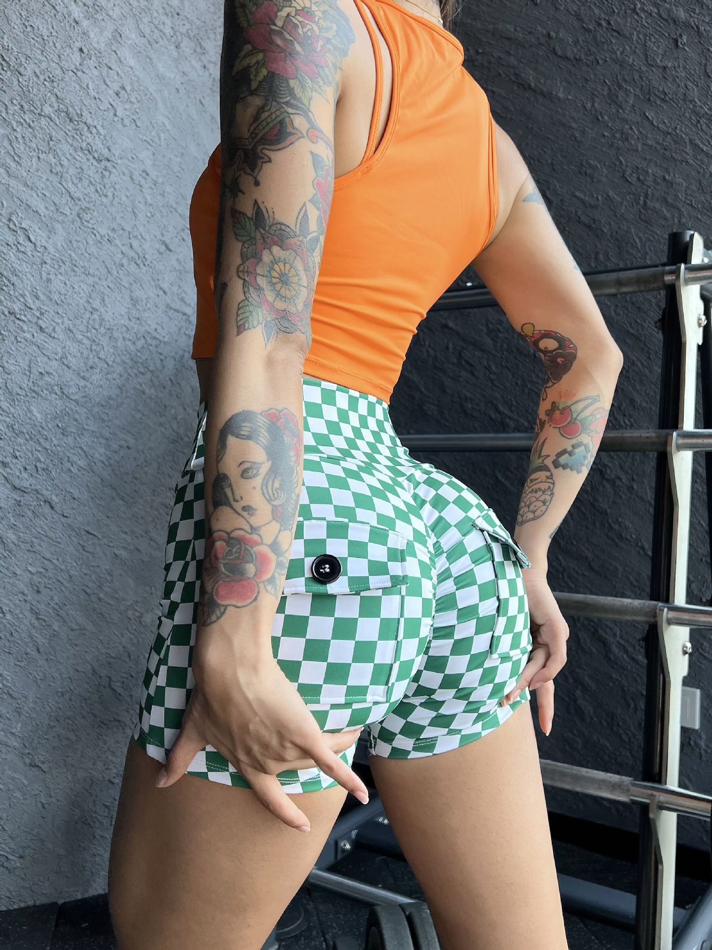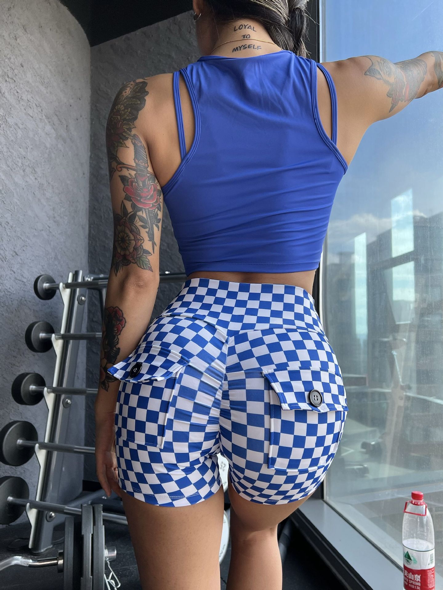 欧美棋盘格子运动健身瑜伽工装口袋短裤女夏季提臀紧身高腰透气