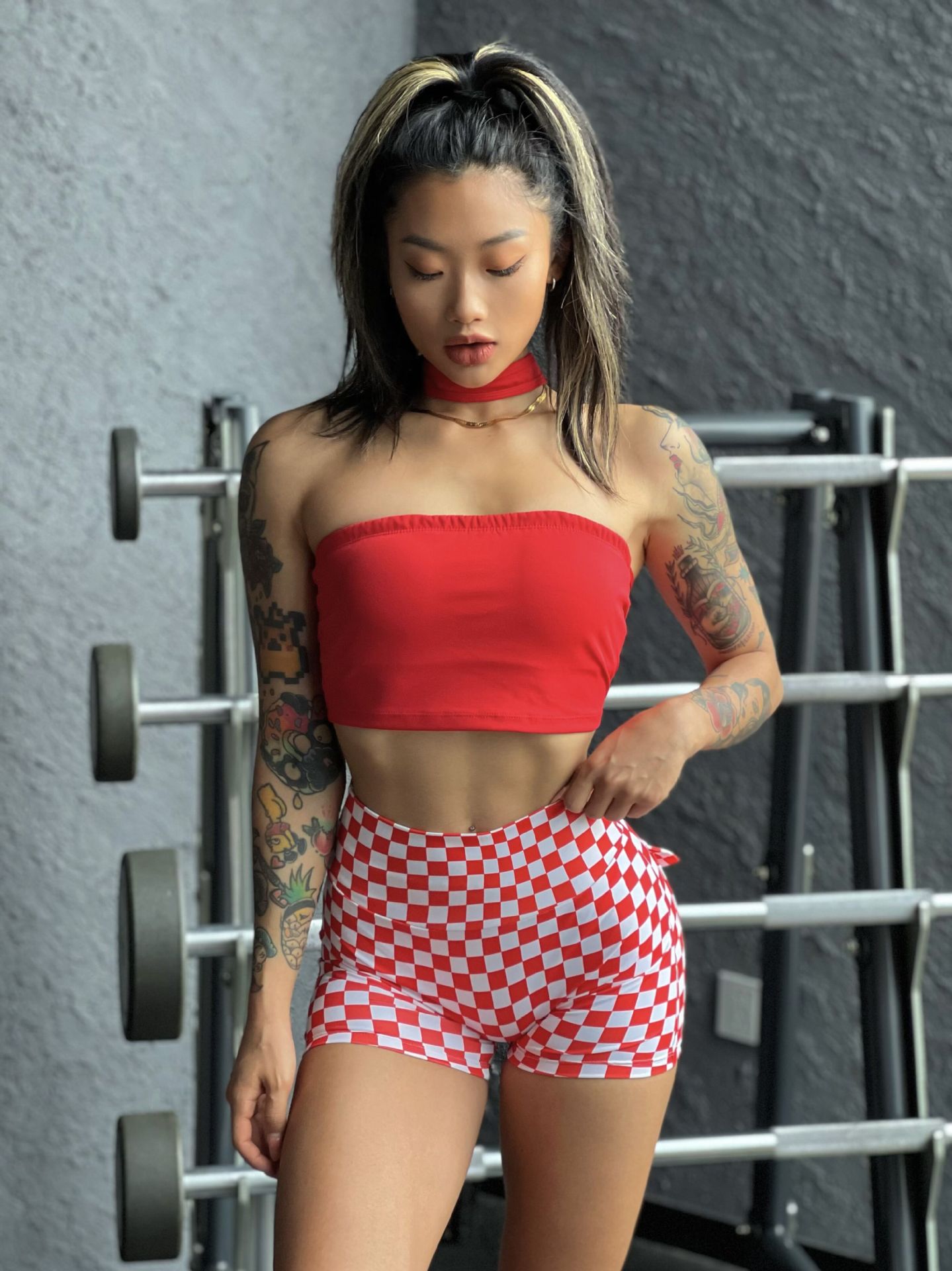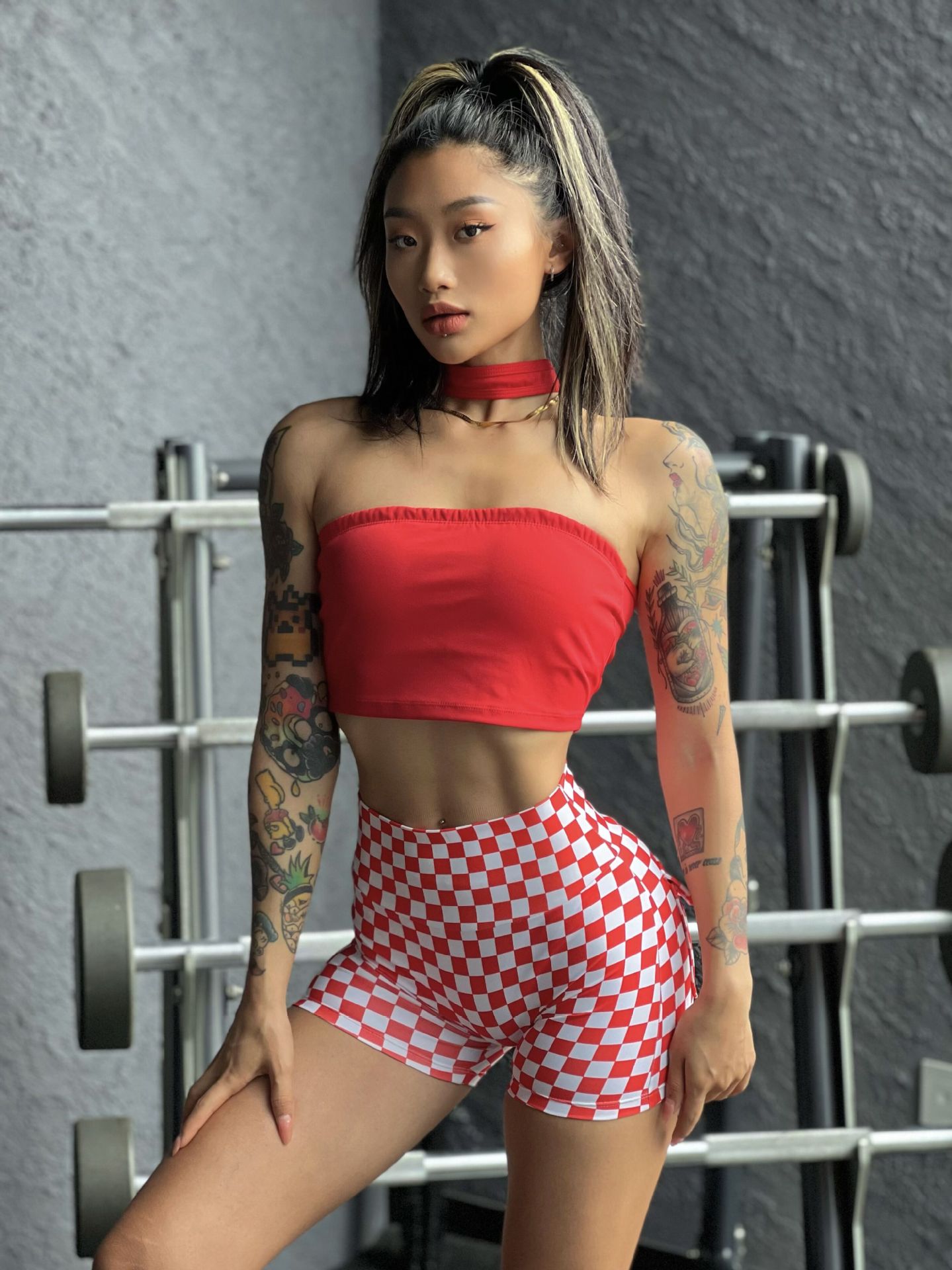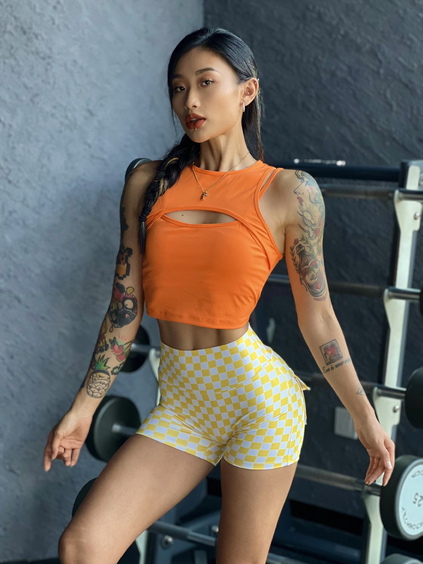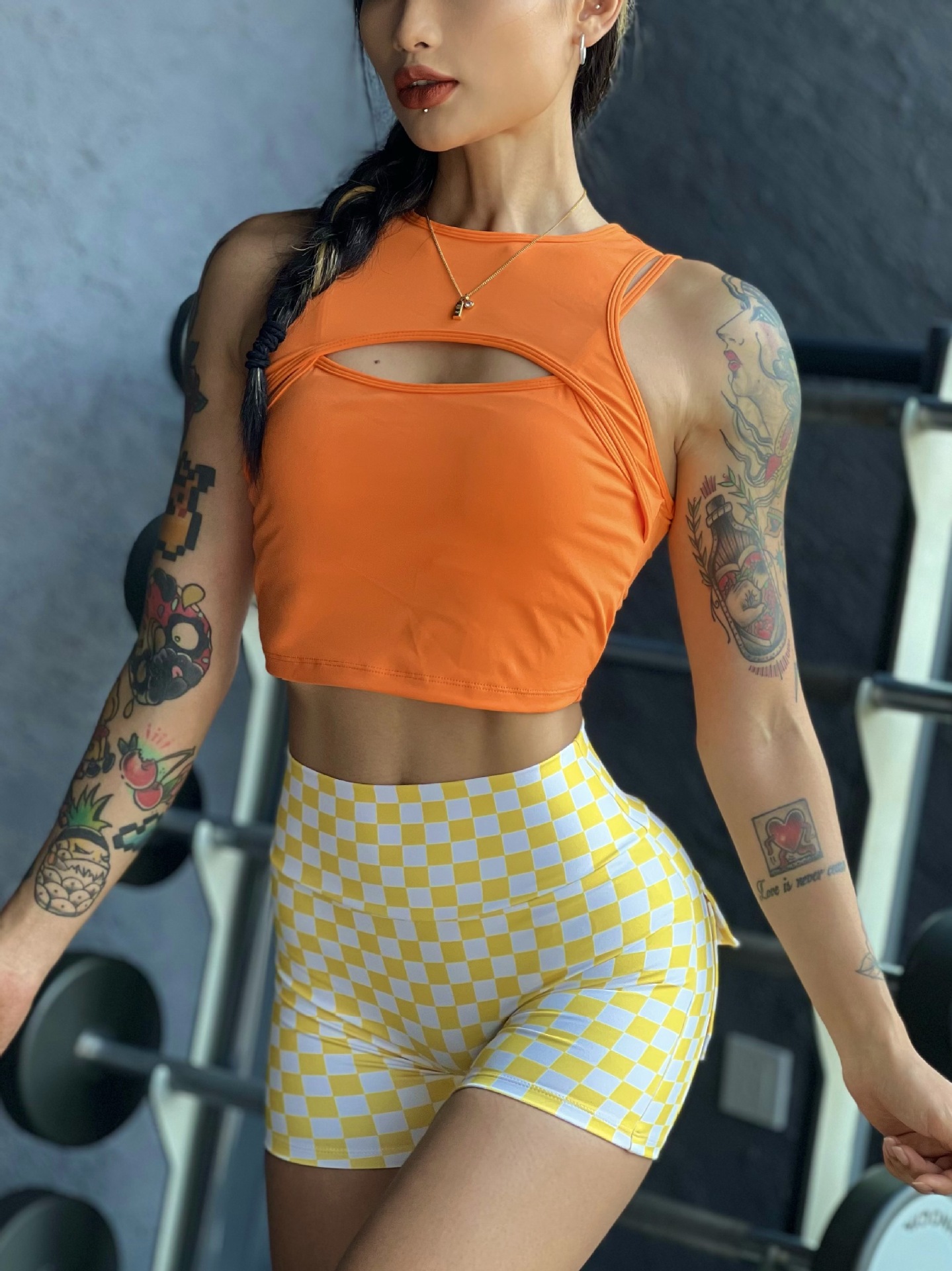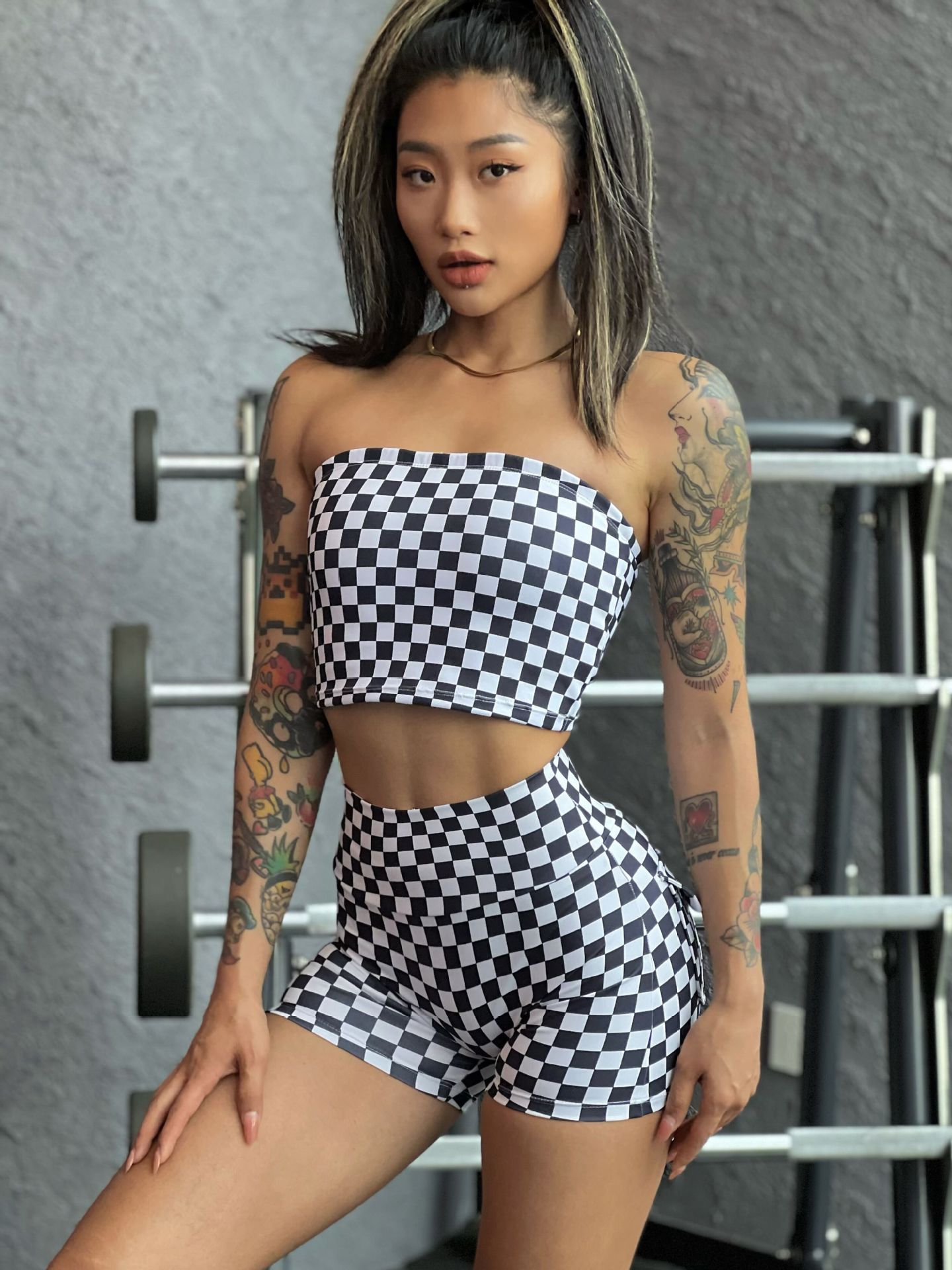 欧美棋盘格子运动健身瑜伽工装口袋短裤女夏季提臀紧身高腰透气