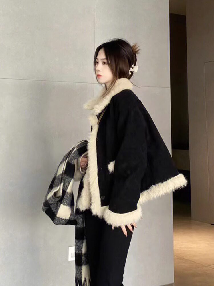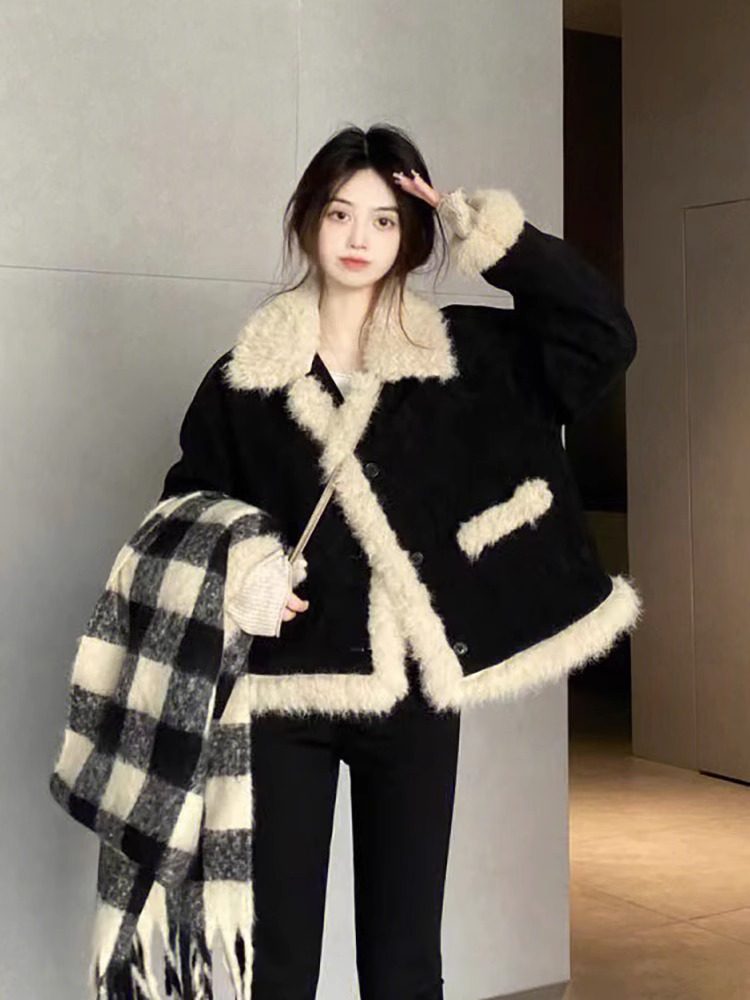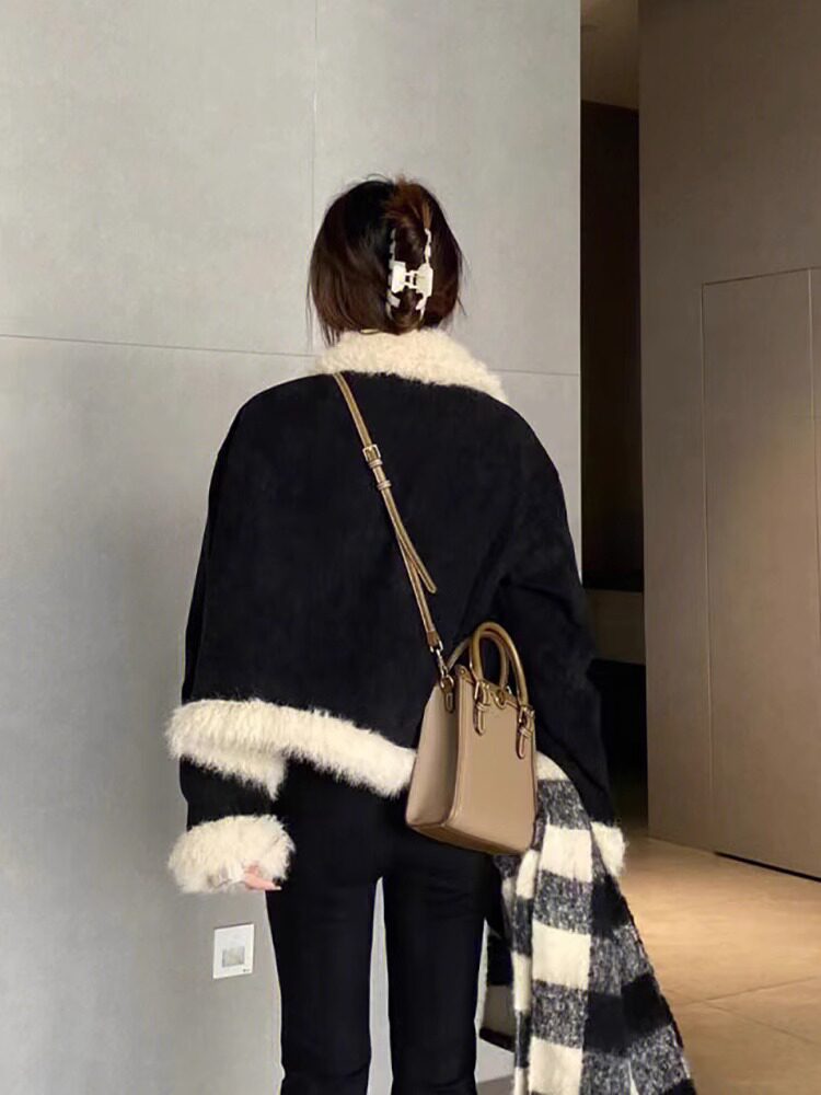 美式vintage拼接大毛领棉衣女冬季慵懒设计感小众毛茸茸棉服外套