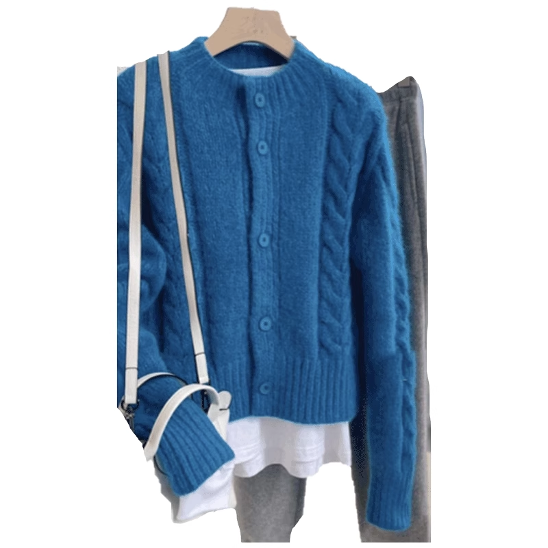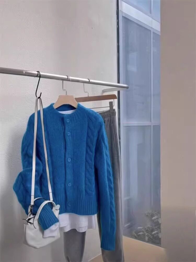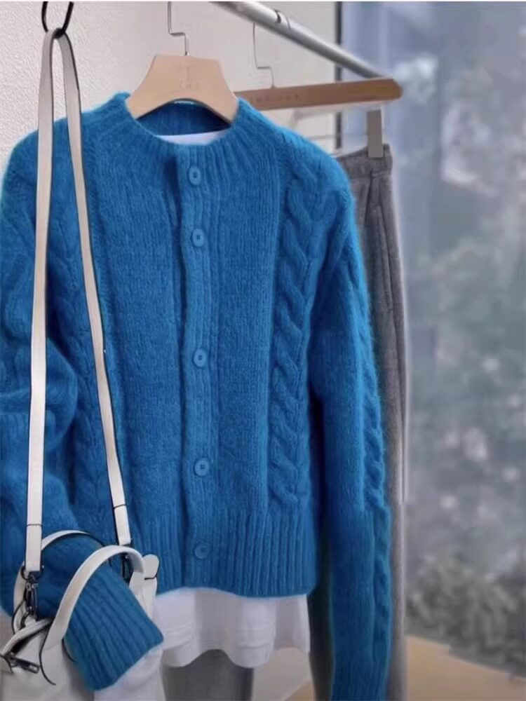 外贸欧货重工克莱因蓝色高级感浣熊绒软糯针织开衫女麻花毛衣外套