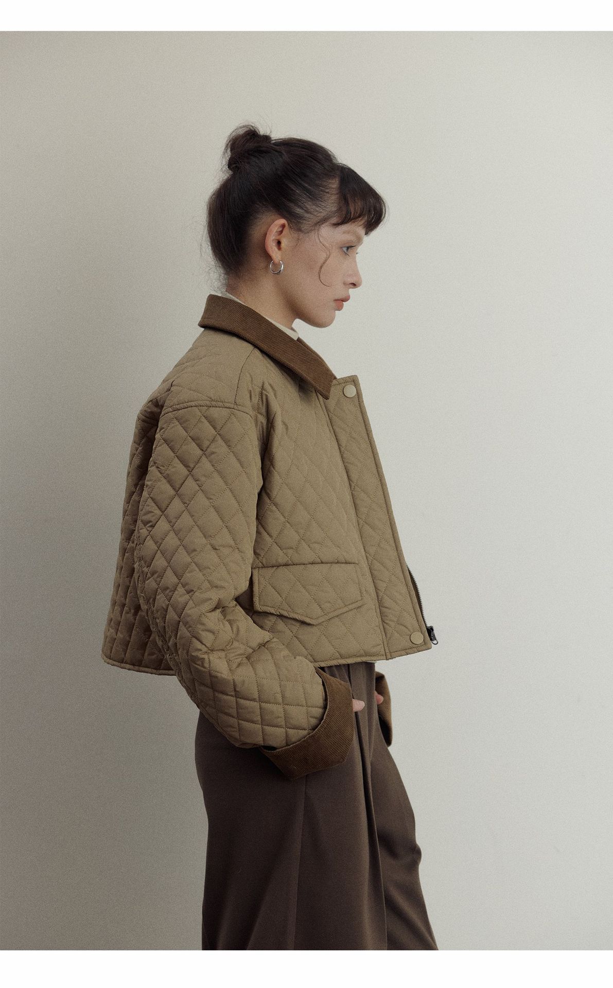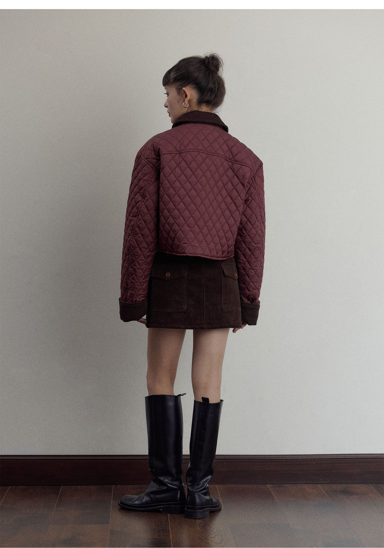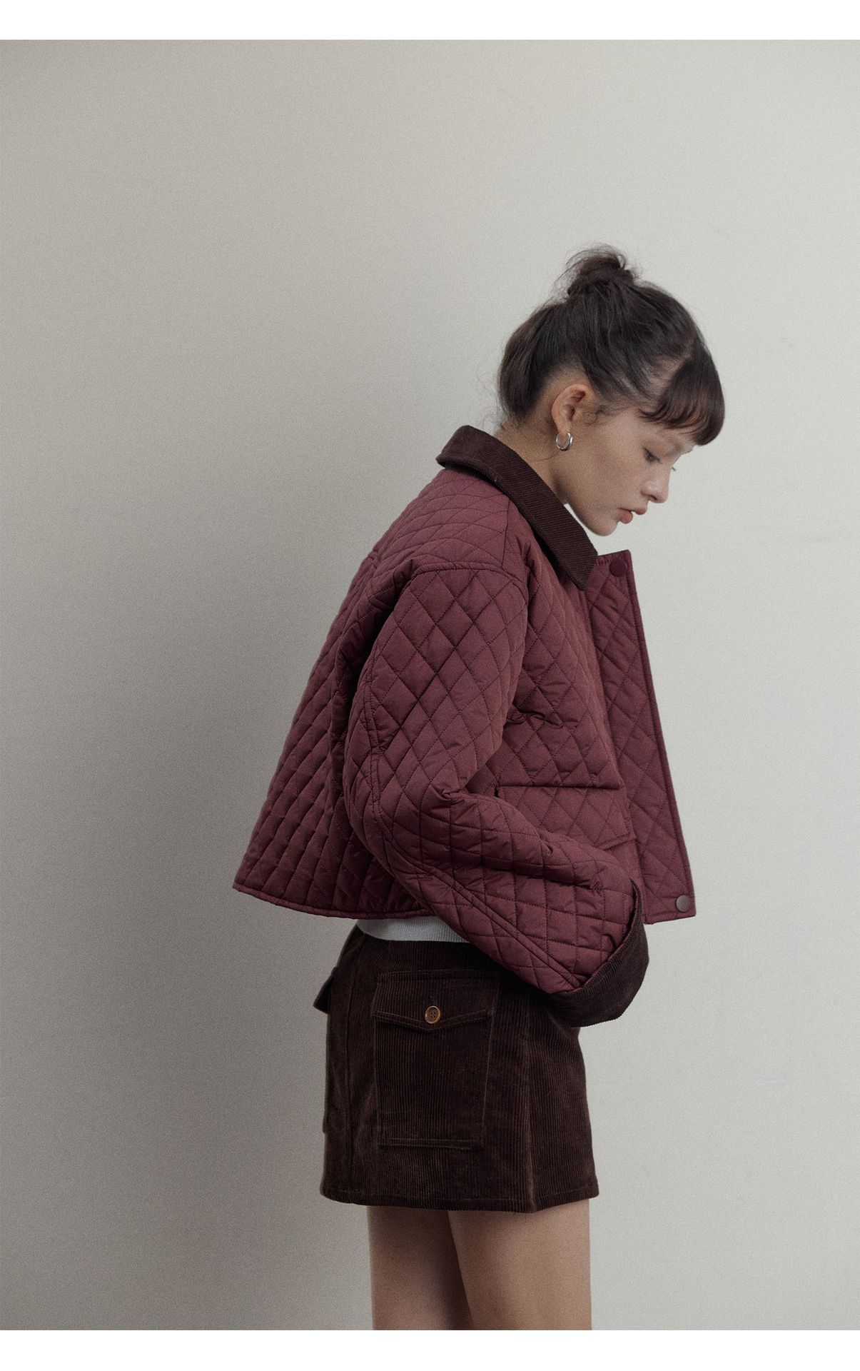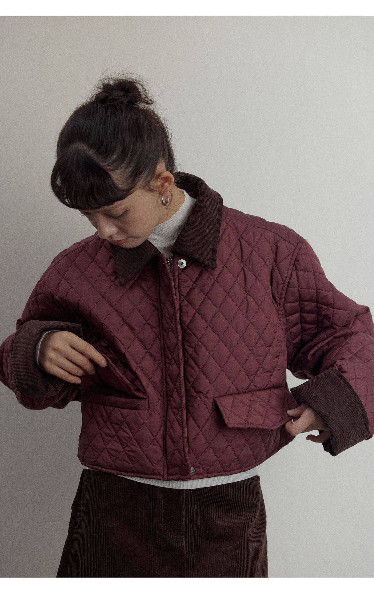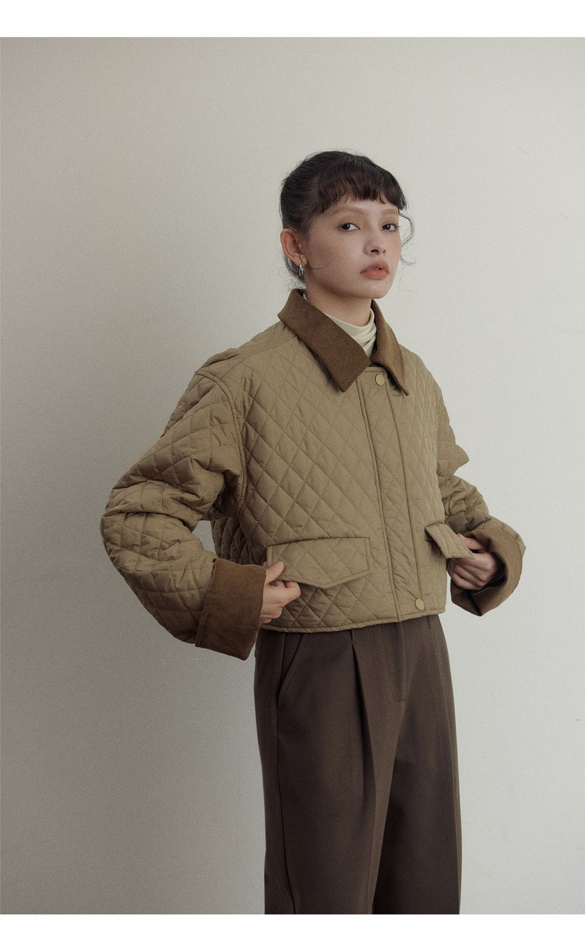 【玳禾】秋冬新品休闲翻领灯芯绒绗缝拼接撞色短款棉衣外套H5610
