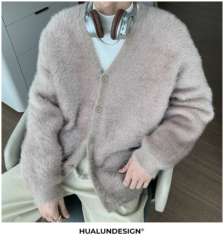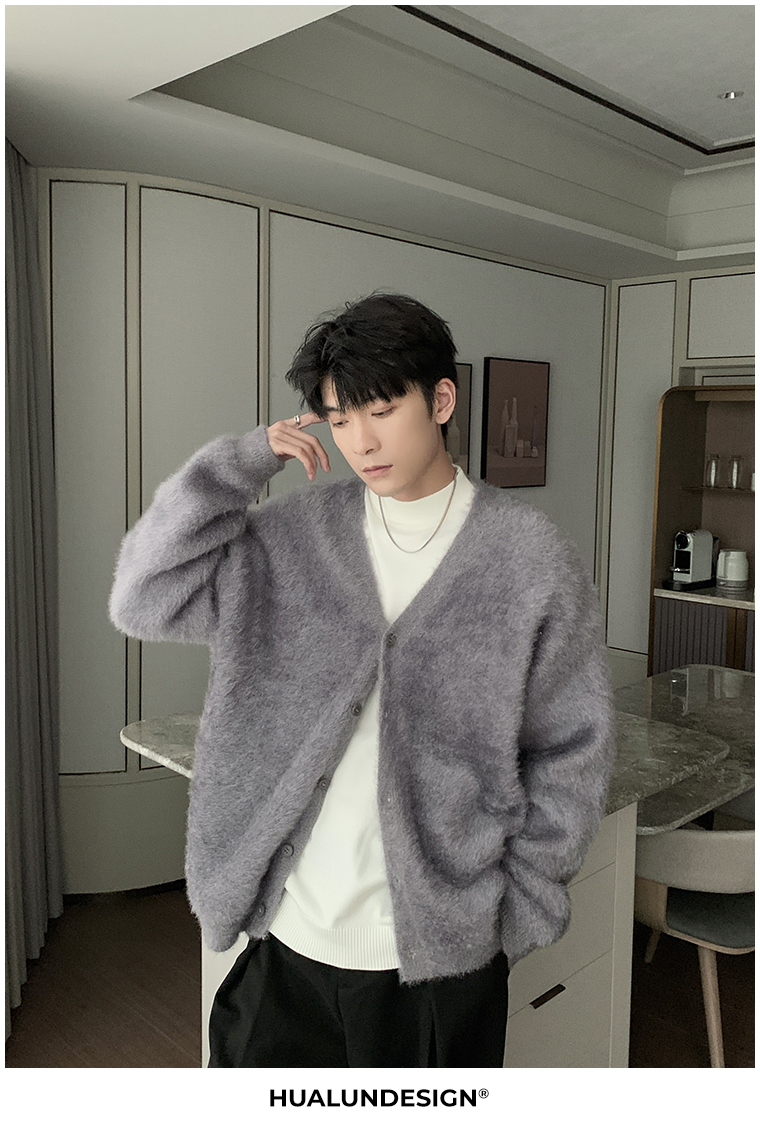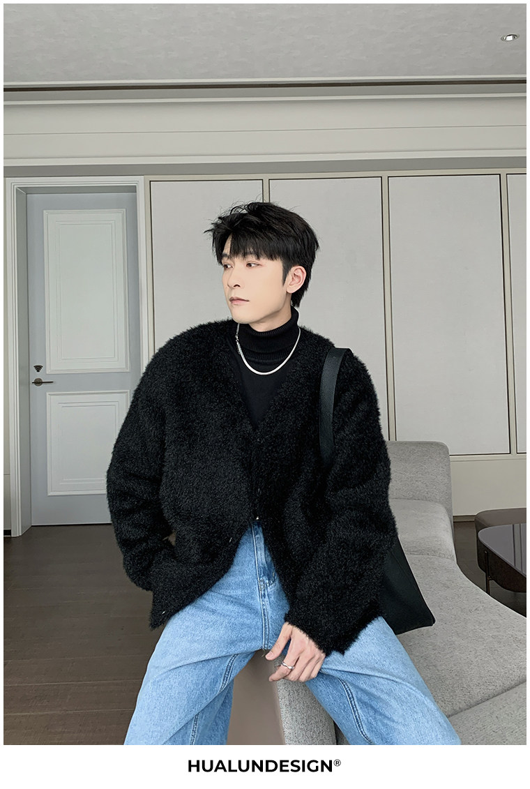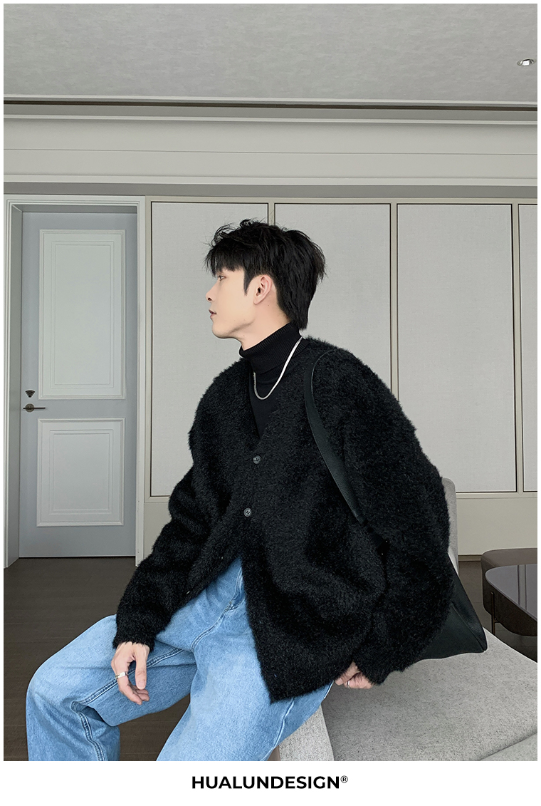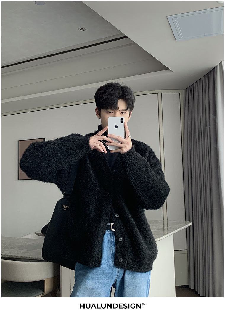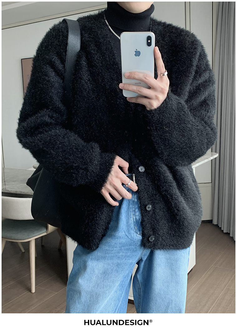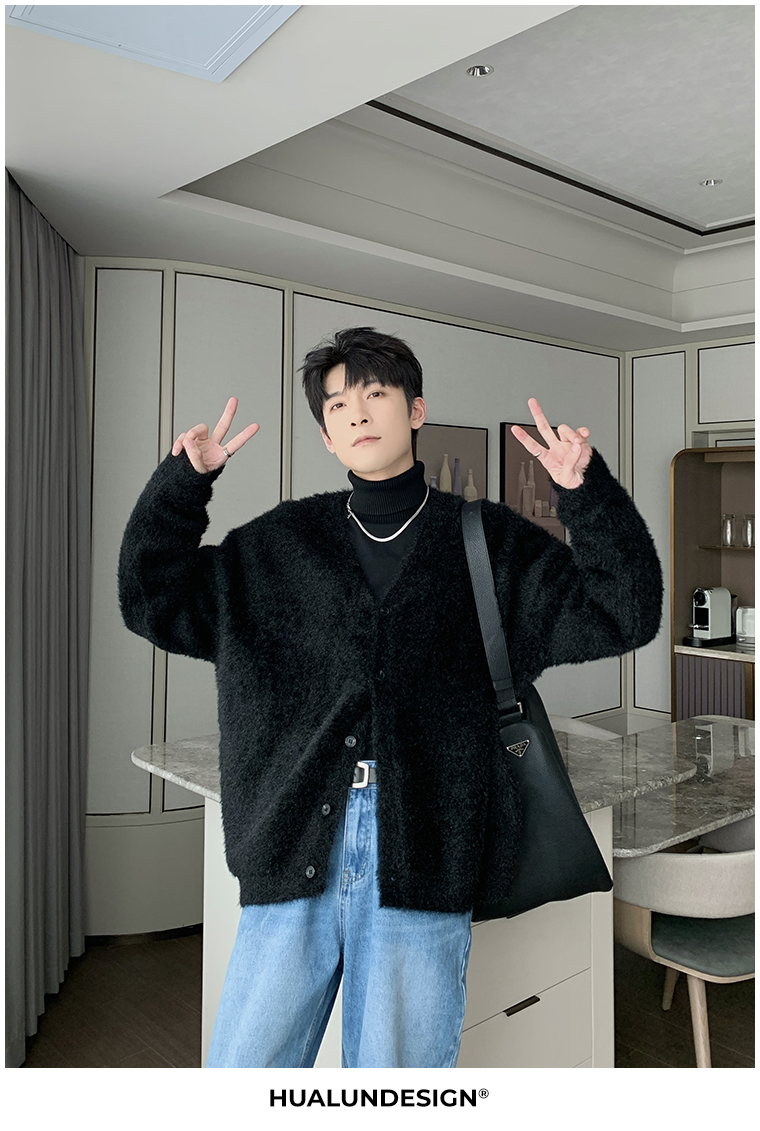 Hualun秋冬慵懒风毛衣男V领开衫针织衫外穿韩版休闲纯色百搭外套