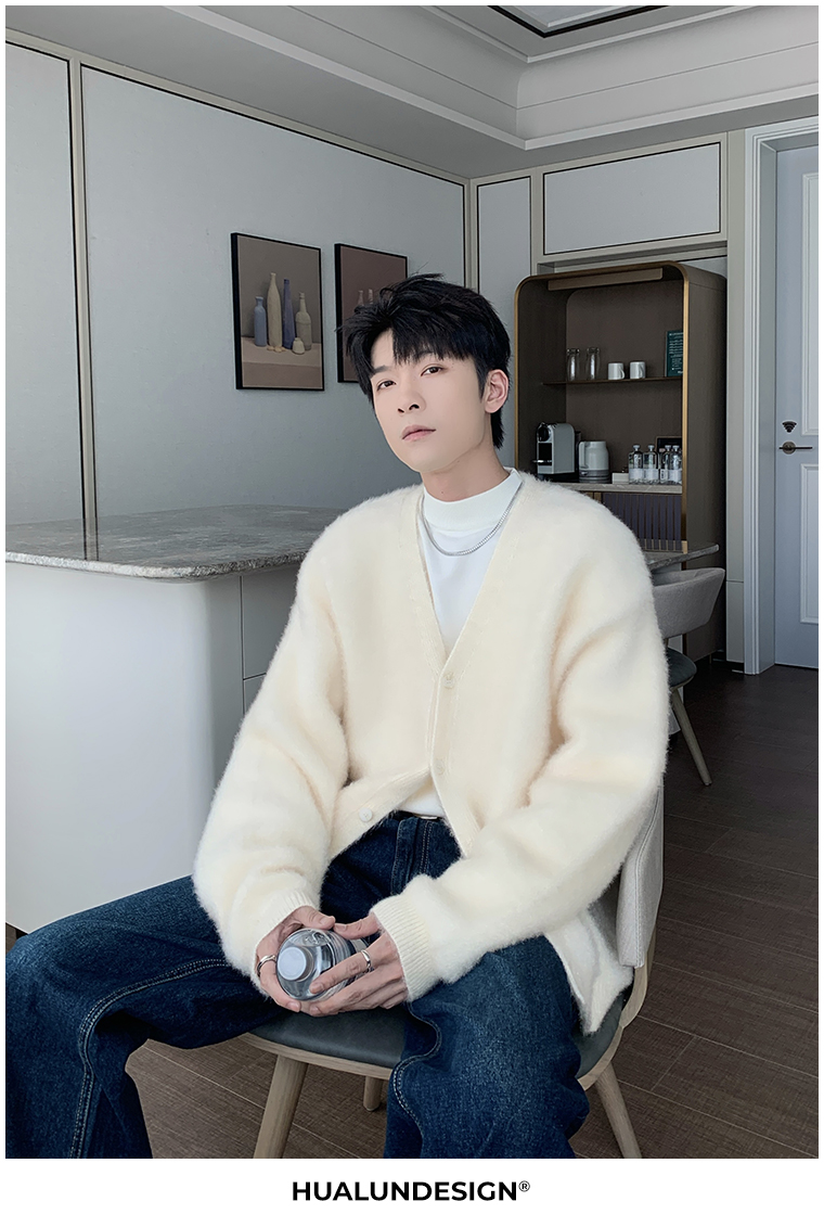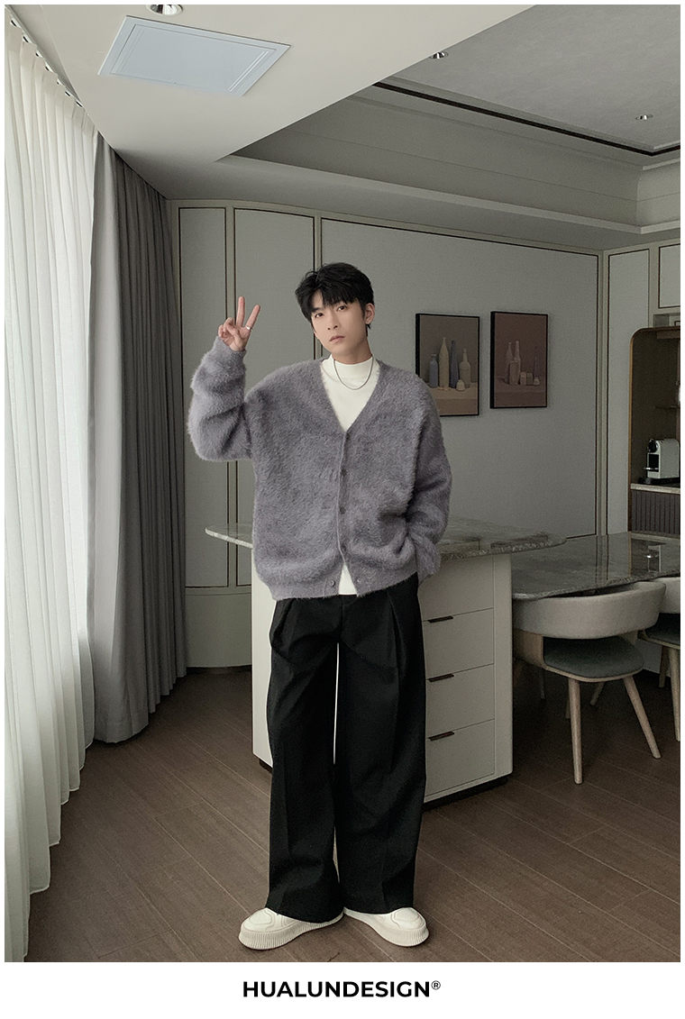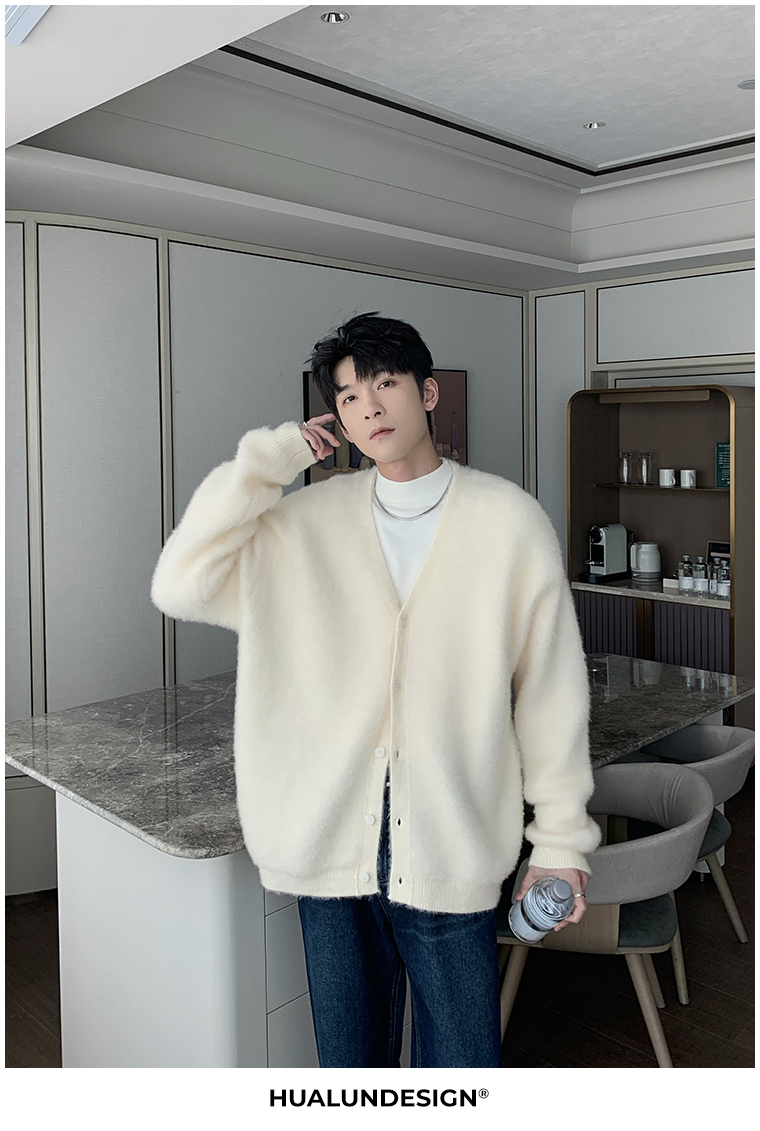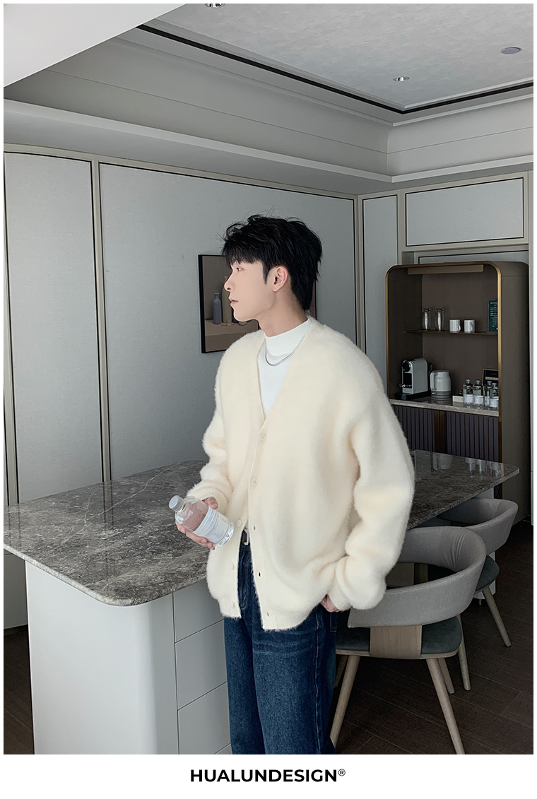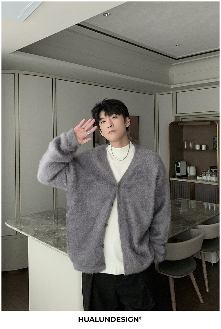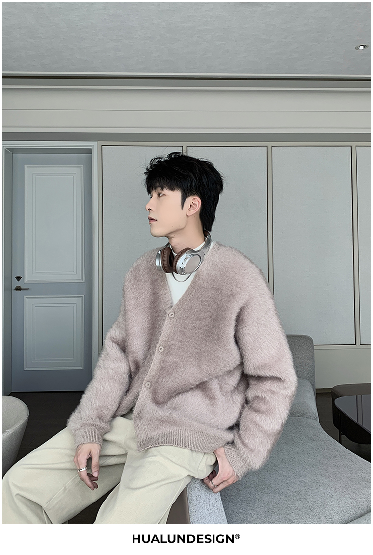 Hualun秋冬慵懒风毛衣男V领开衫针织衫外穿韩版休闲纯色百搭外套