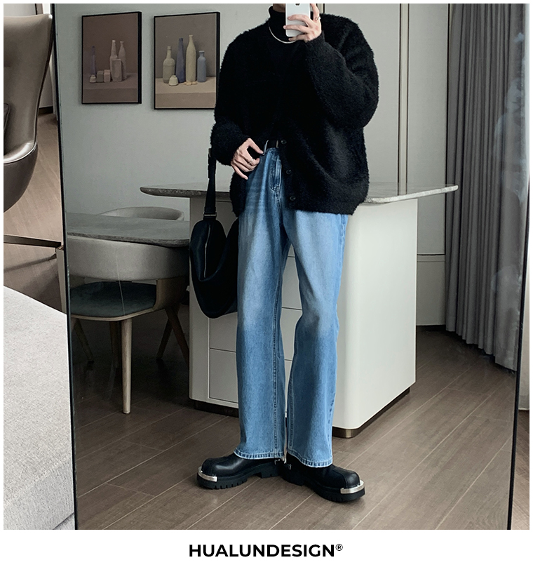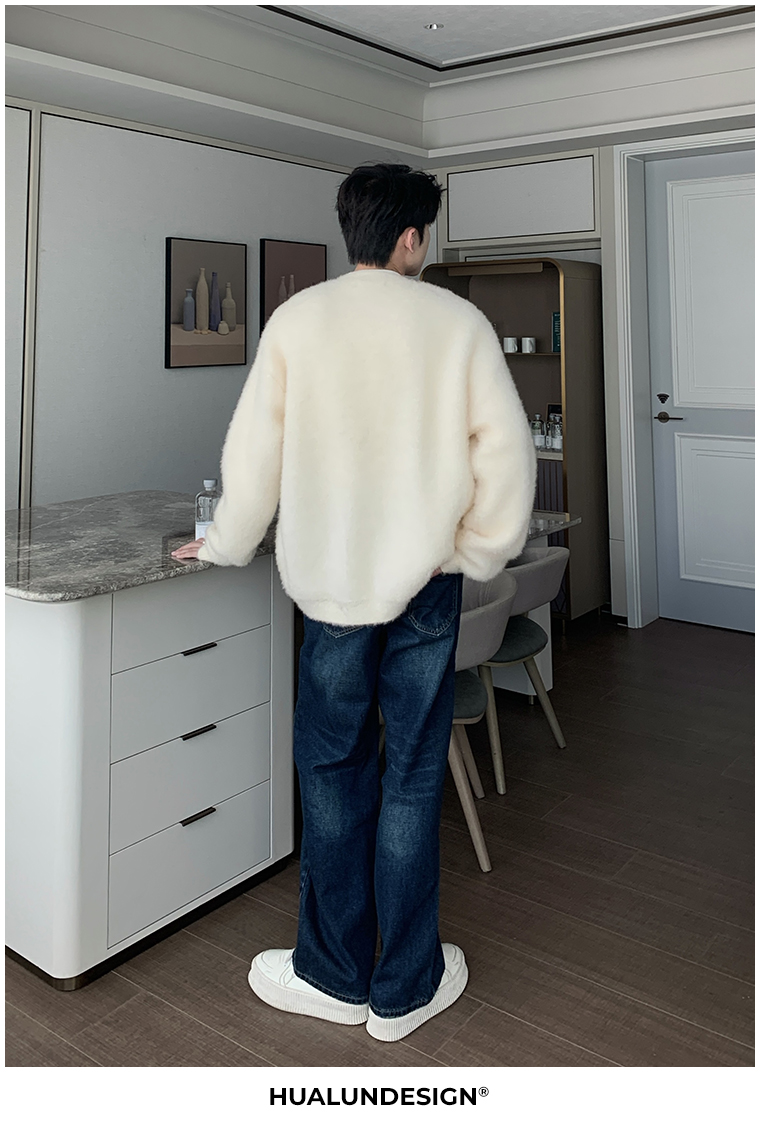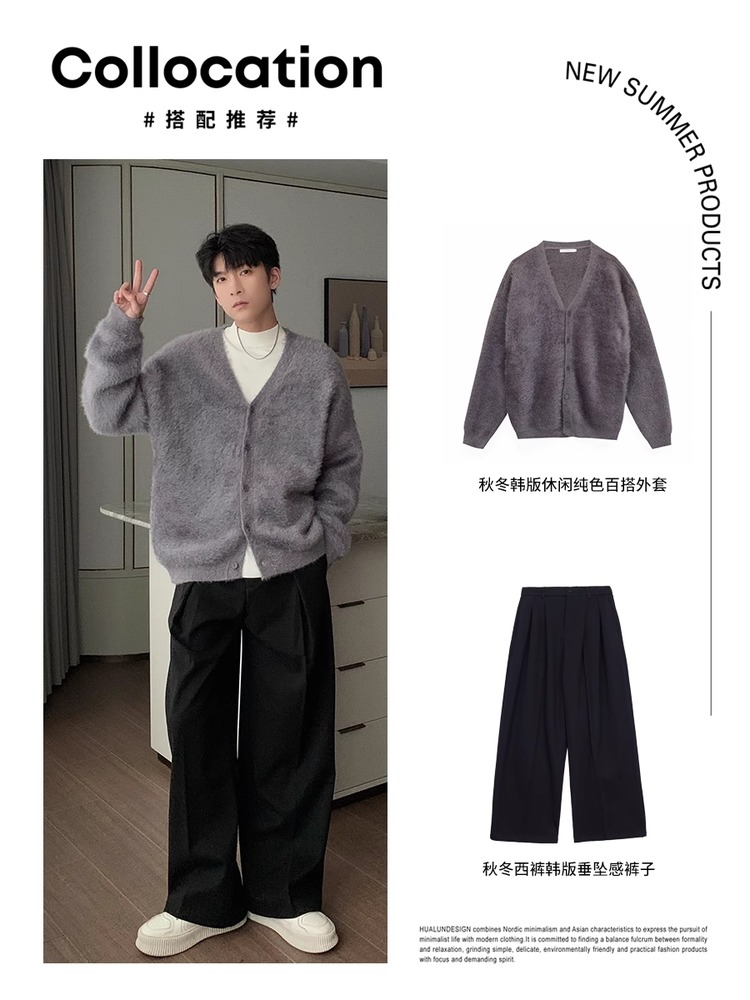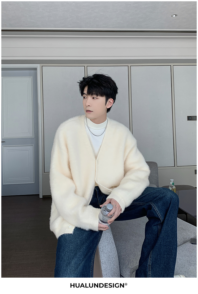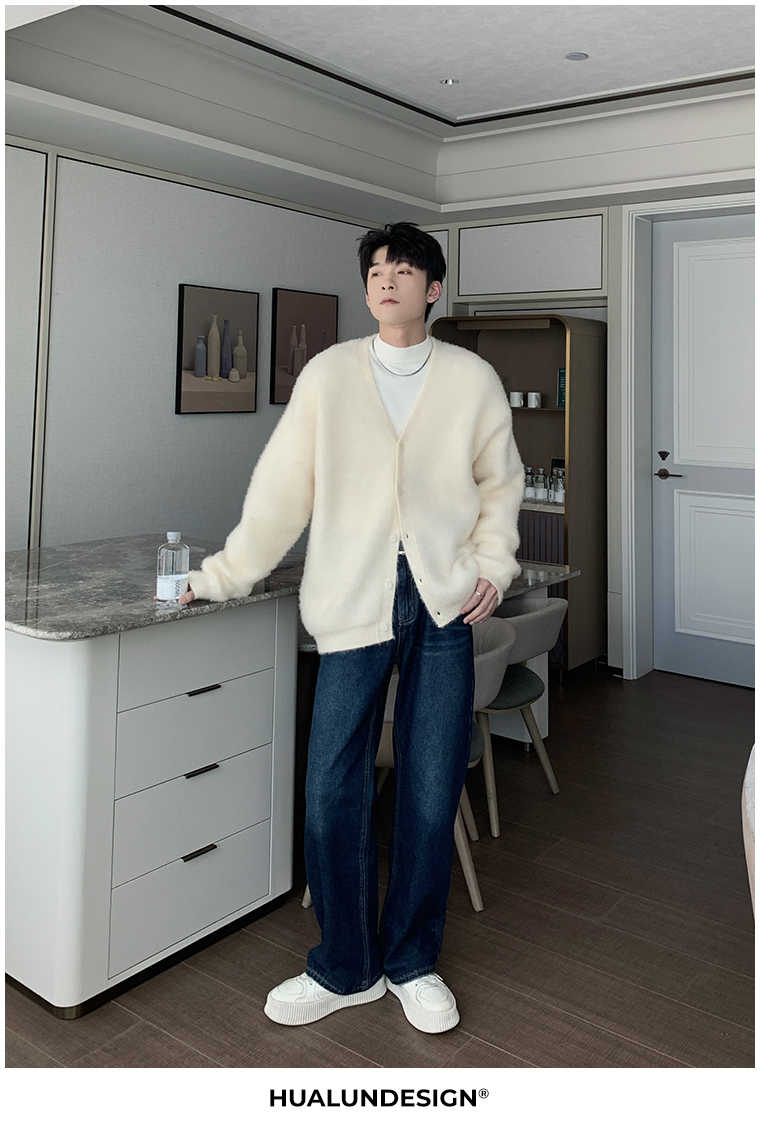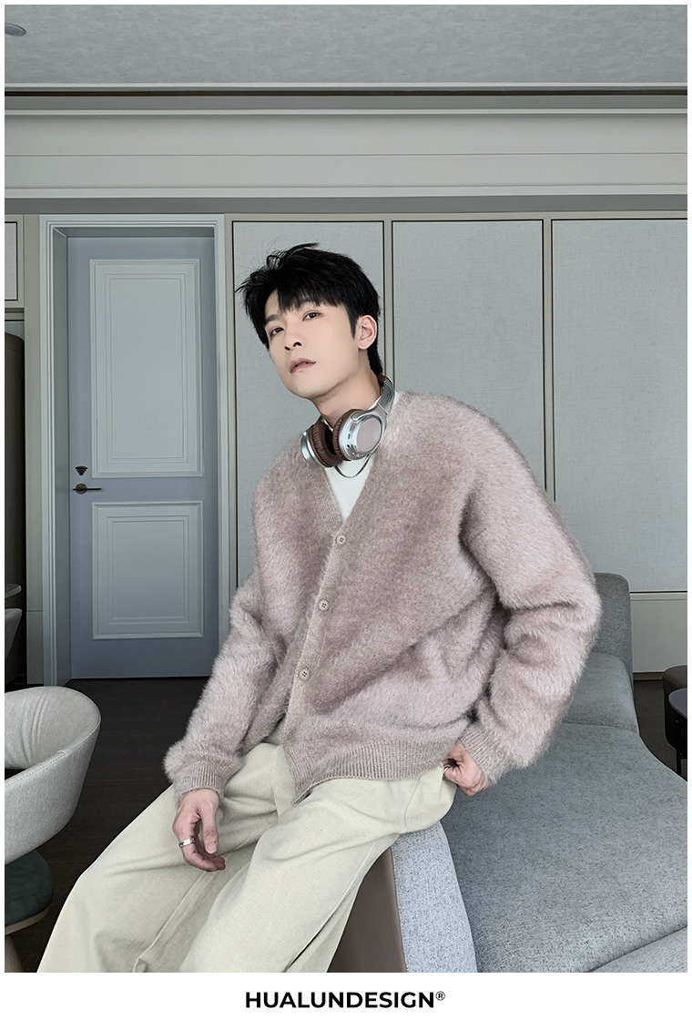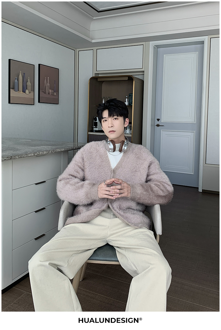 Hualun秋冬慵懒风毛衣男V领开衫针织衫外穿韩版休闲纯色百搭外套
