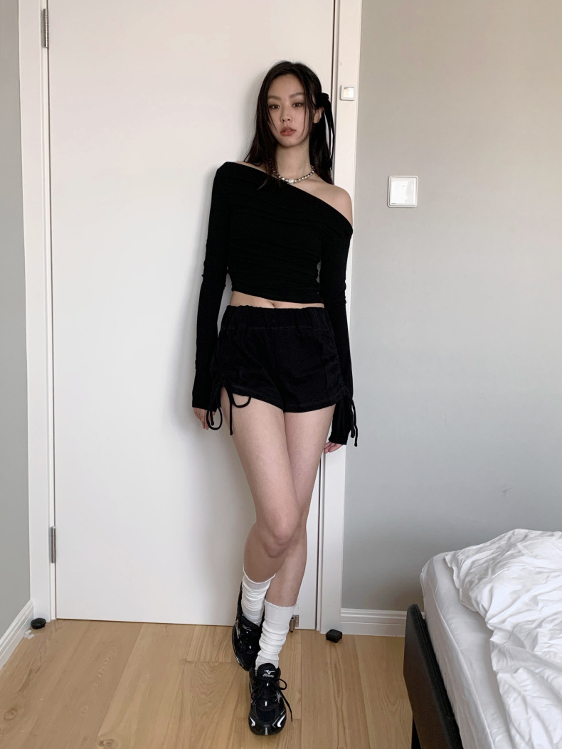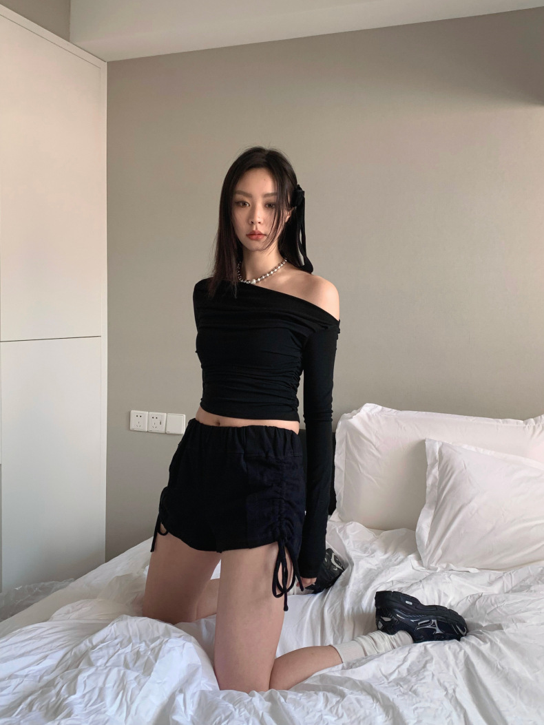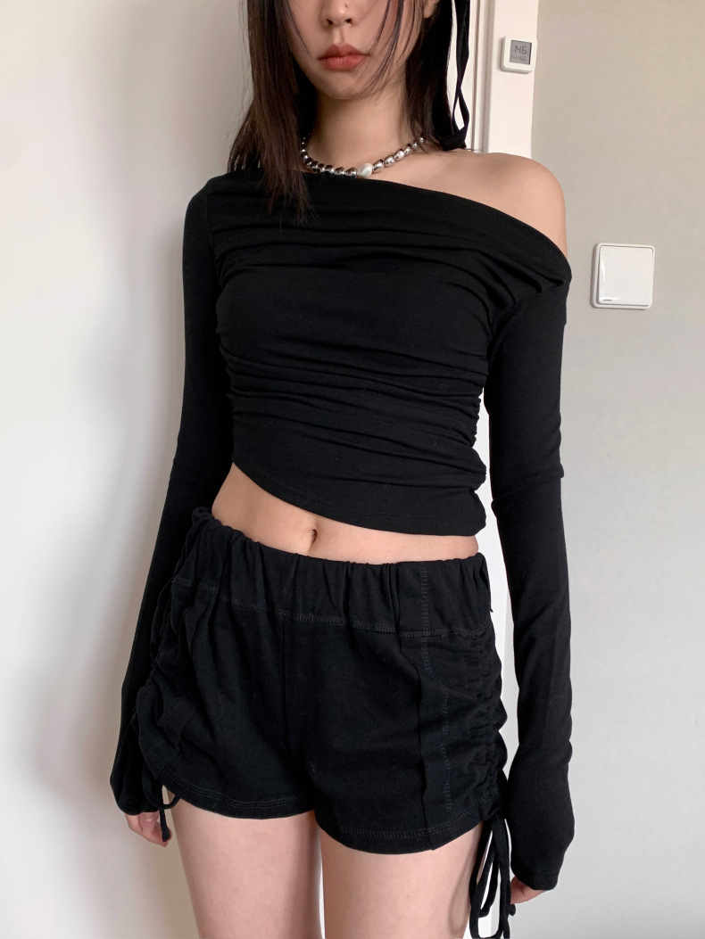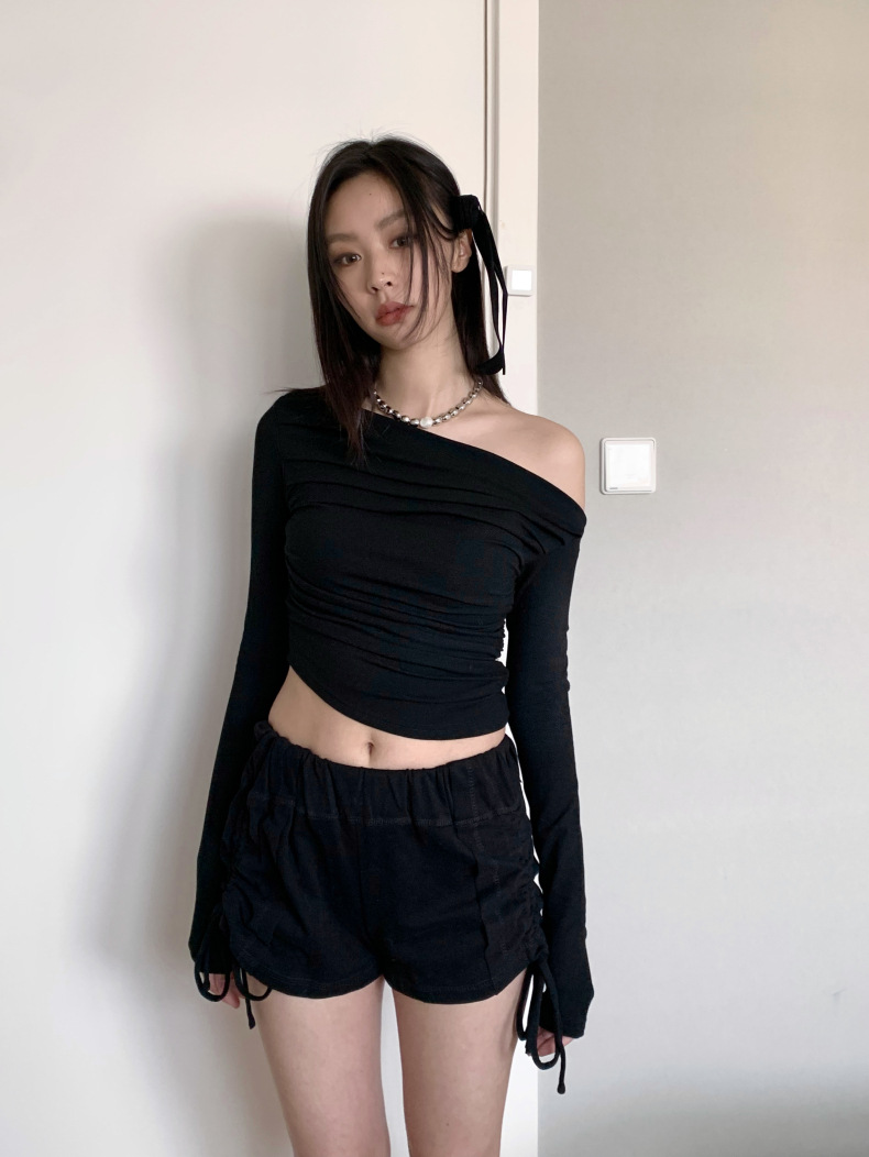 桃乐丝 春季新品 韩国休闲一字肩褶皱短款上衣高腰露脐套指长袖女