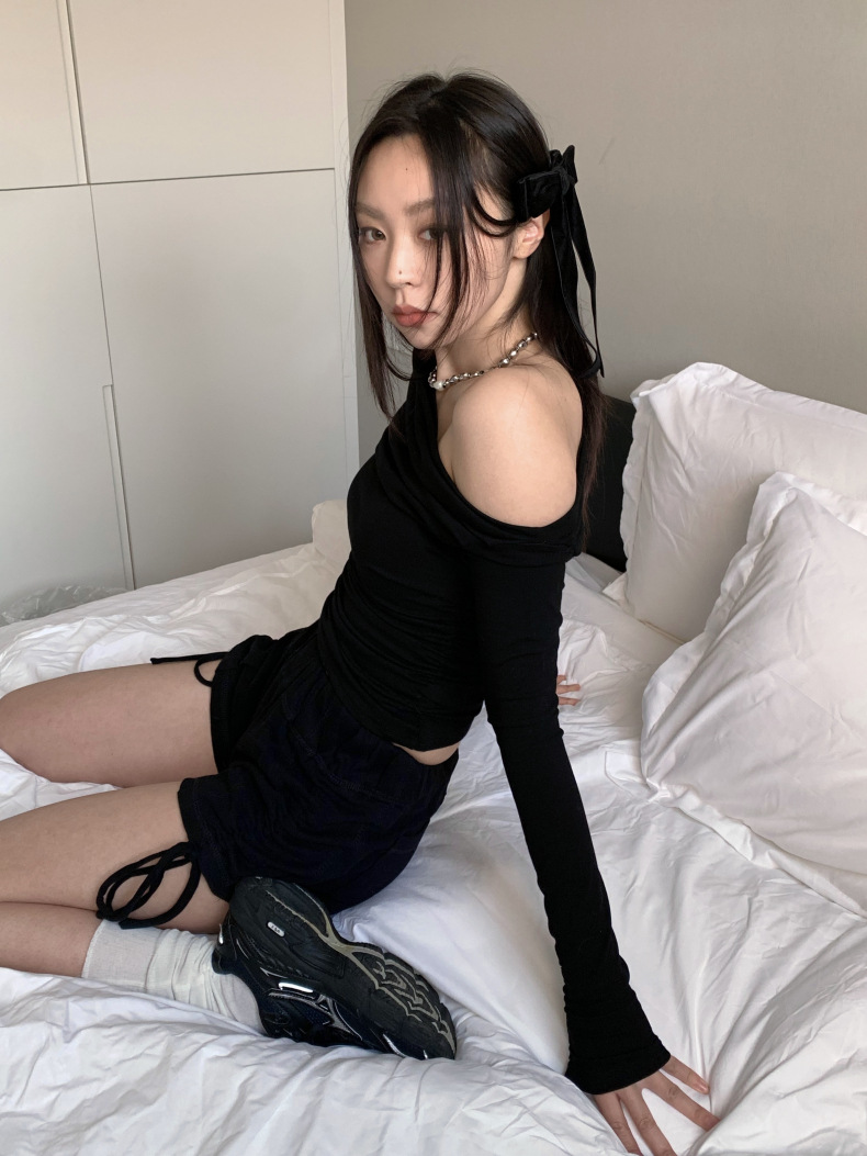 봄 캐주얼 일자 어깨 하이웨이스트 상의