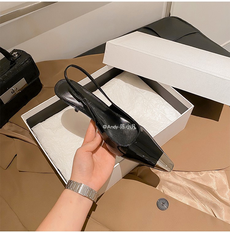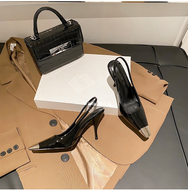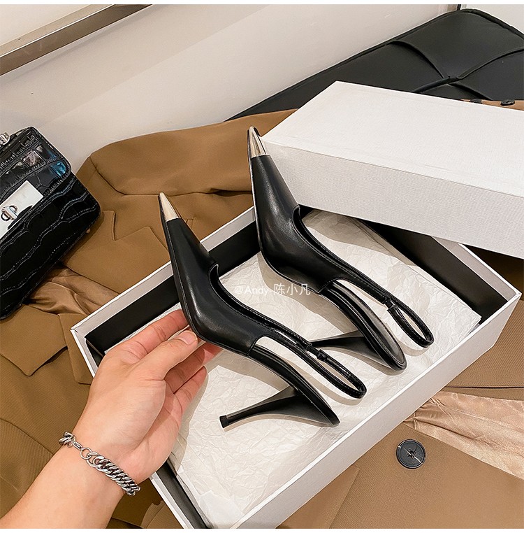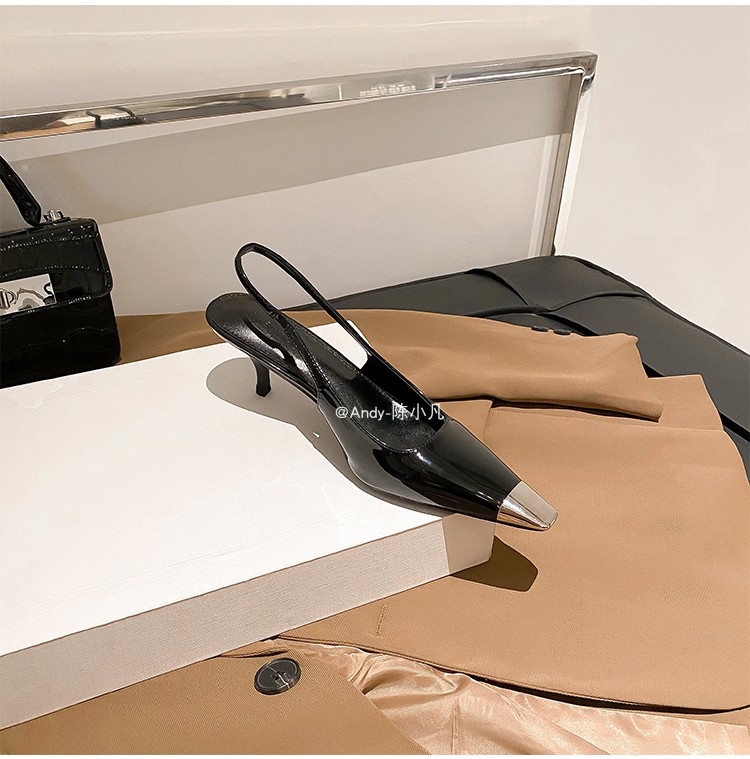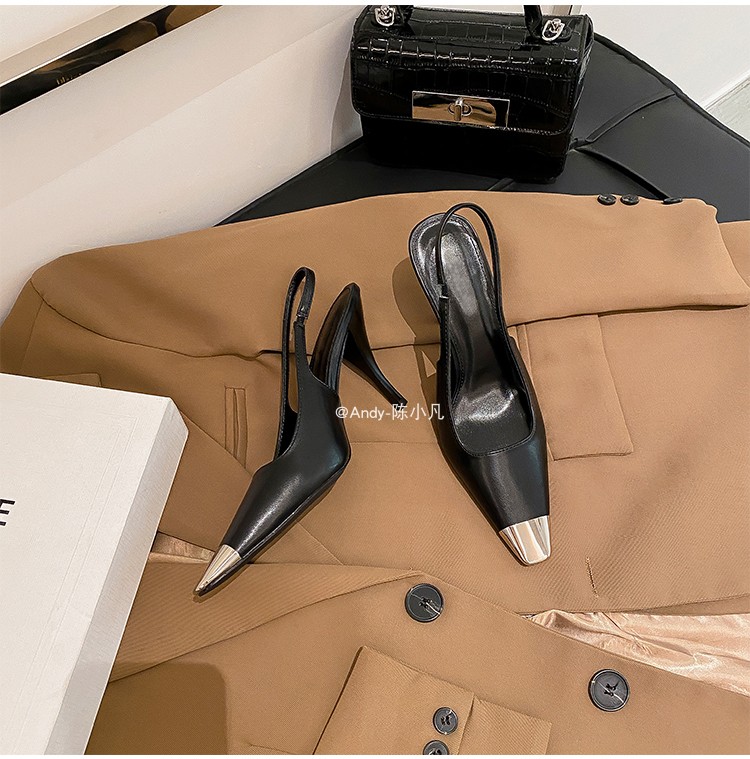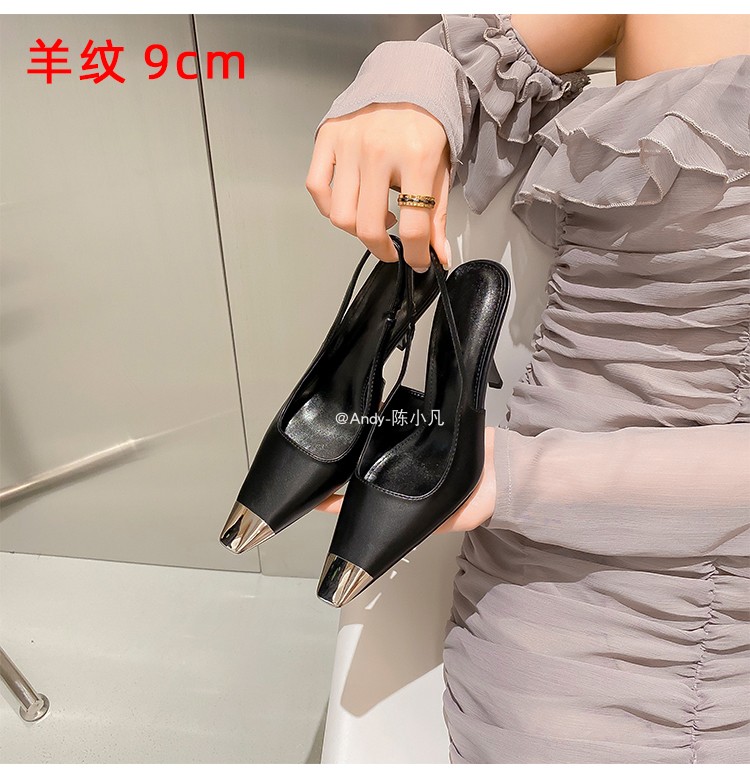 陈小凡黑色包头凉鞋女新款细跟金属尖头单鞋朴彩英rose同款高跟鞋