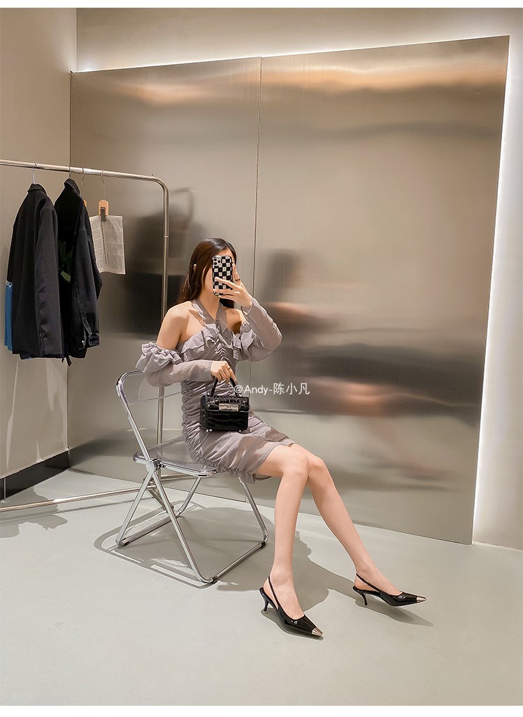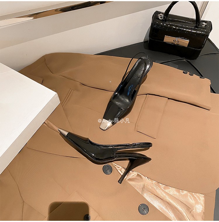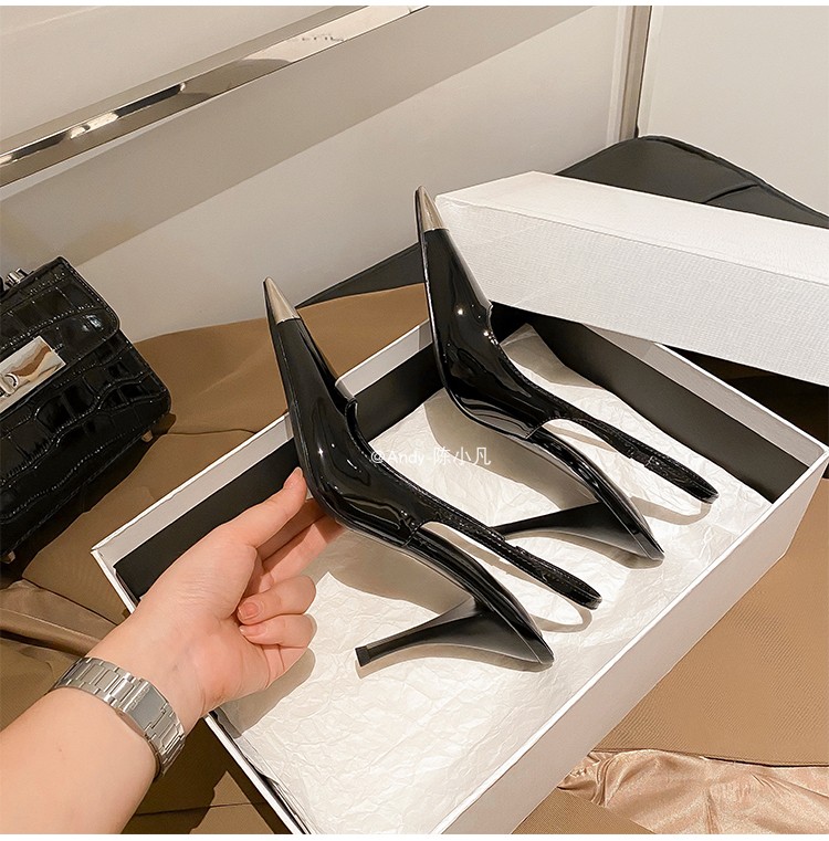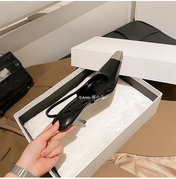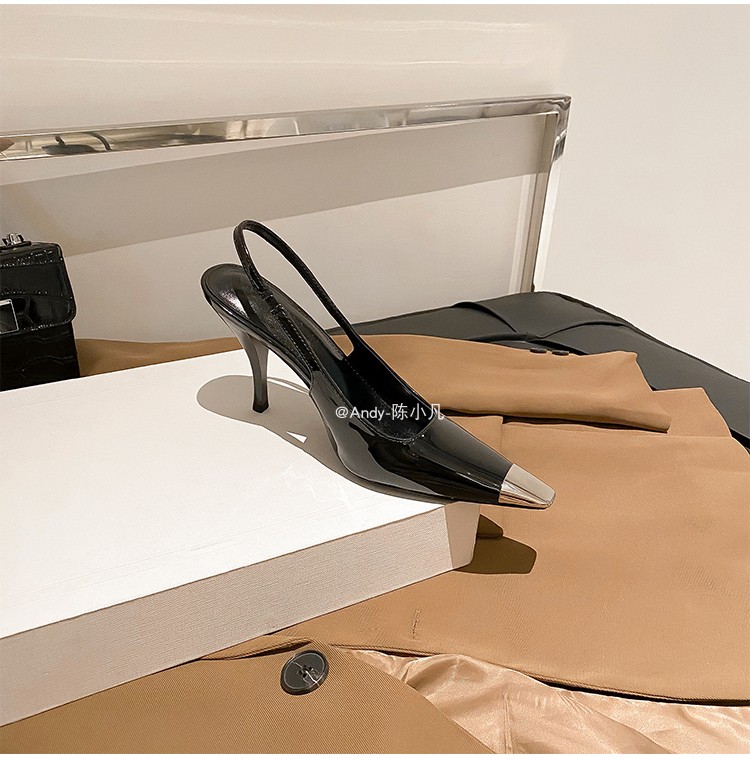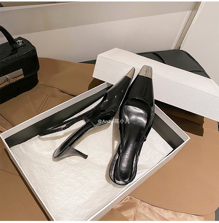 陈小凡黑色包头凉鞋女新款细跟金属尖头单鞋朴彩英rose同款高跟鞋