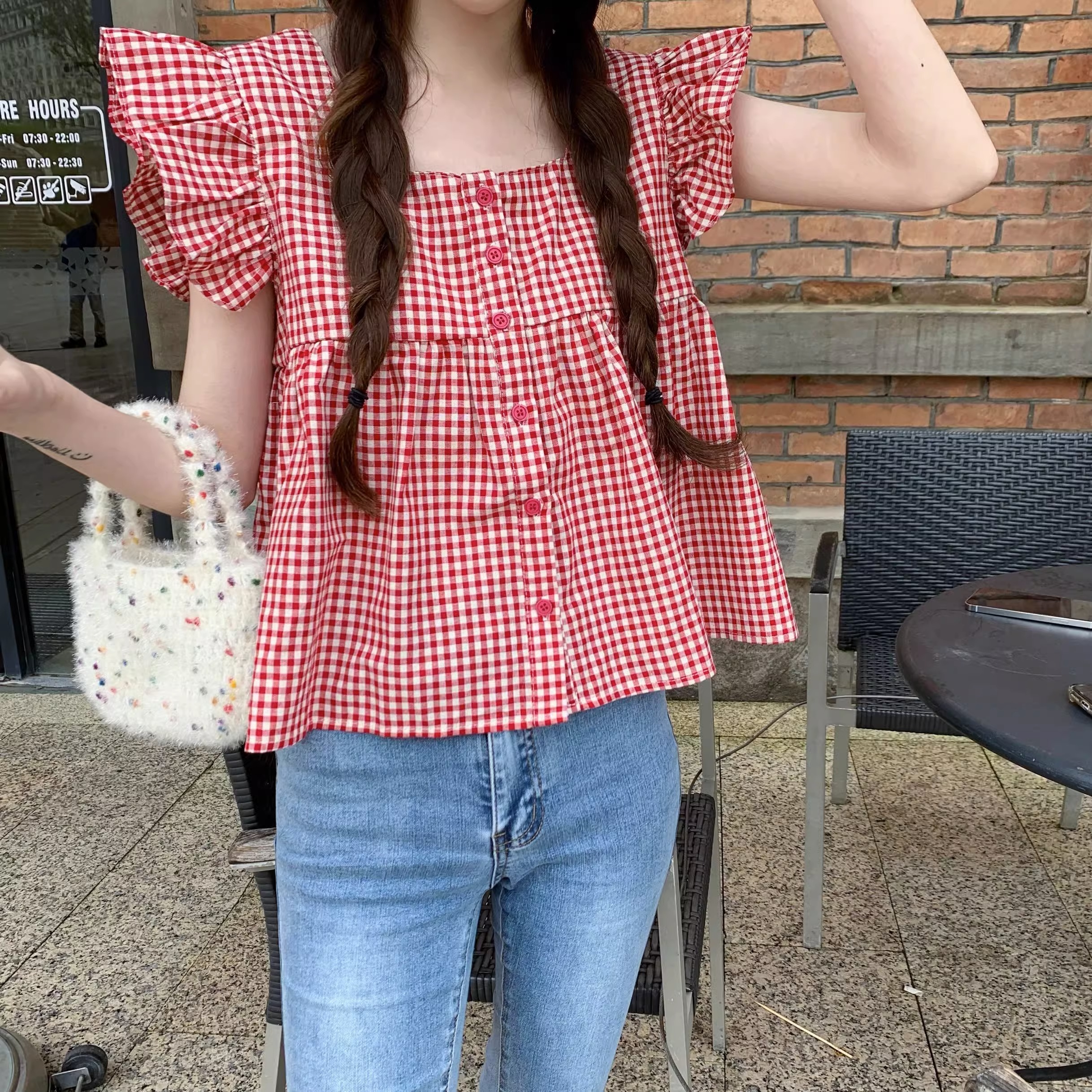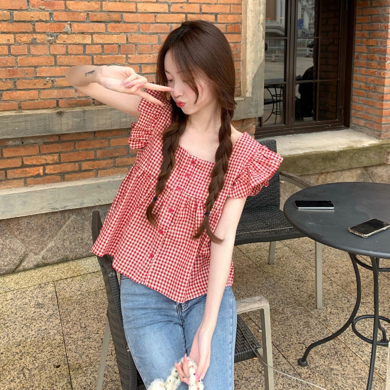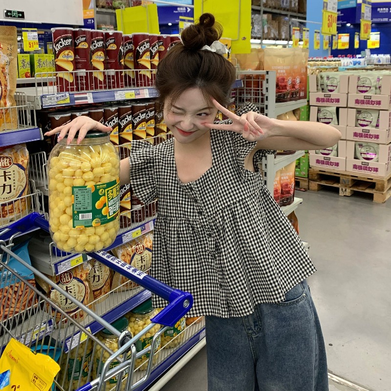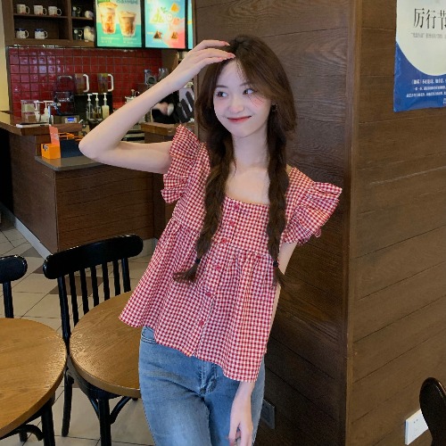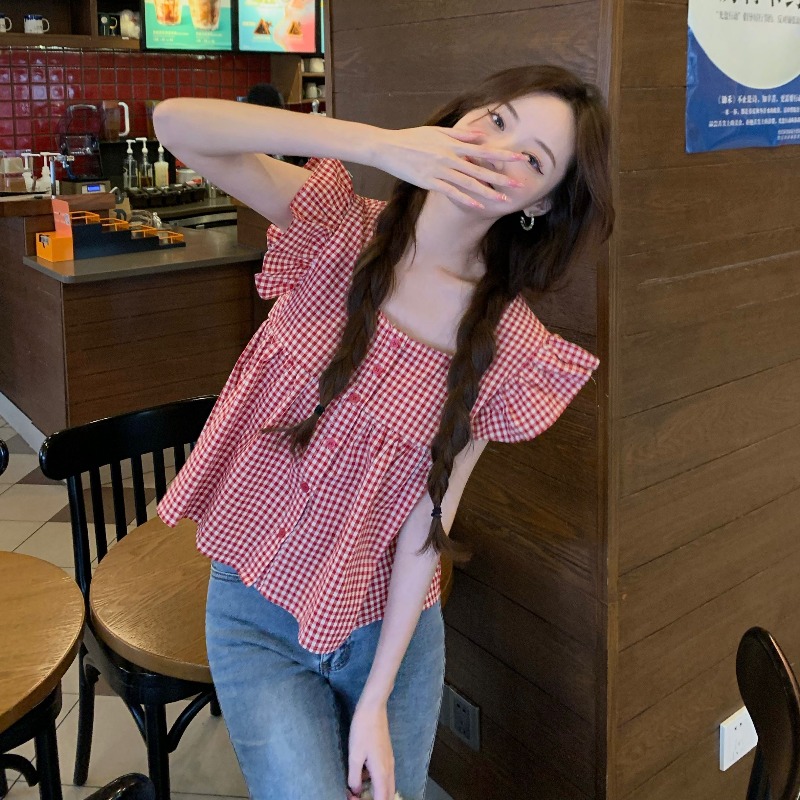法式格子方领小飞袖短袖衬衫女装夏季设计感飞飞袖小个子短款上衣