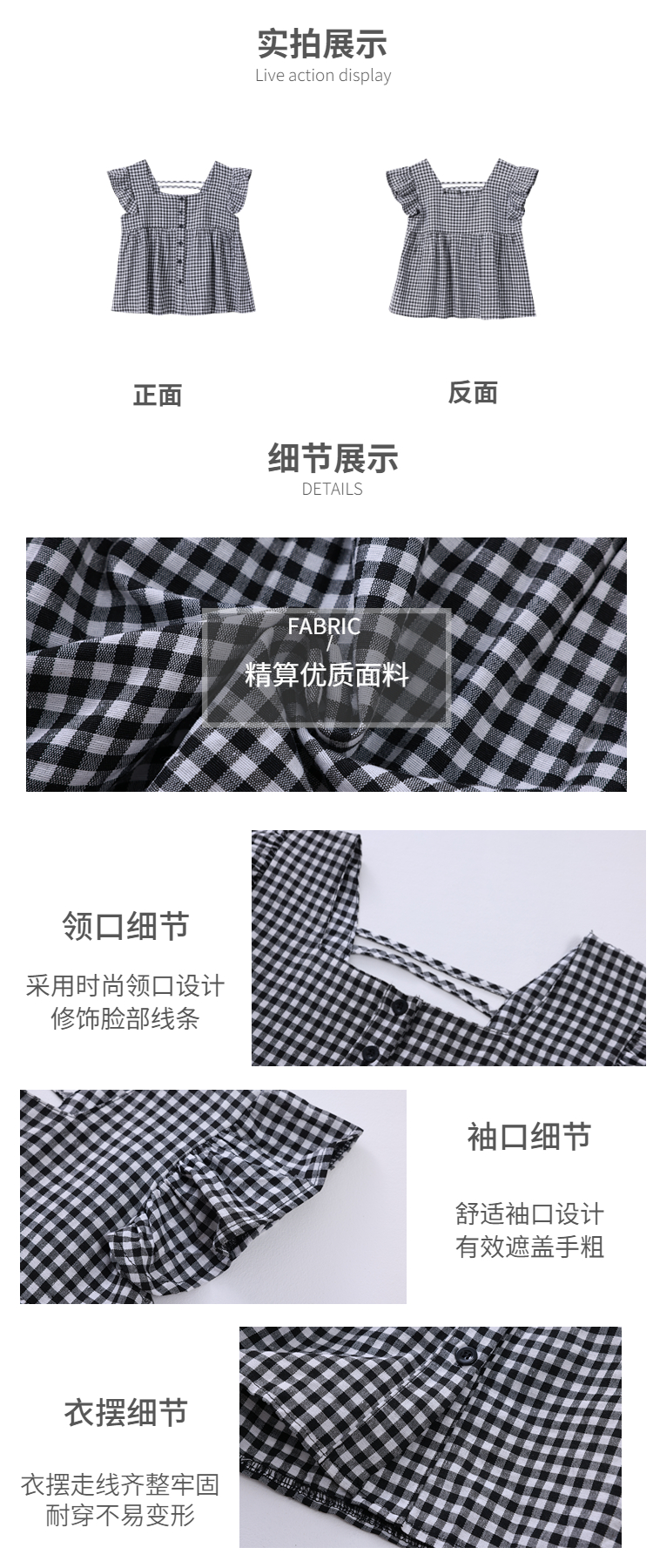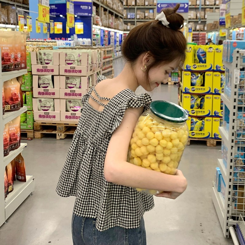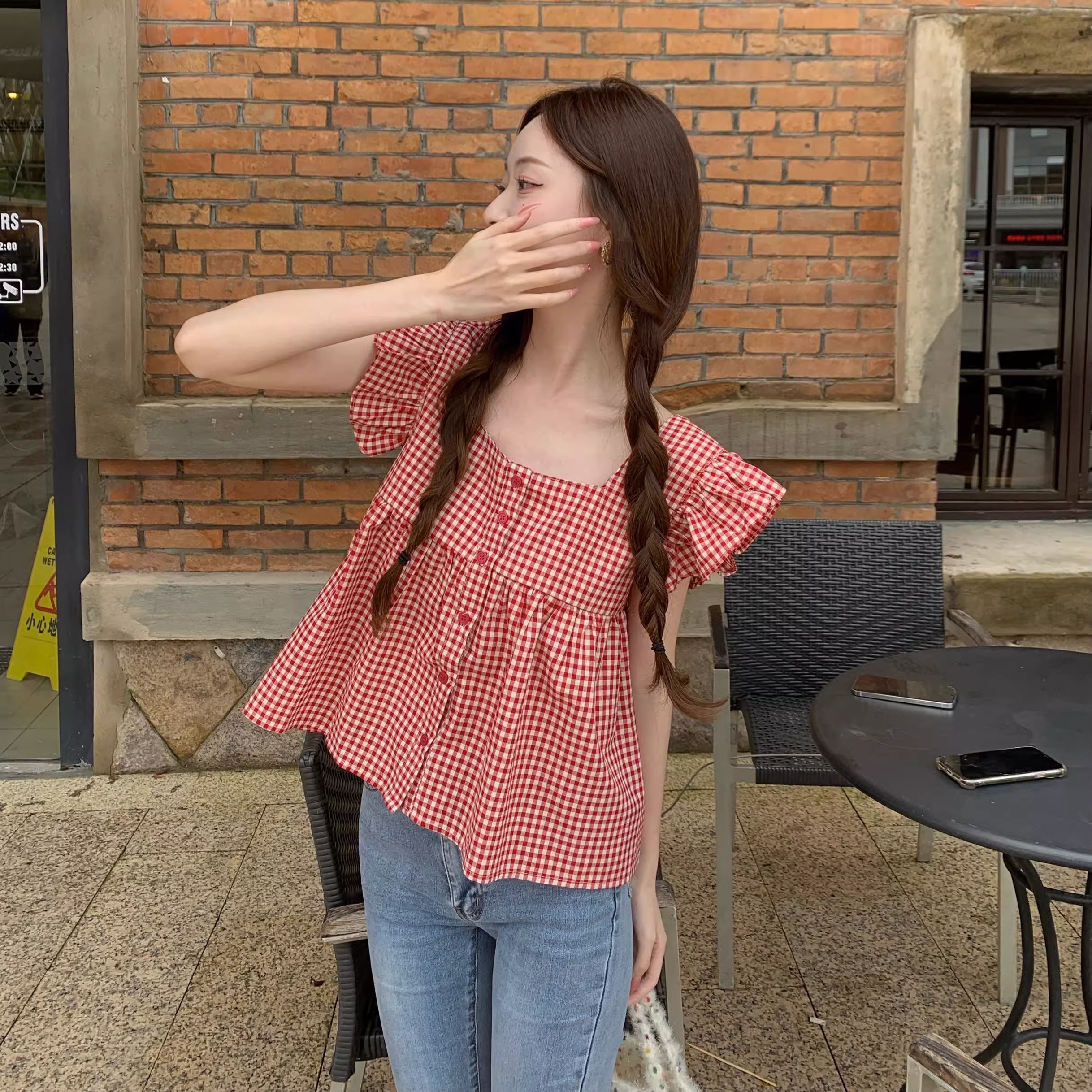 法式格子方领小飞袖短袖衬衫女装夏季设计感飞飞袖小个子短款上衣