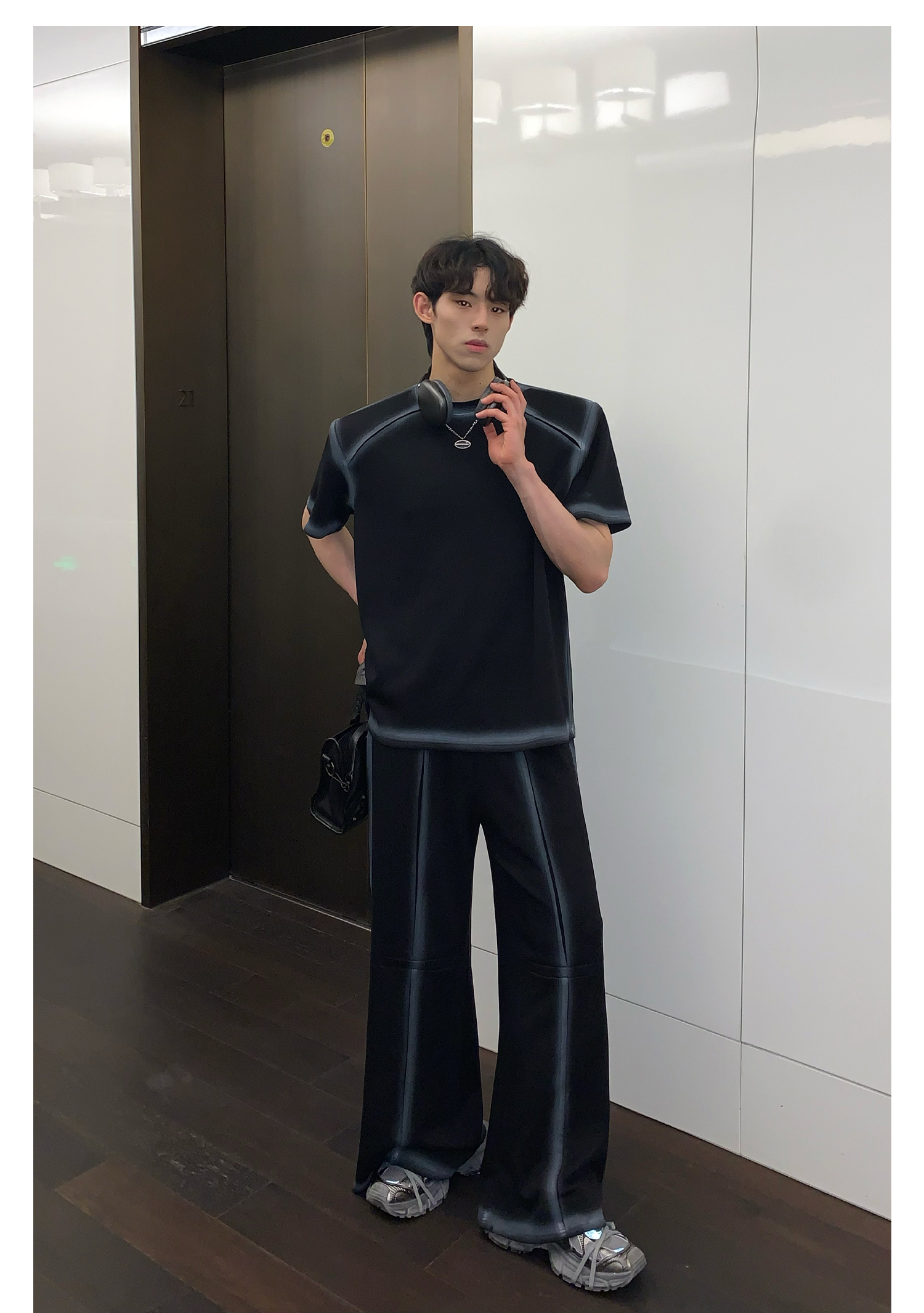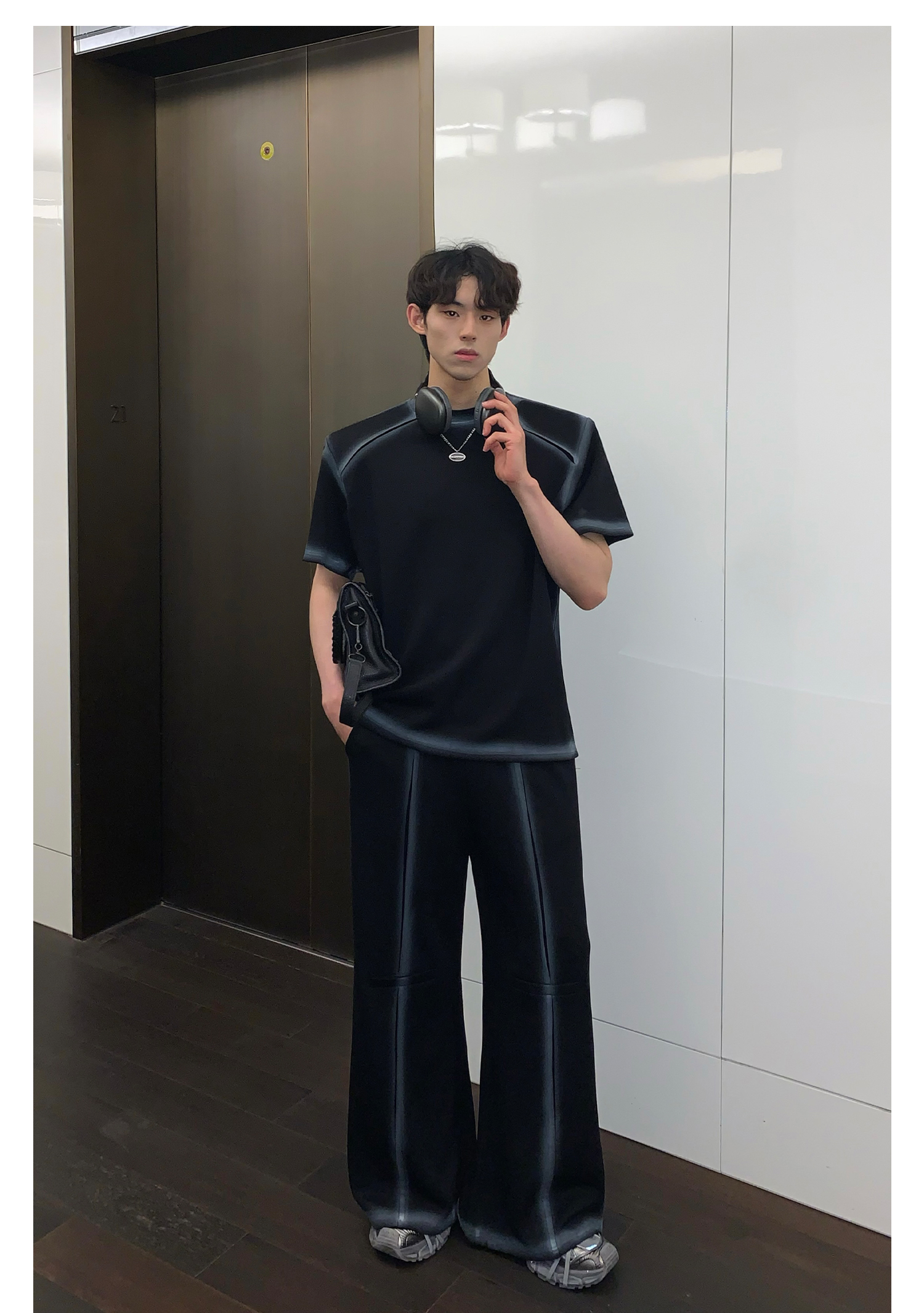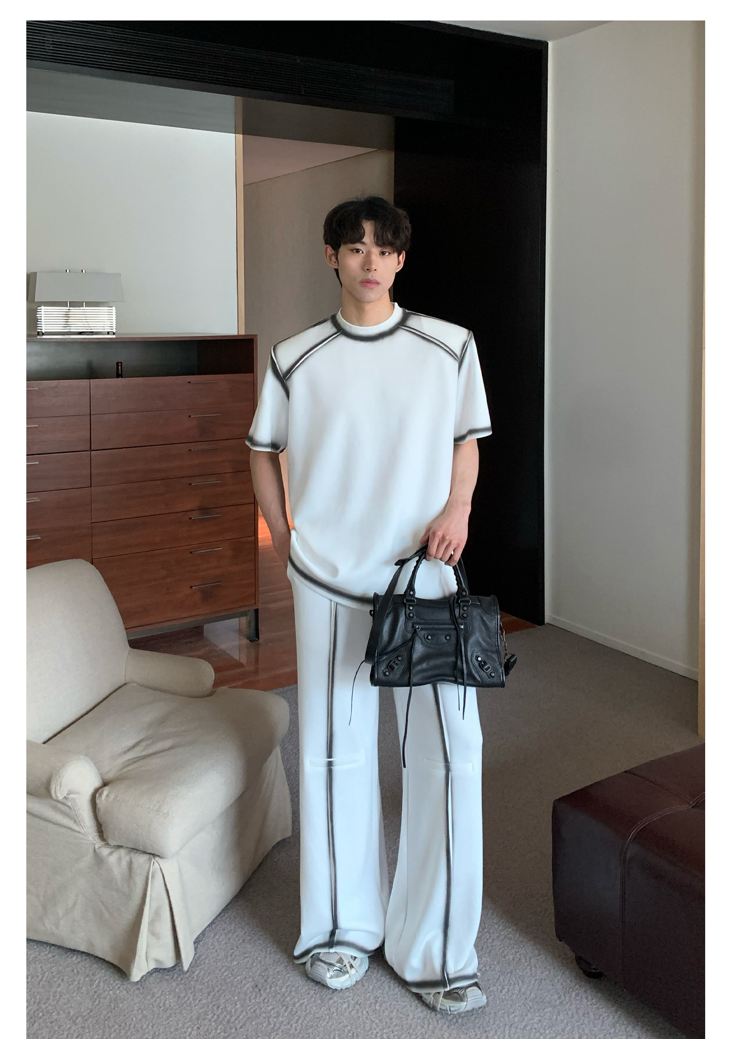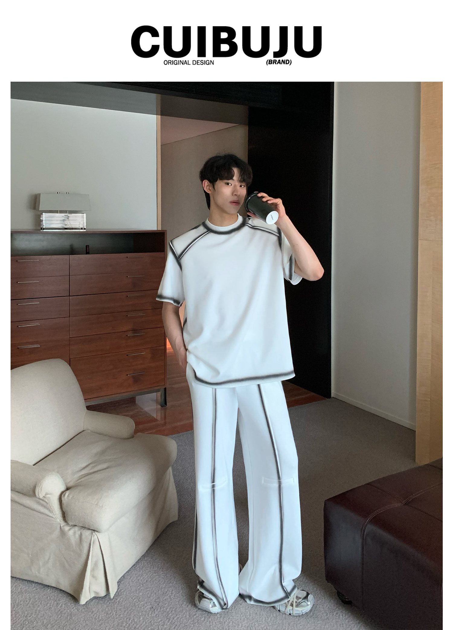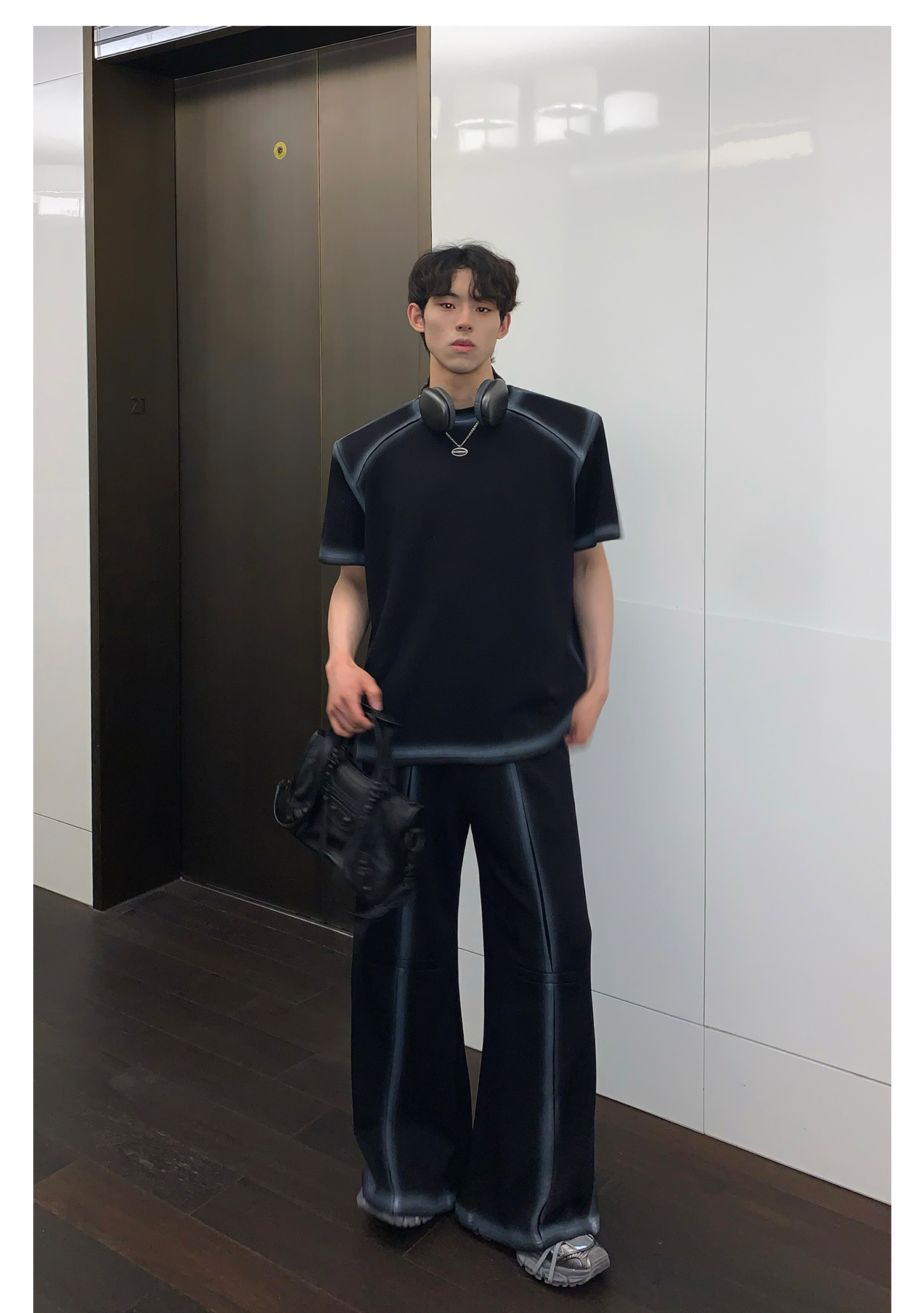 cuibuju 韩国喷染做旧设计感宽松垫肩T恤高腰 潮男休闲裤搭配套装