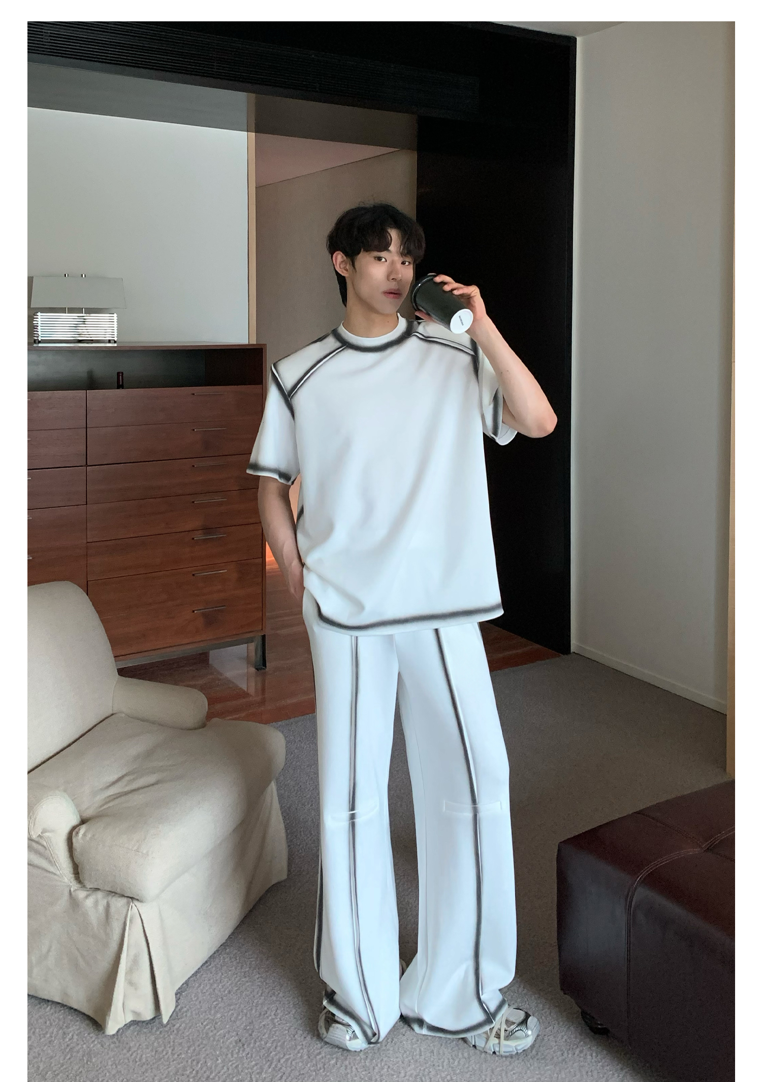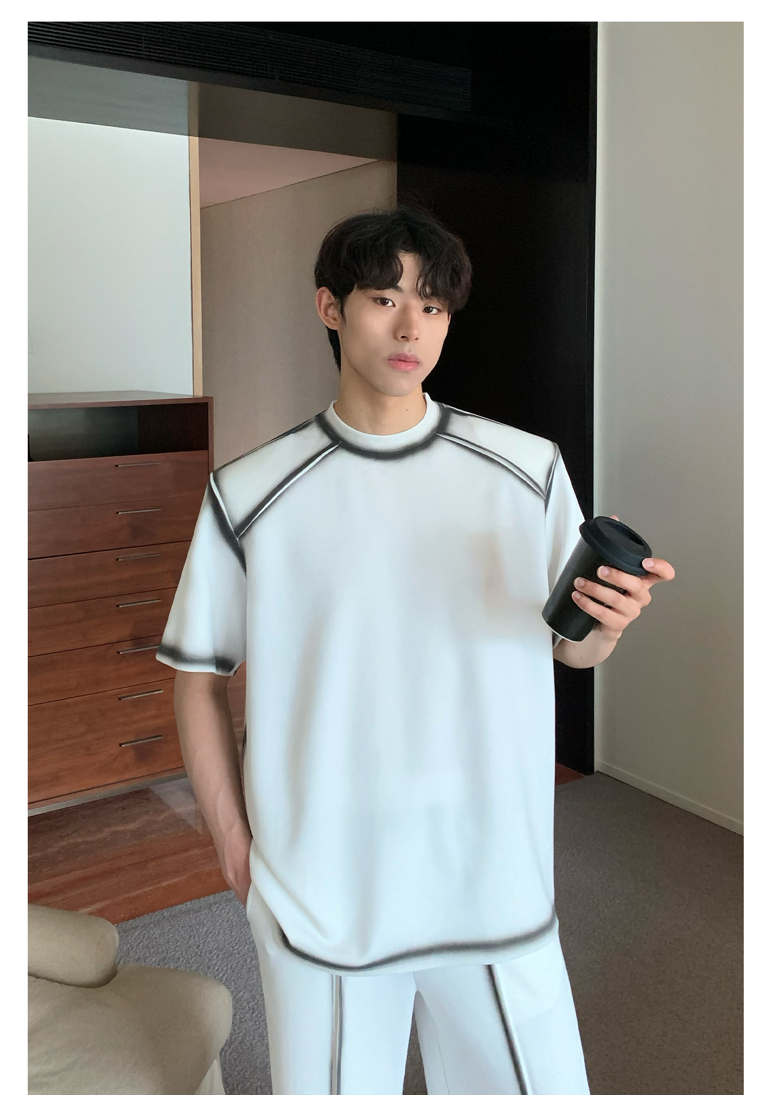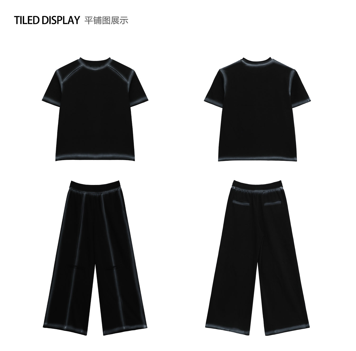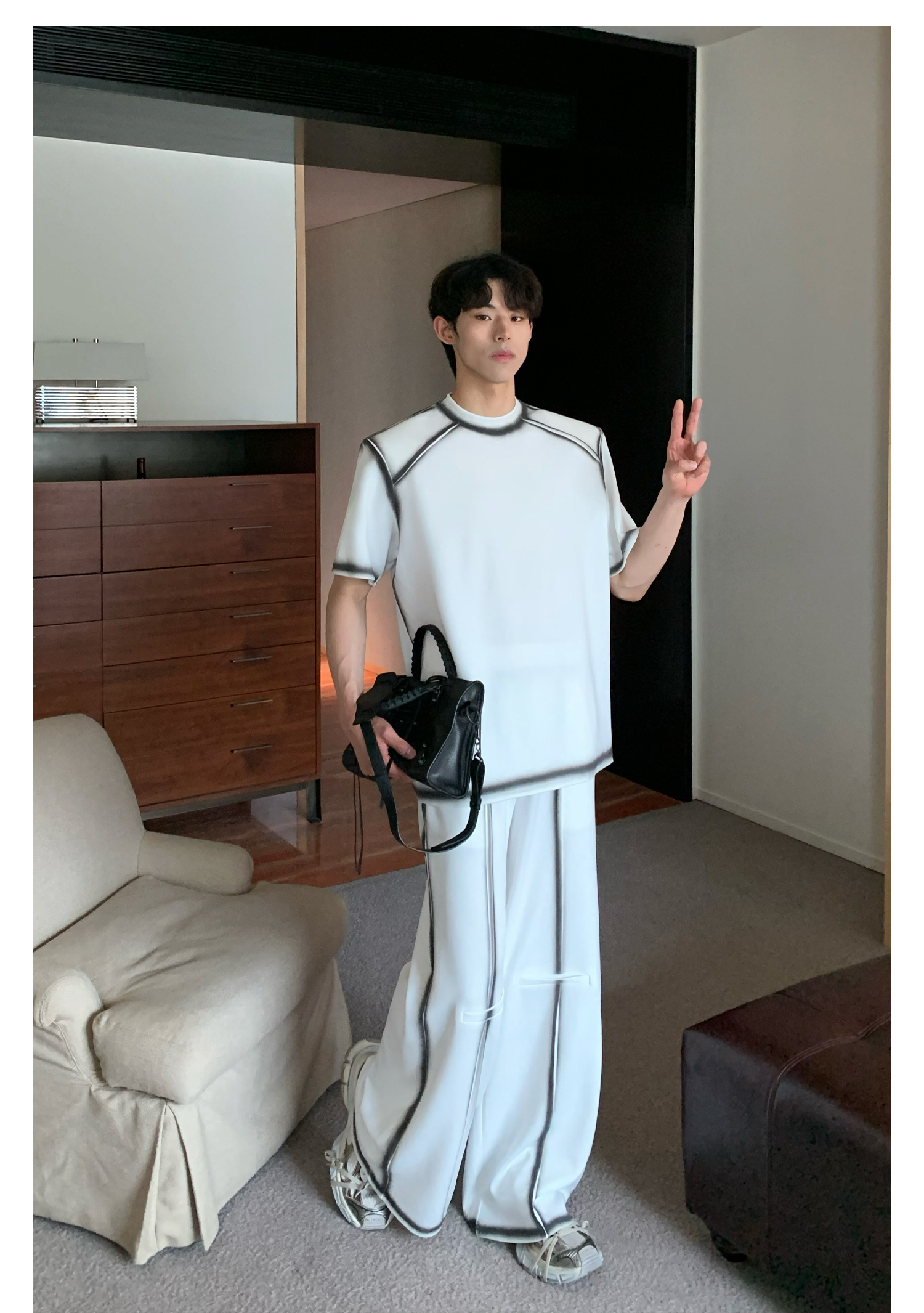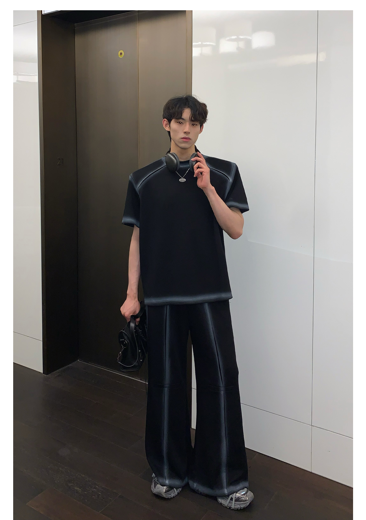 cuibuju 韩国喷染做旧设计感宽松垫肩T恤高腰 潮男休闲裤搭配套装