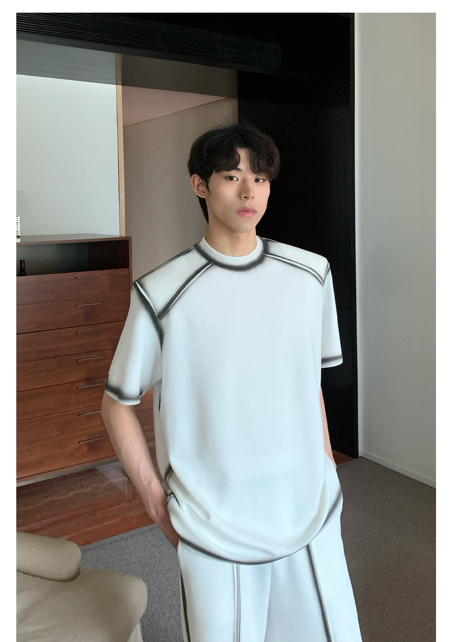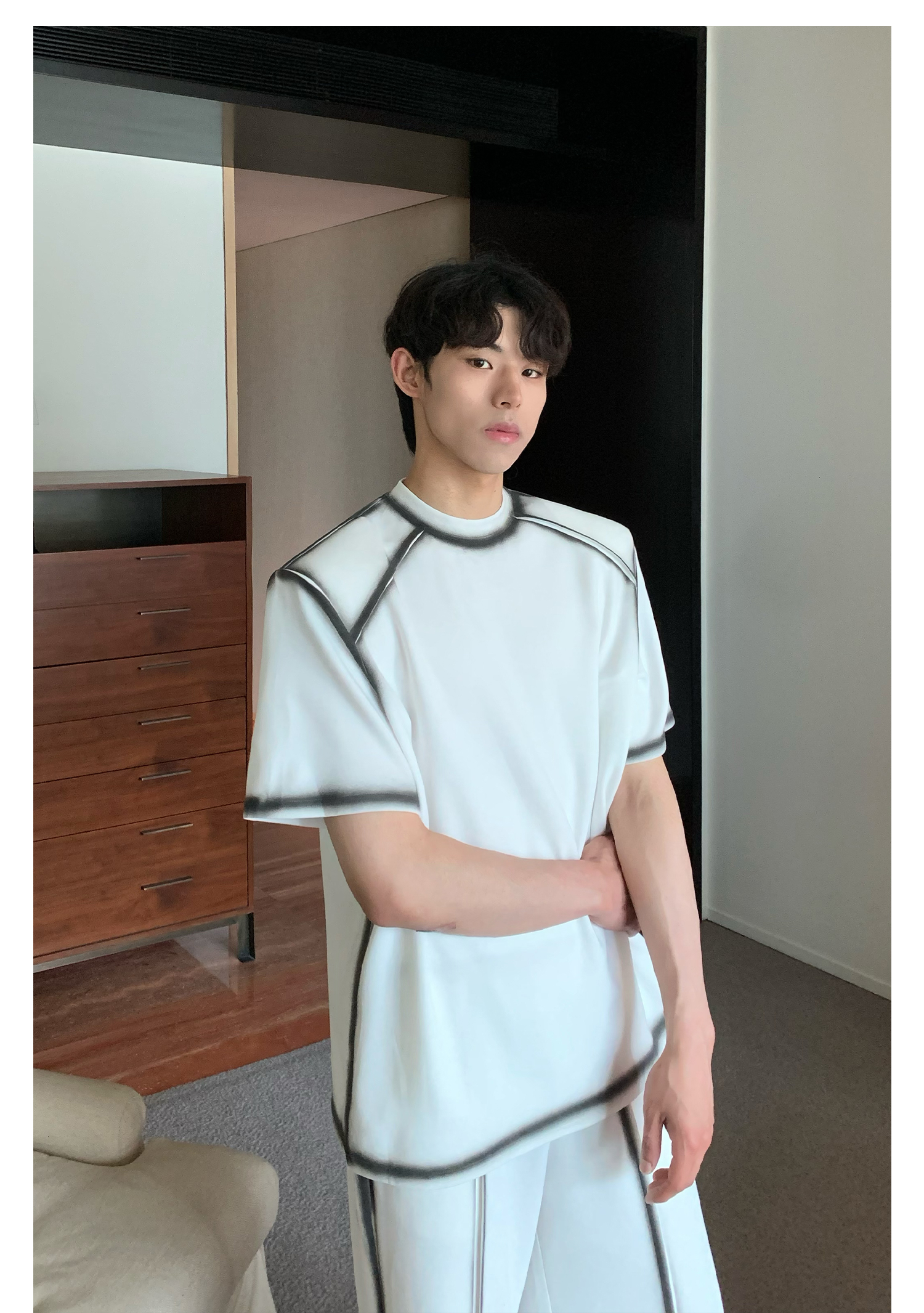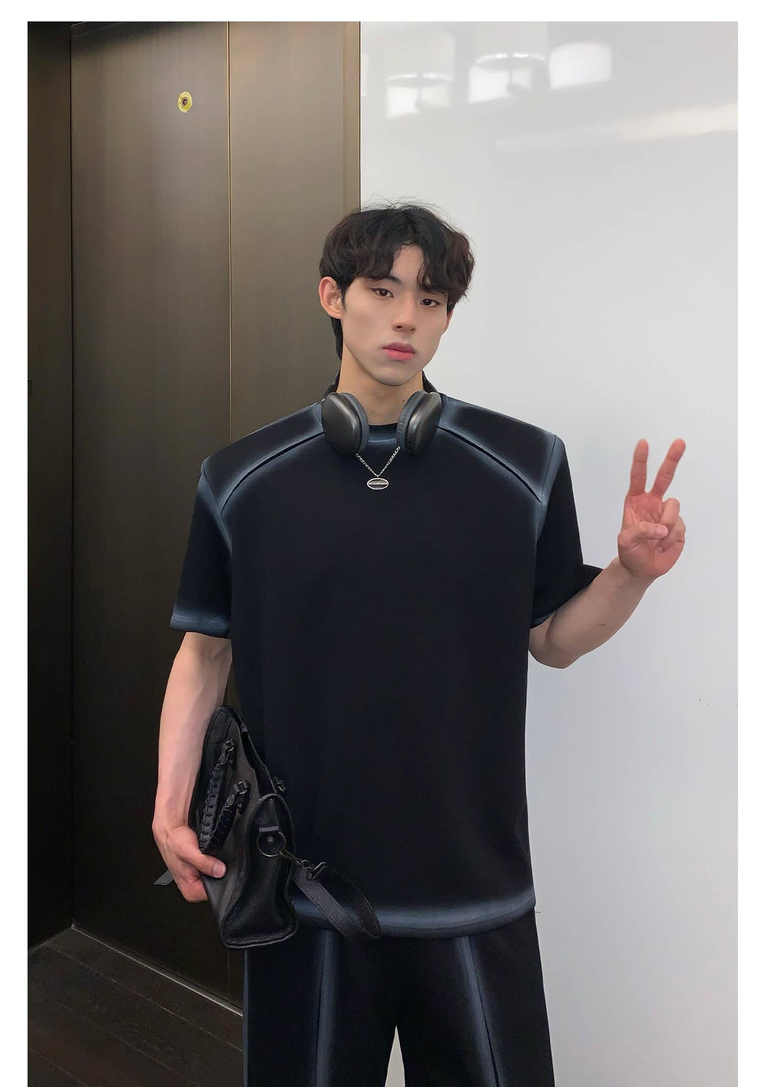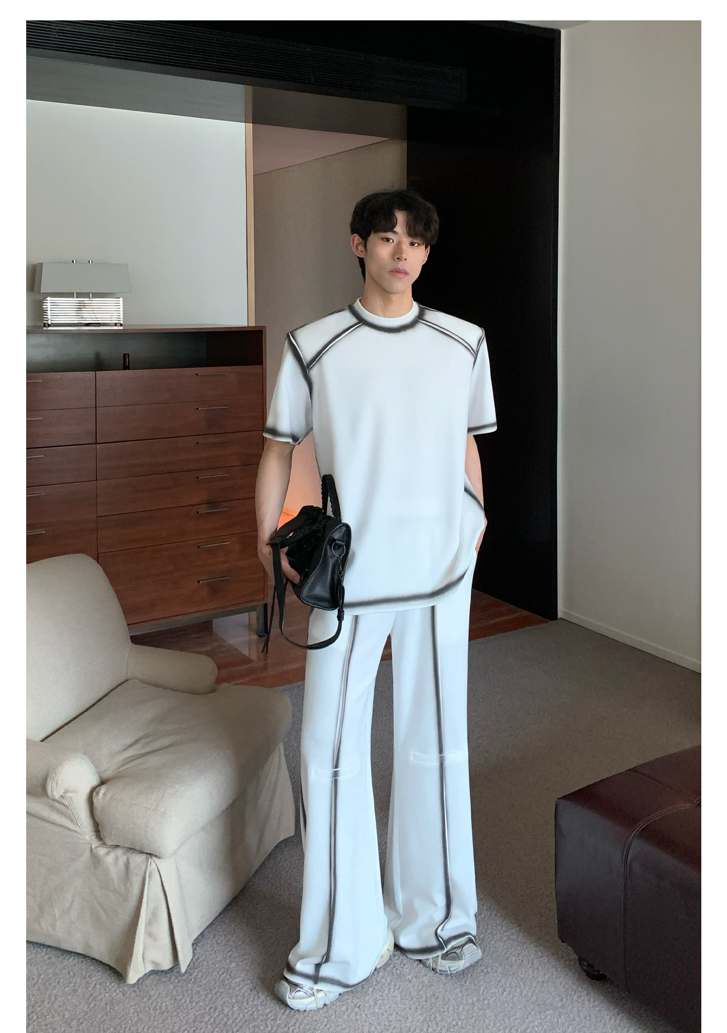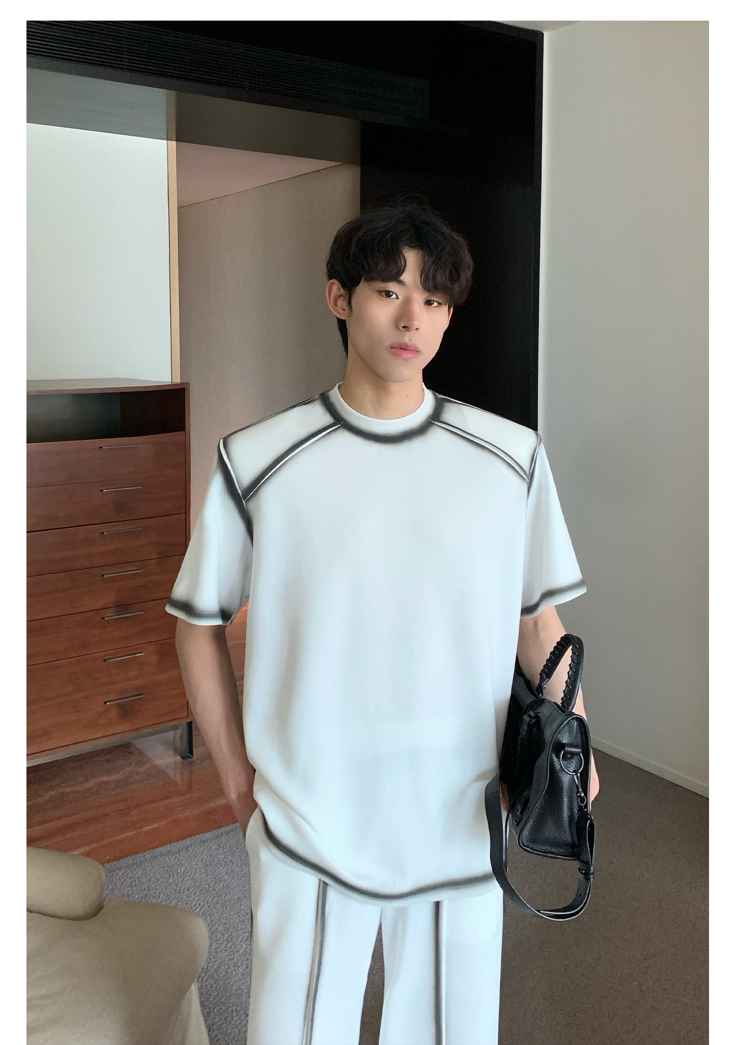 cuibuju 韩国喷染做旧设计感宽松垫肩T恤高腰 潮男休闲裤搭配套装