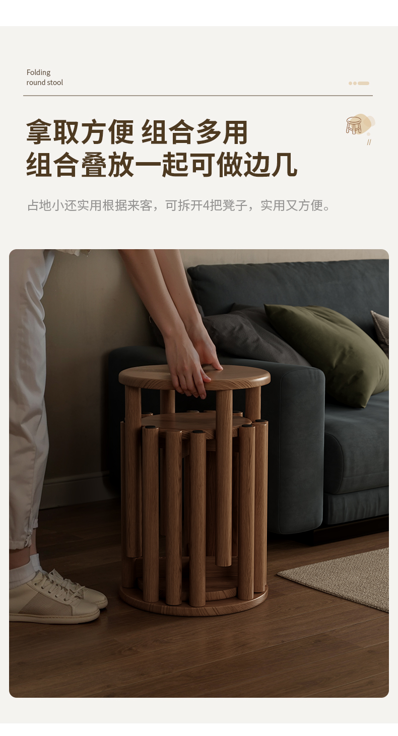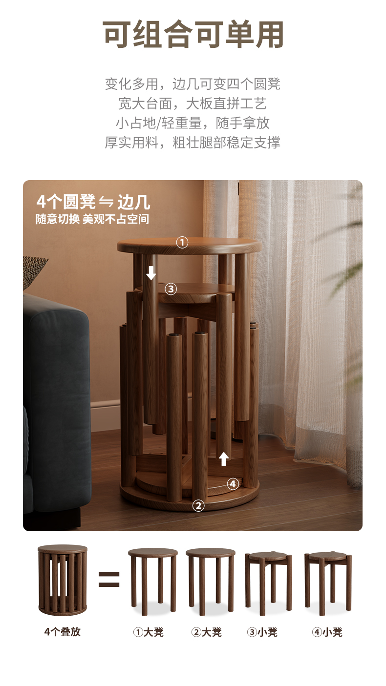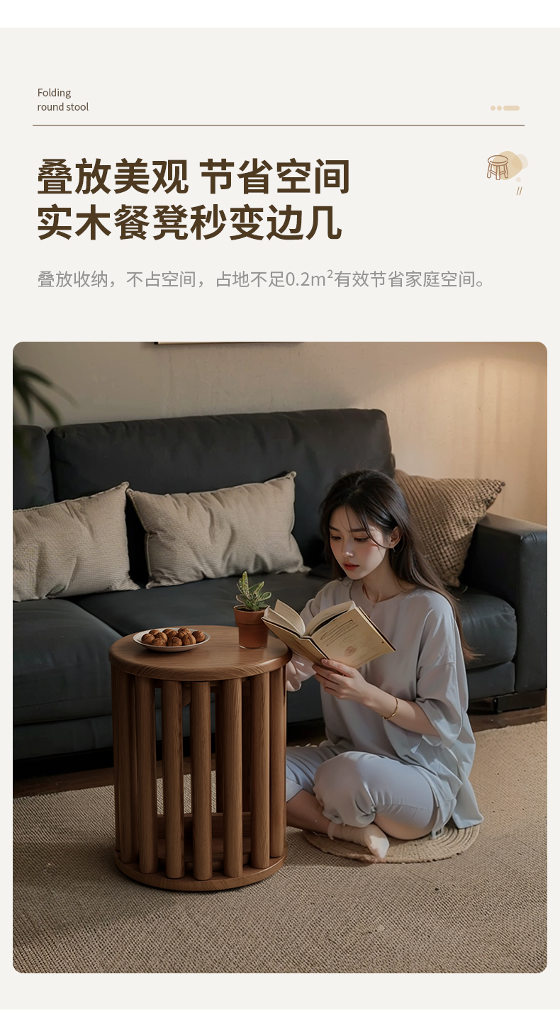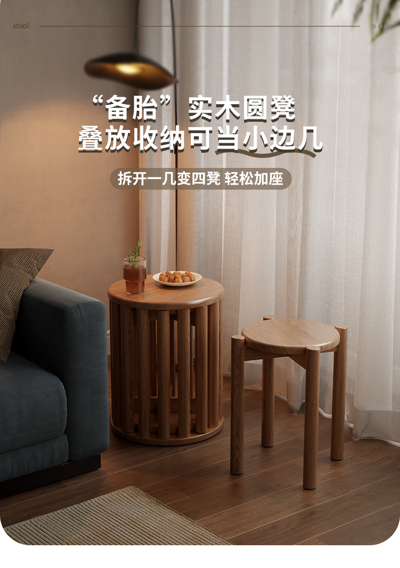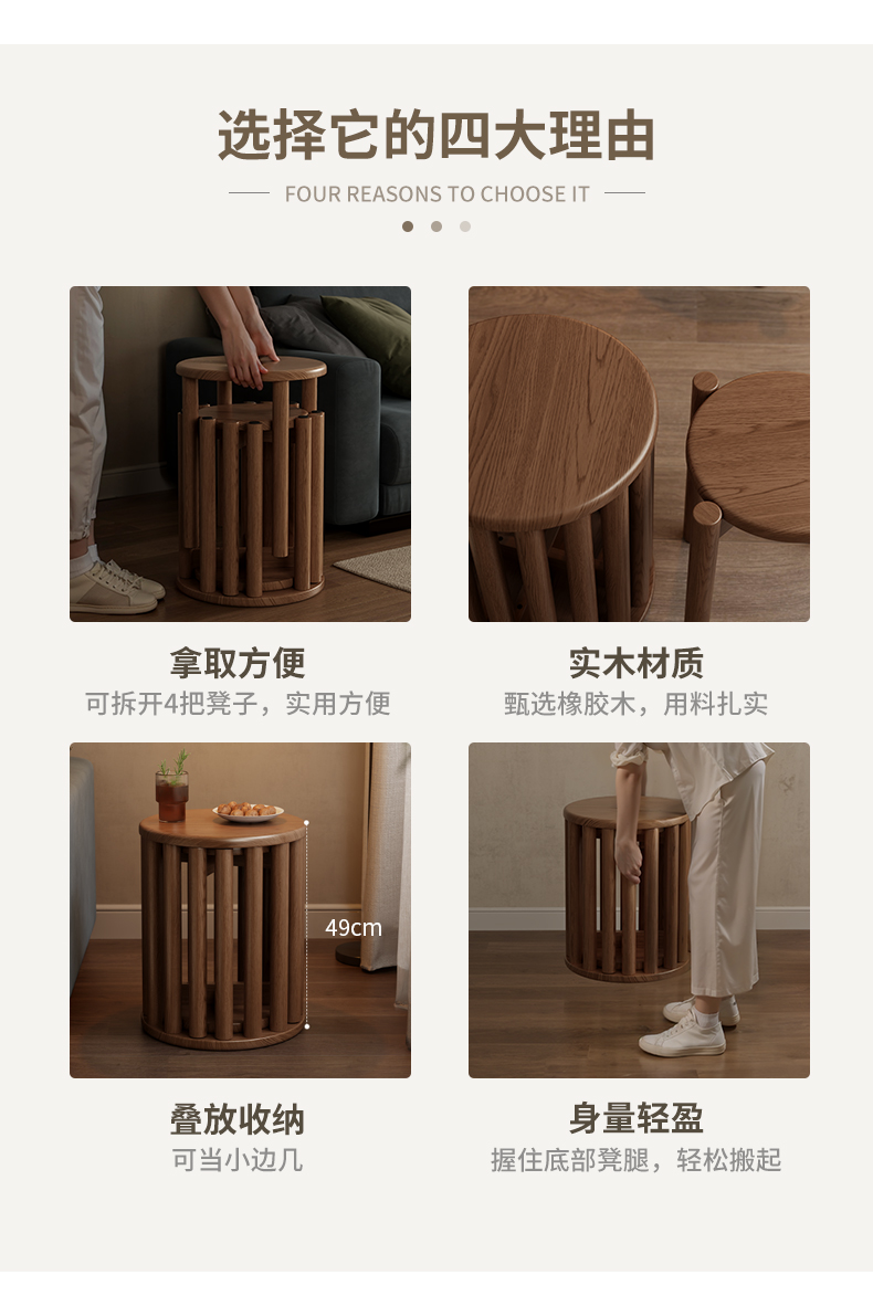 冬木实木凳子圆凳可叠放家用矮凳客厅多功能组合边几餐桌凳叠叠乐