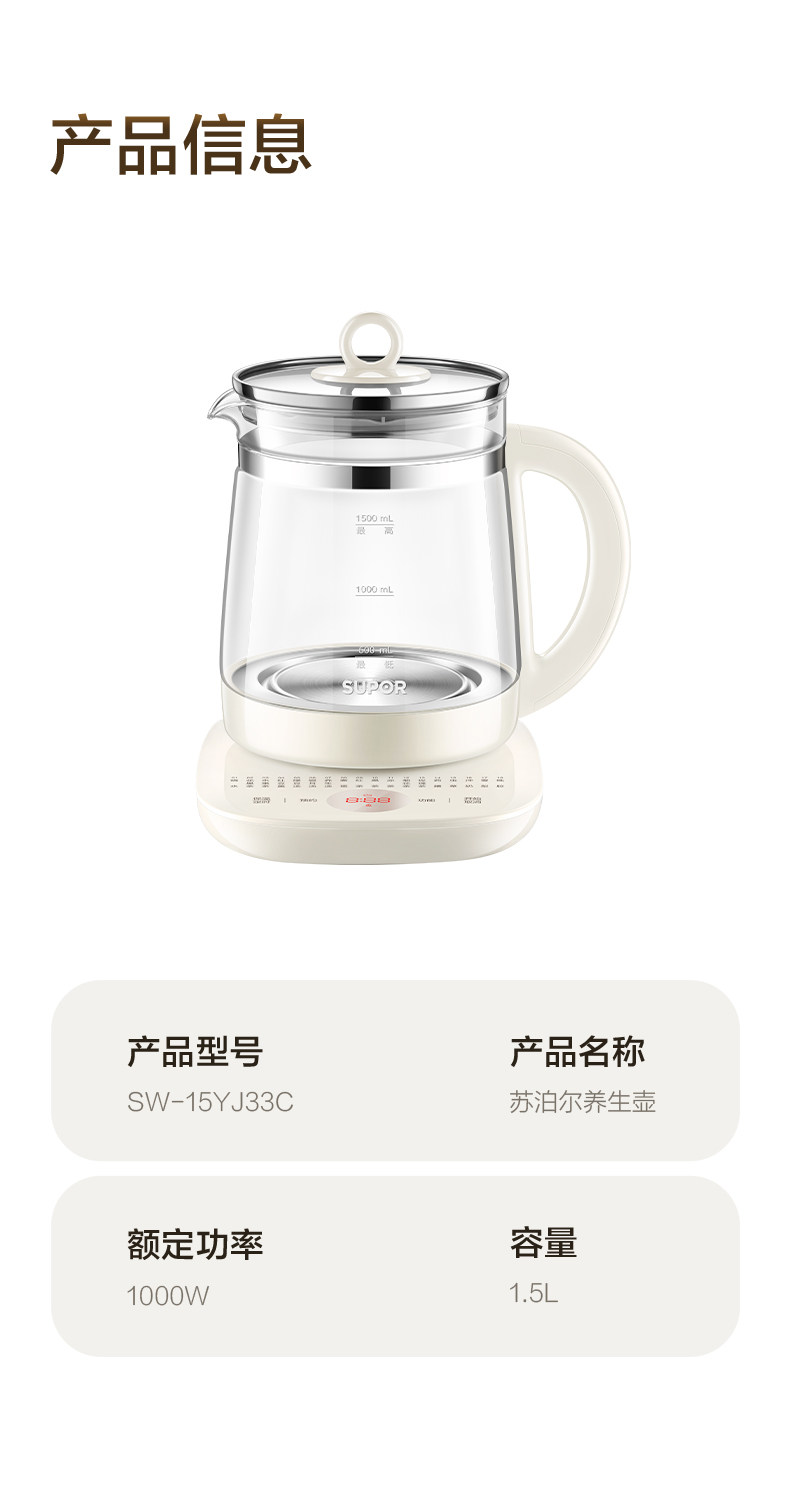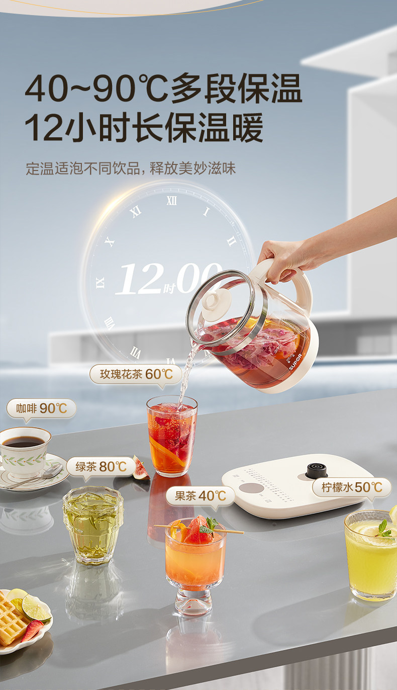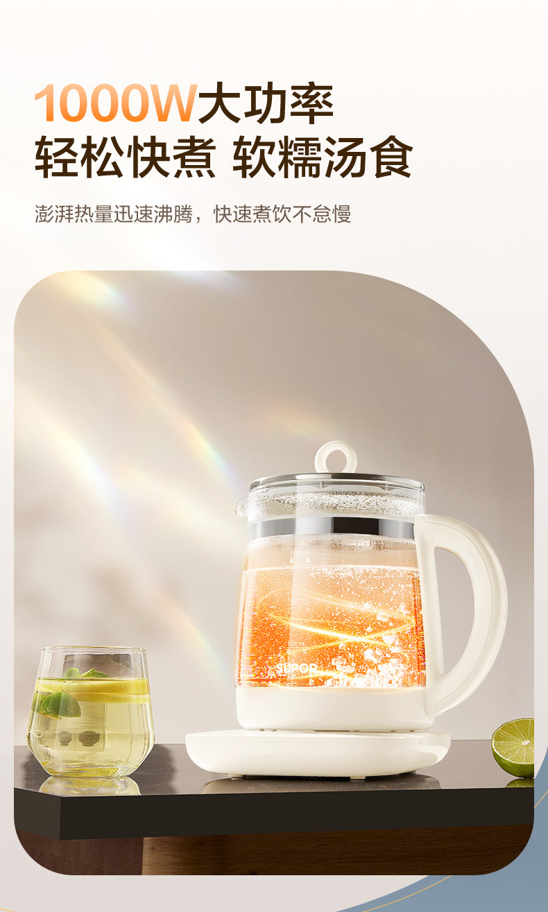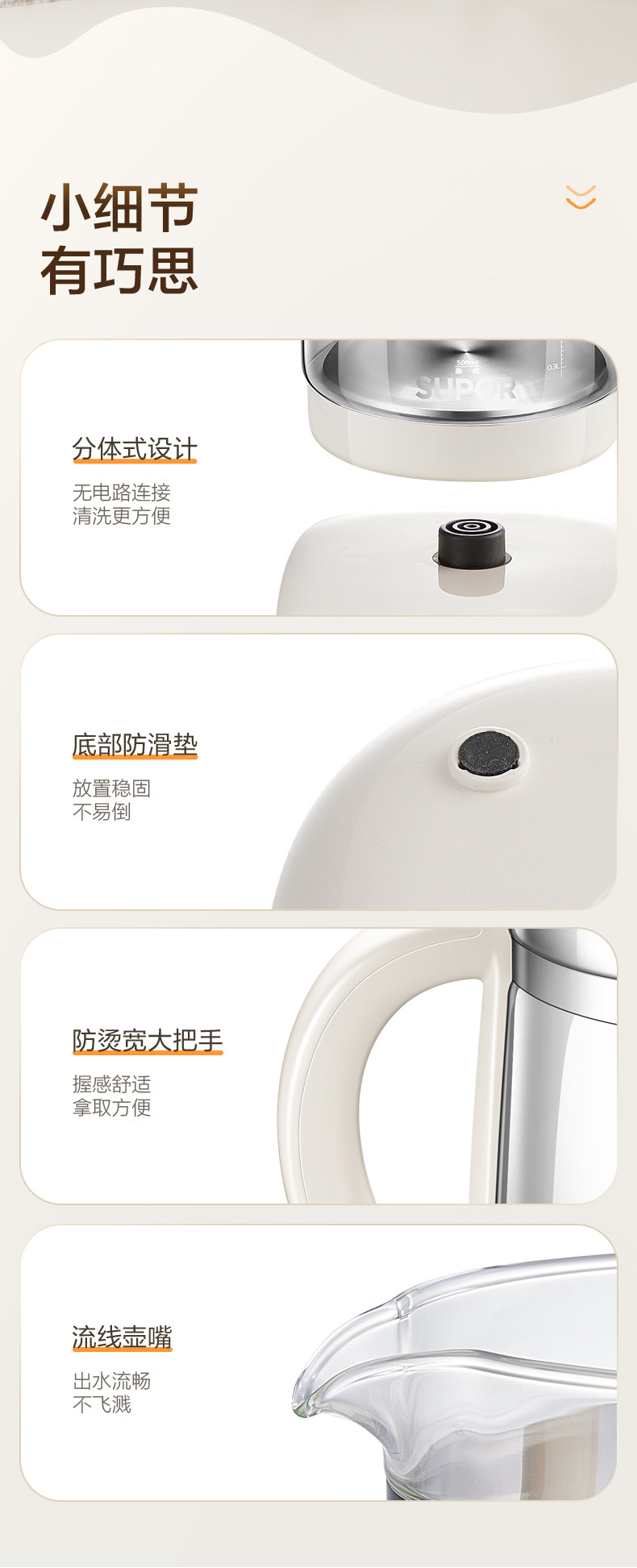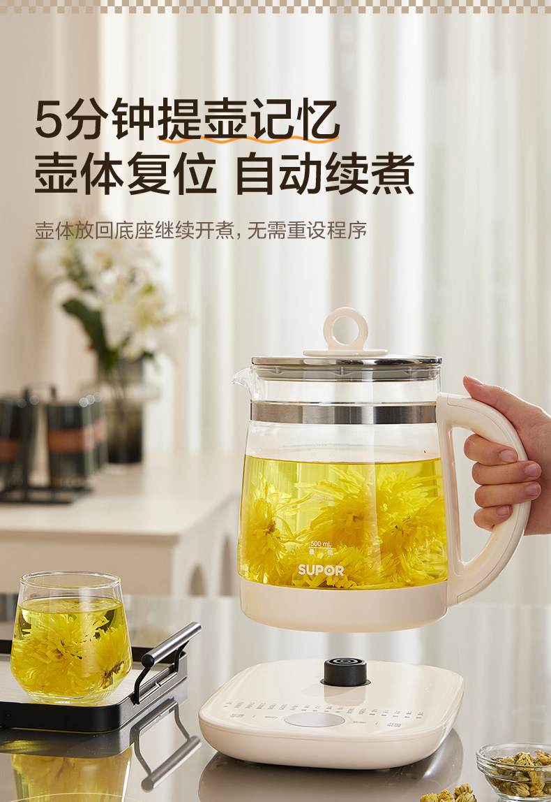 苏泊尔养生壶 米白色高硼硅玻璃体 微电脑触控式煮茶壶 220V办公室小型家用