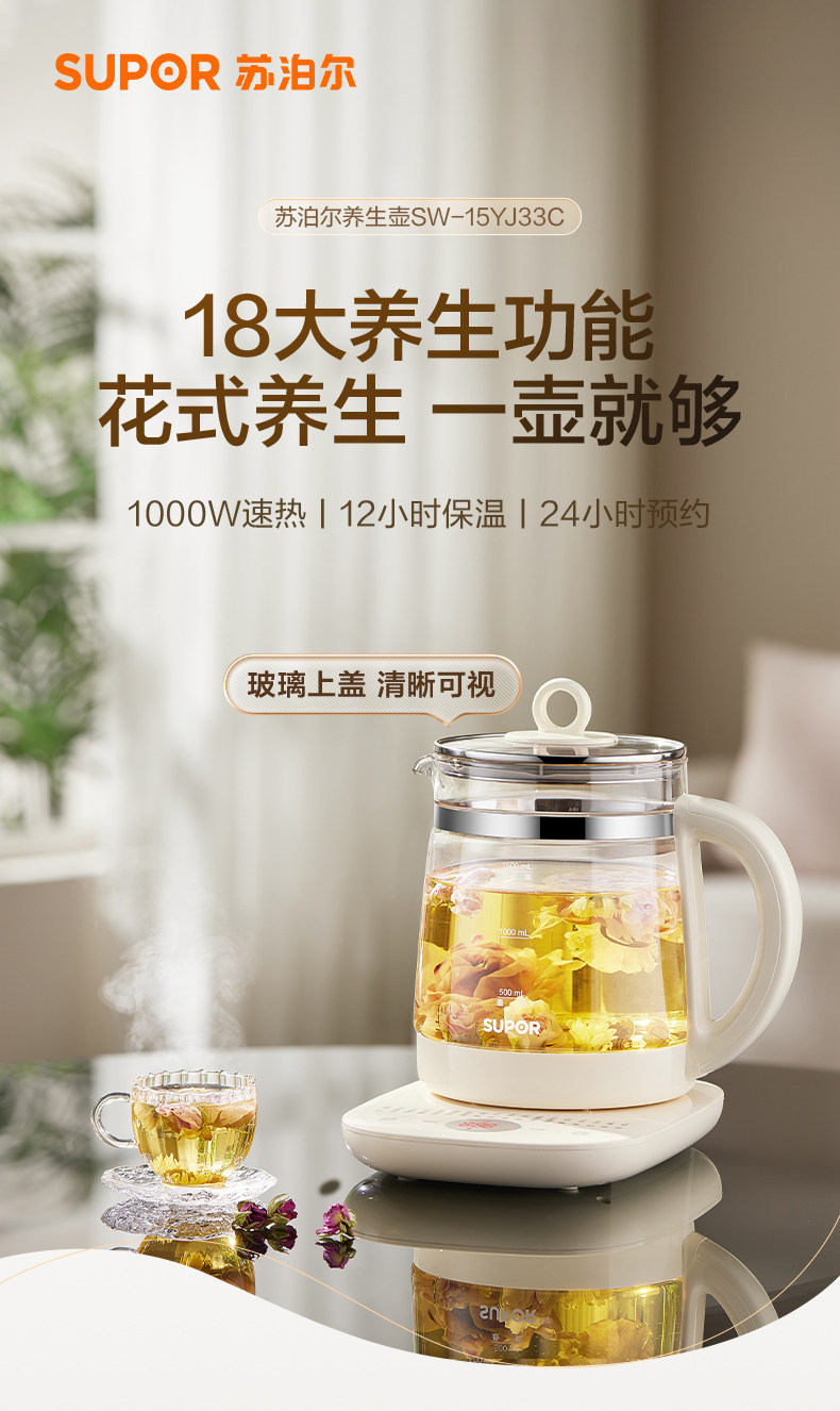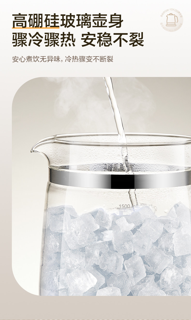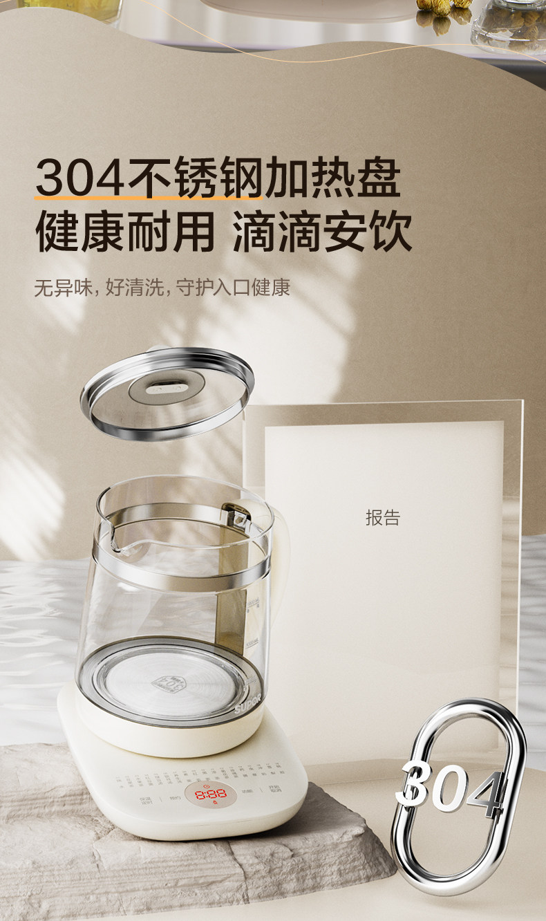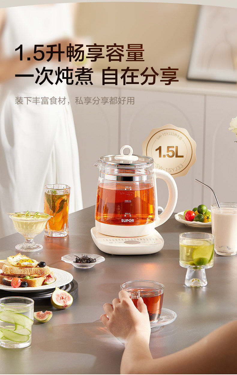 苏泊尔养生壶 米白色高硼硅玻璃体 微电脑触控式煮茶壶 220V办公室小型家用