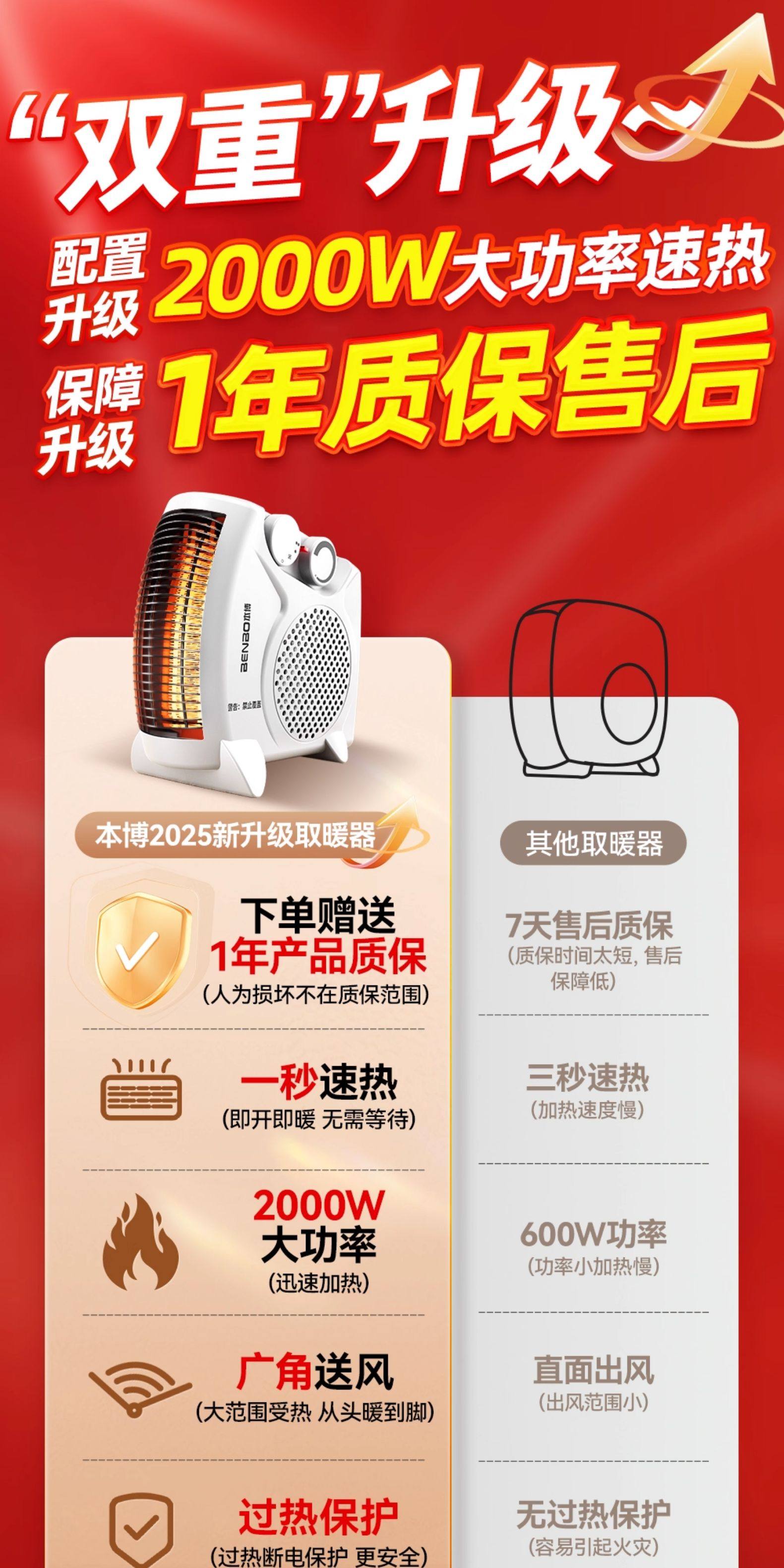 德国本博取暖器暖风机家用电暖气小太阳节能省电电热烤火炉热风机