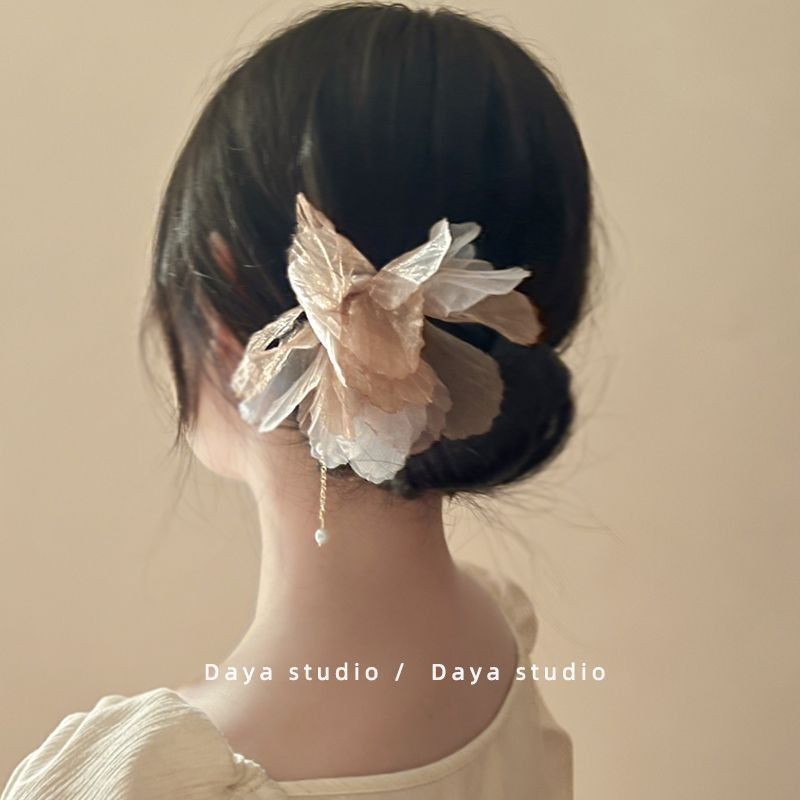 一只枯叶蝶!雪纺花朵珠发簪!气质流苏U形盘发发钗新中式盘发簪子